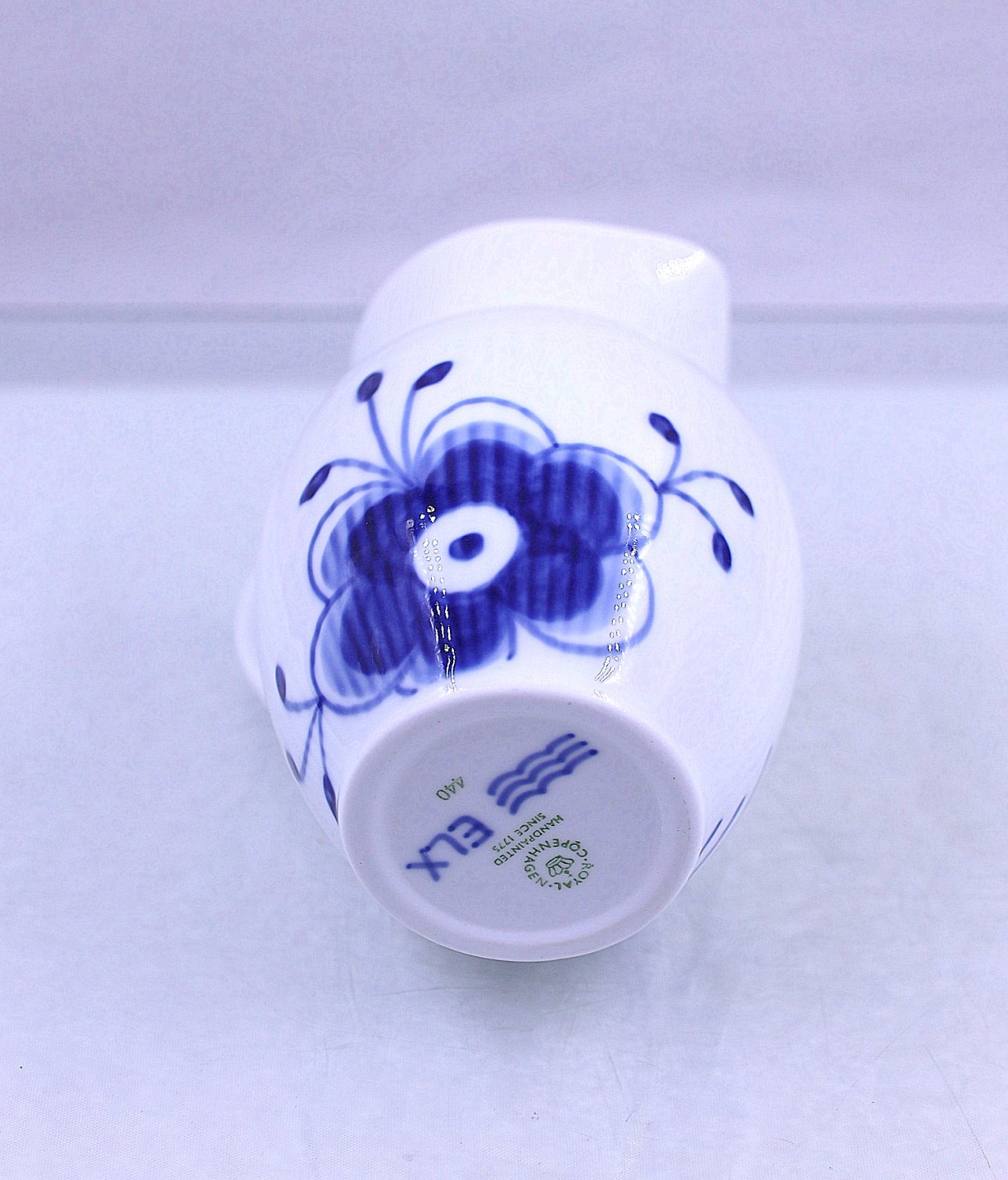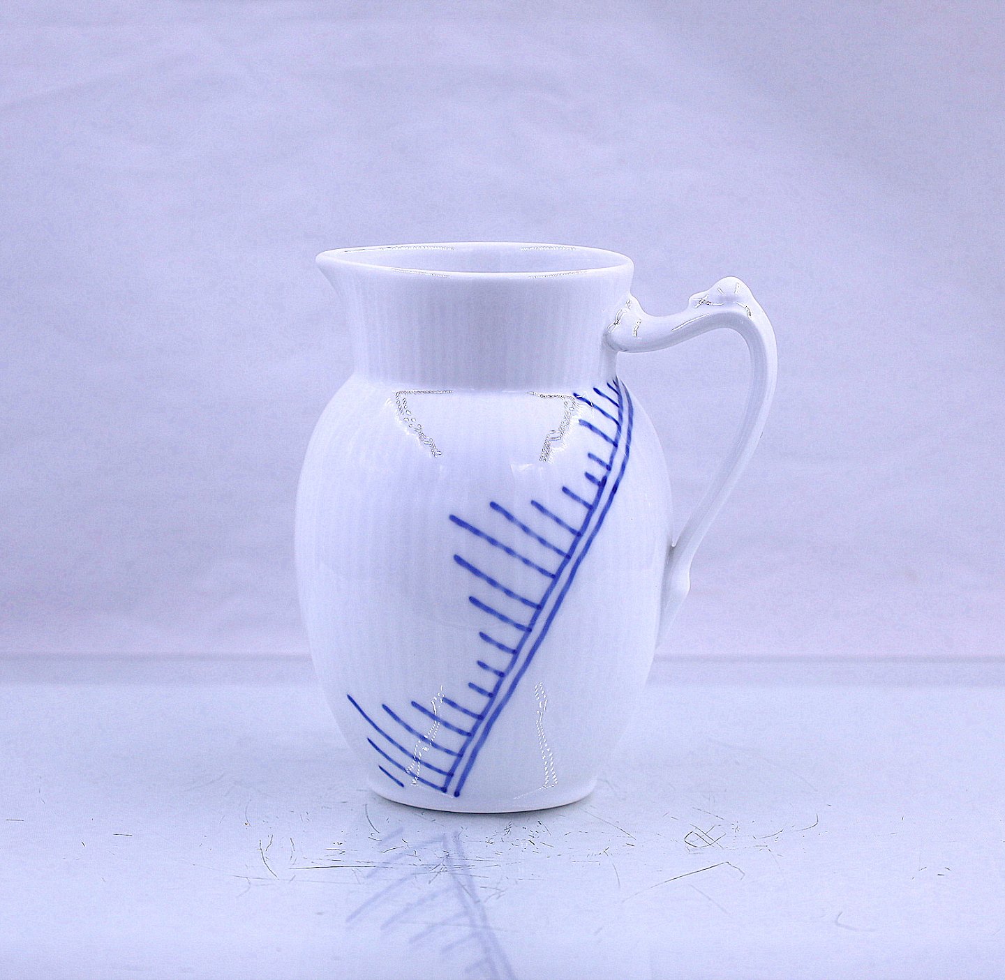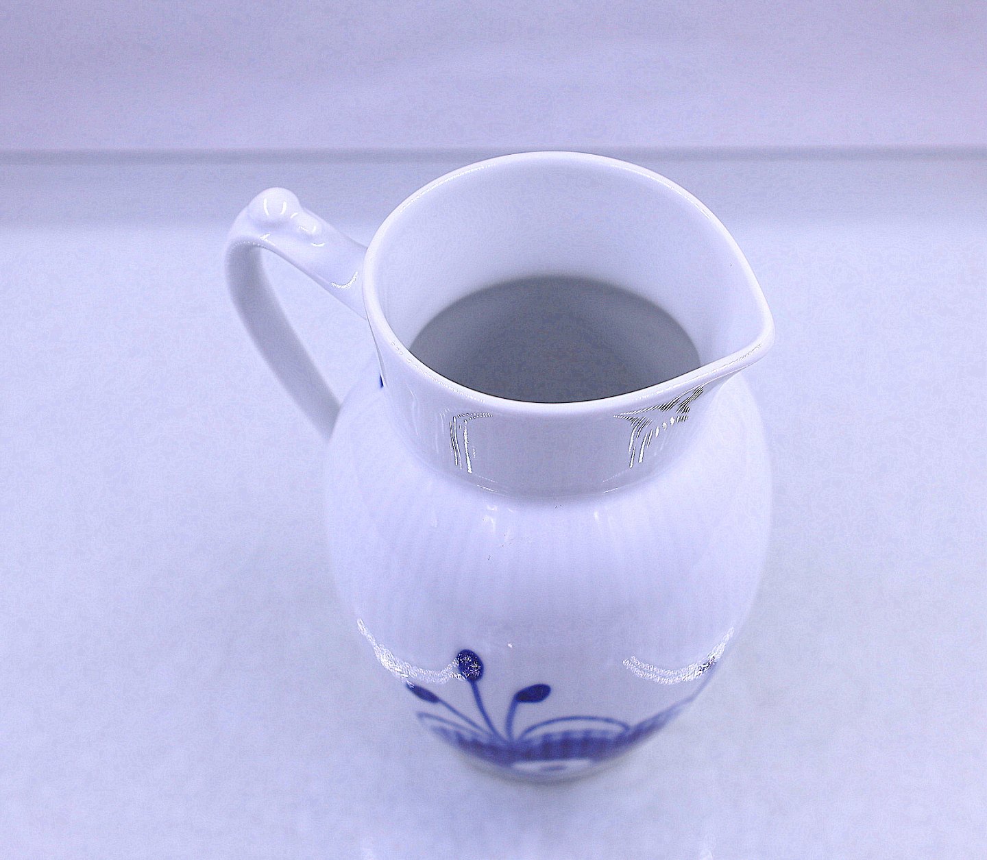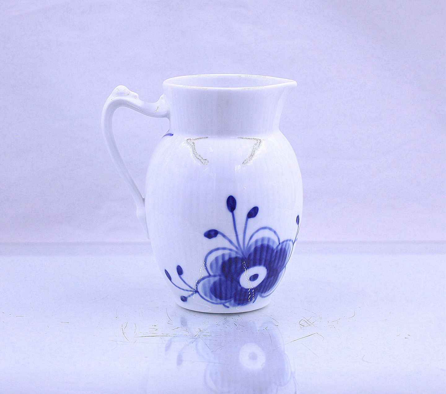 Royal Copenhagen. Mega musselmalet flødekande nr. 440, kanden kan indeholde 38cl. Mega musselmalet er i de klassiske hvide og blå farver. Blåt mega riflet