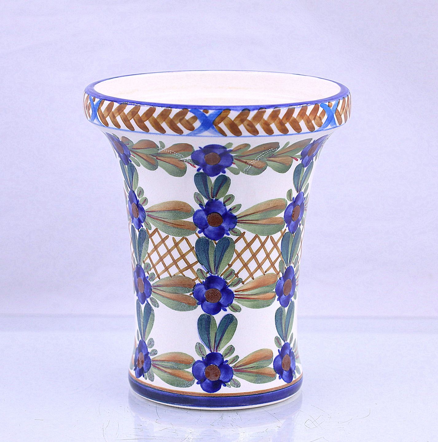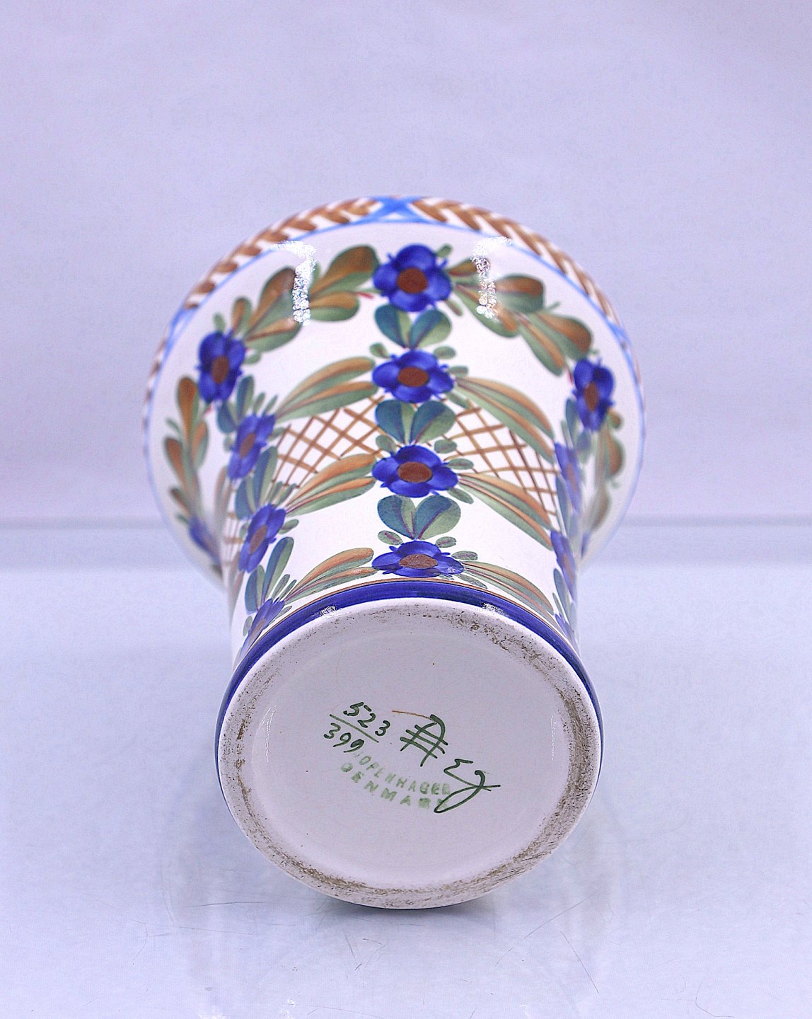 Aluminia, vase nr. 523/399. kunstfajance vase dekoreret med blå blomster og grønne/brune blade, på cremefarvet baggrund. Glasuren er polykrom