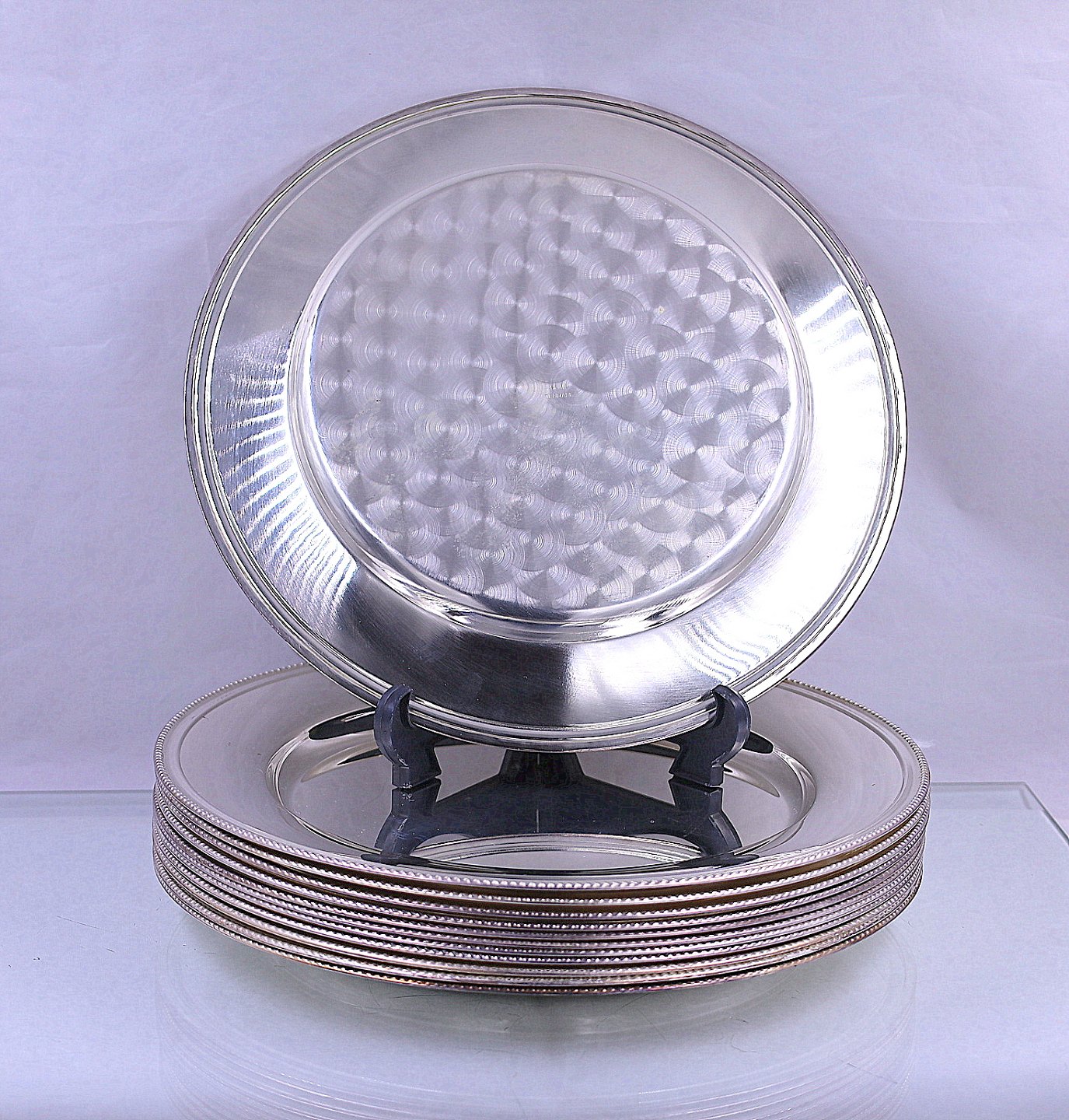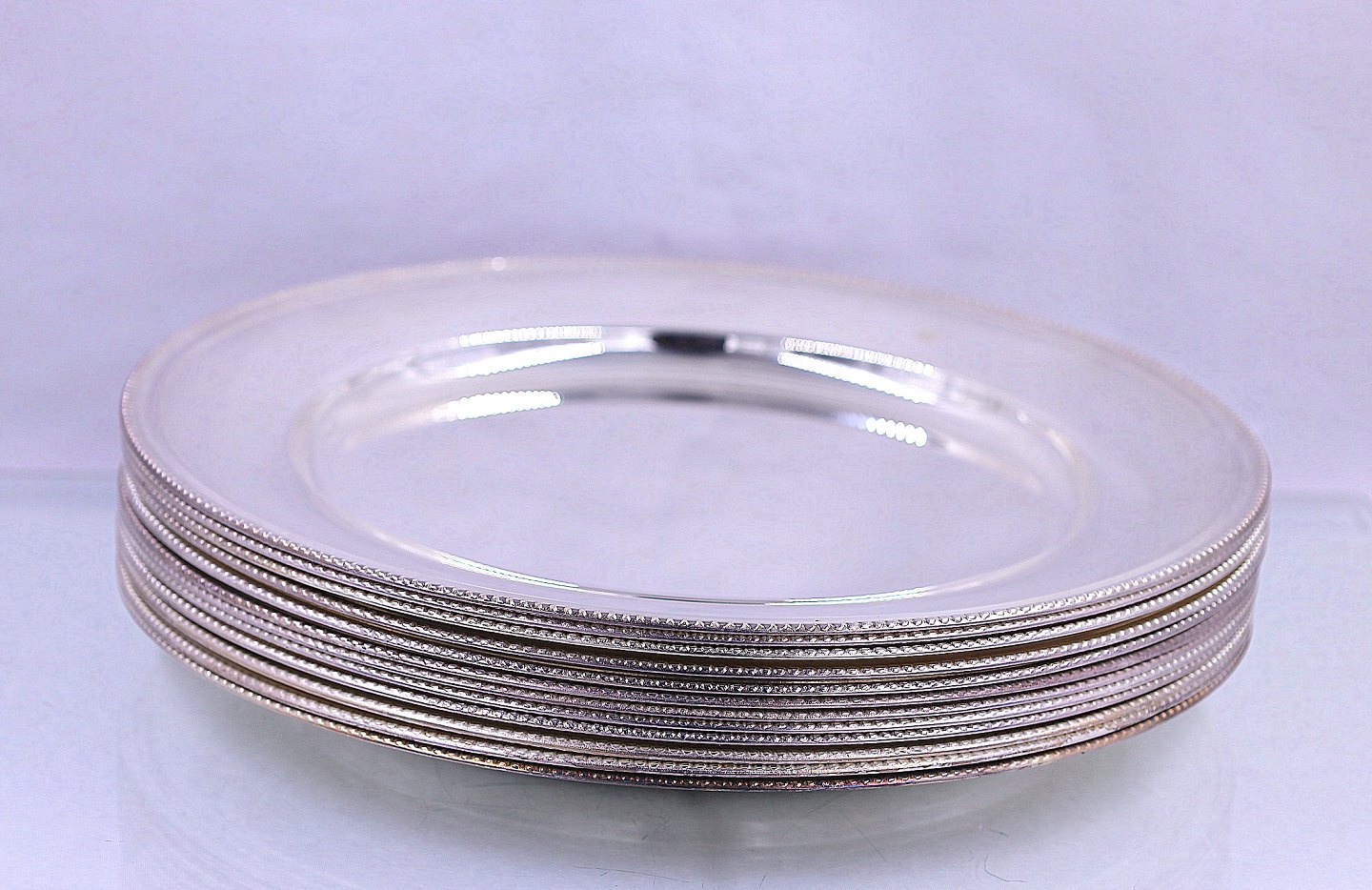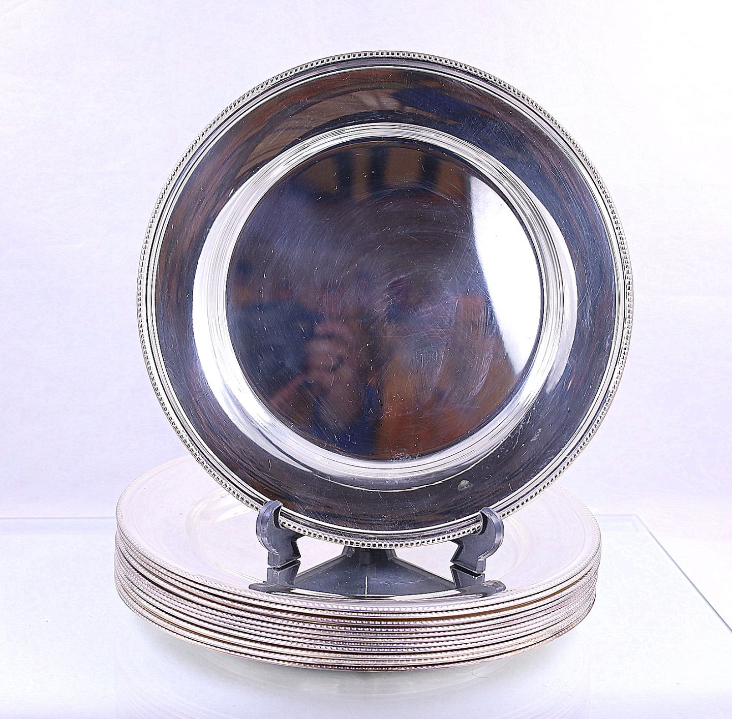 12 Dækketallerken med Perlekant. Tallerkenerne er af pletsølv og er i pæn stand.