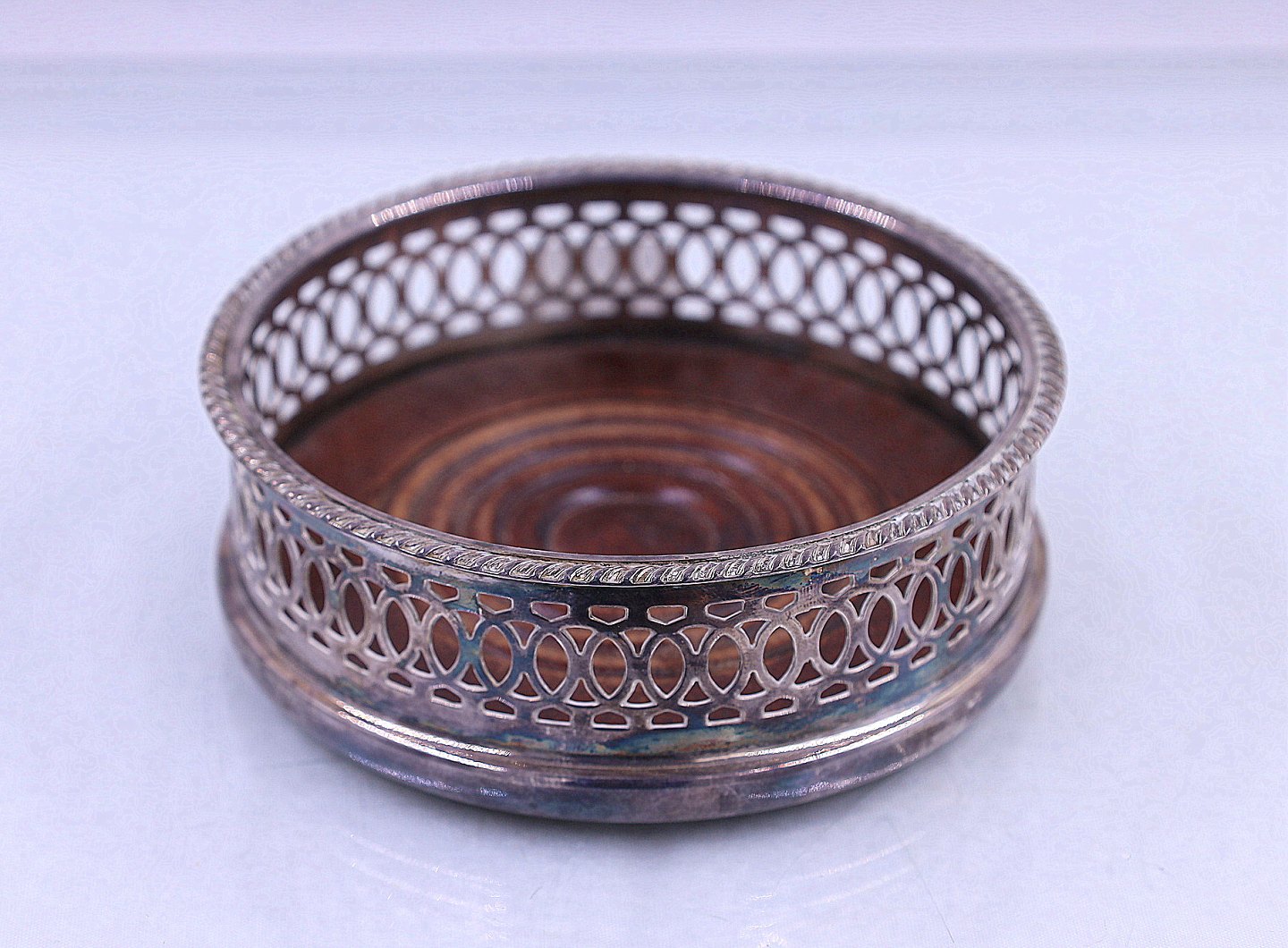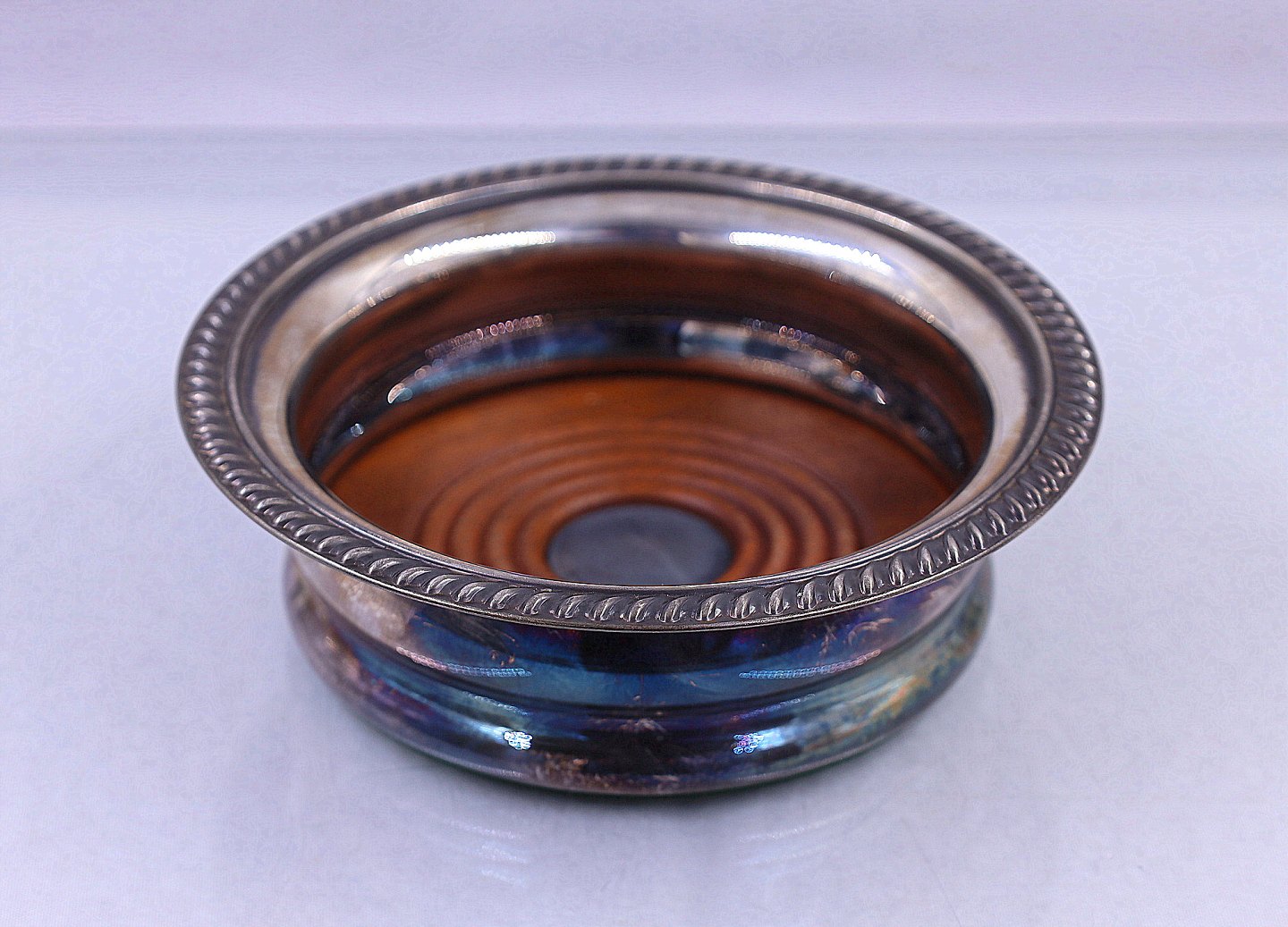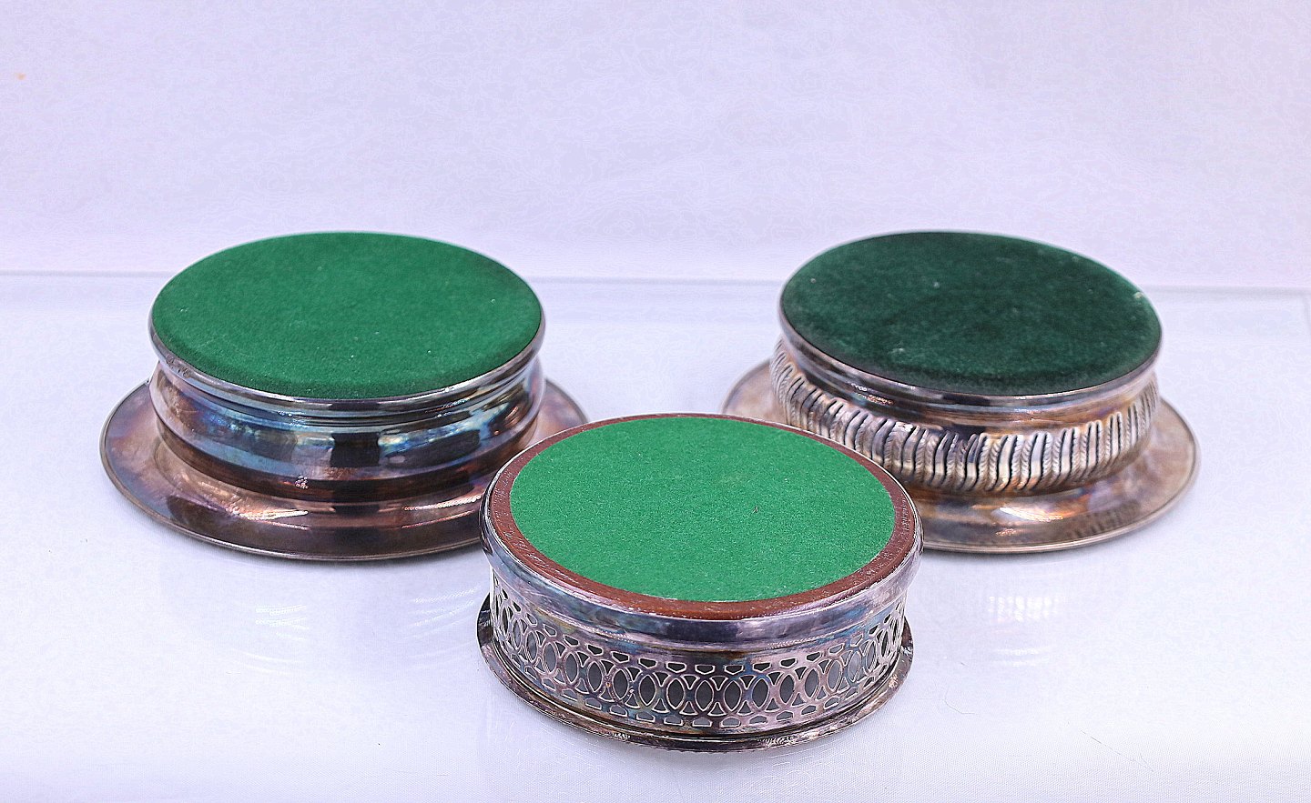 3 stk. engelske vinbakker, i sølvplet og med mahogni bund. 2 er solgt en tilbage, den med mørk midt pris 350