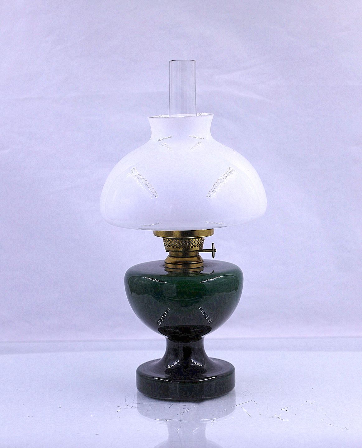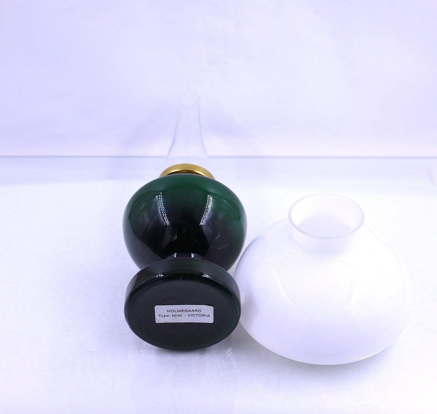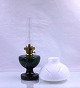 Holmegaards Glasværk. Petroleums bordlampe, Mini- Victoria. Foden på lampen er grøn, og skærmen er af opalglas.