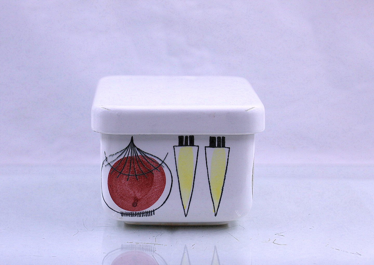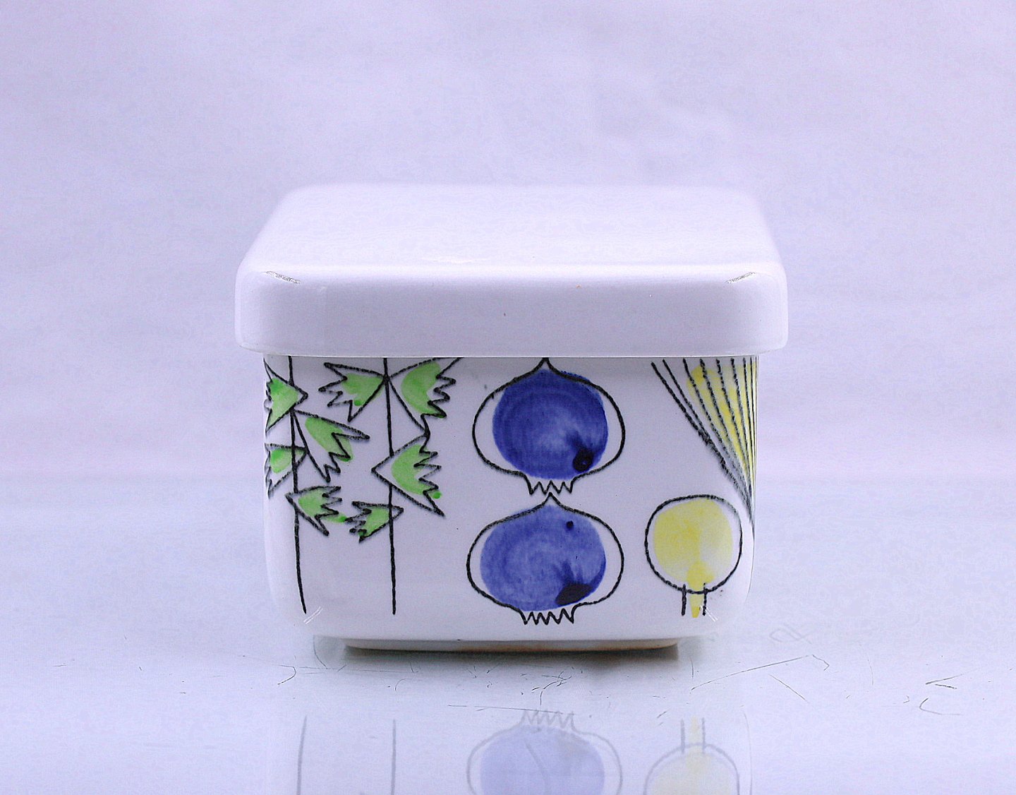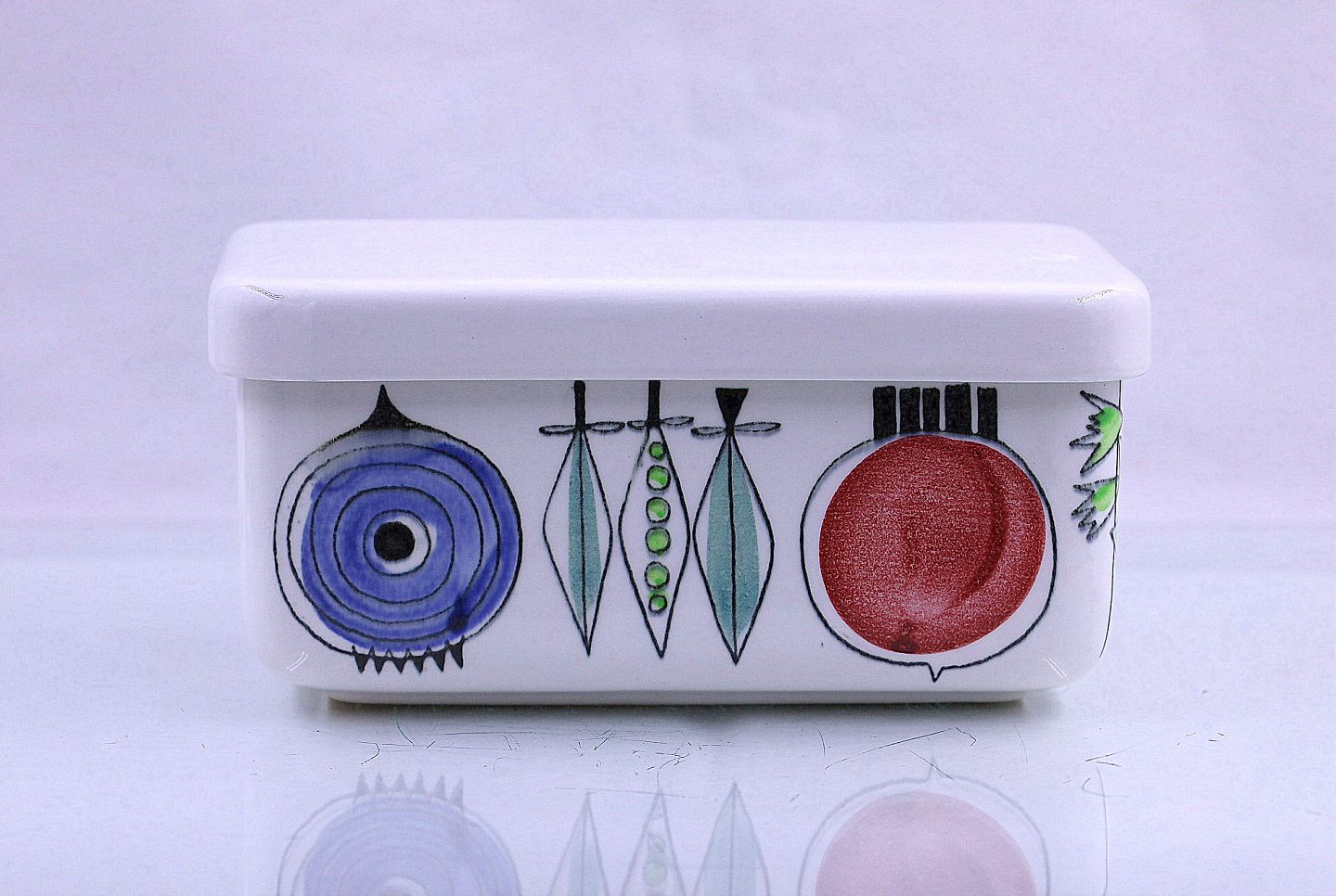 Rørstrand, Sweden. "Picknick" smørboks nr. 44. Boks dekoreret med forskellige grøntsager, boksen er af fajance og med fajance låg.