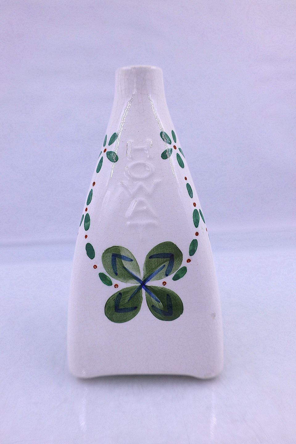 Aluminia, uden nummer. Vase, vasen har et stort grønt blade og ranker med små grønne blade. På vasen er præget HOWART.