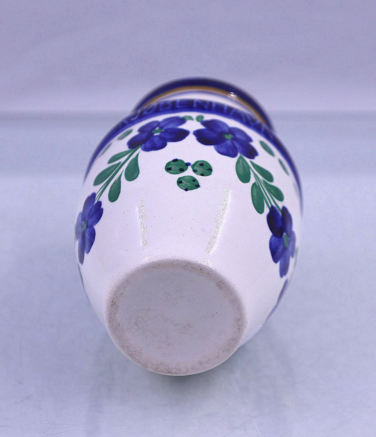Aluminia. Fajance flaske, blå blomster og grønne blade. Den har indskriften KJØBENHAVN, W. BÄHNCKE & Co. Der er ikke stempelet.