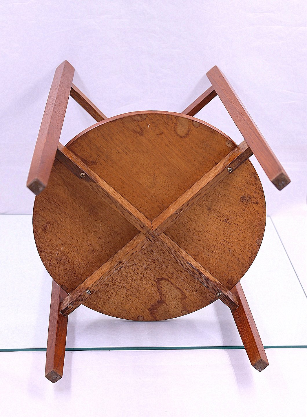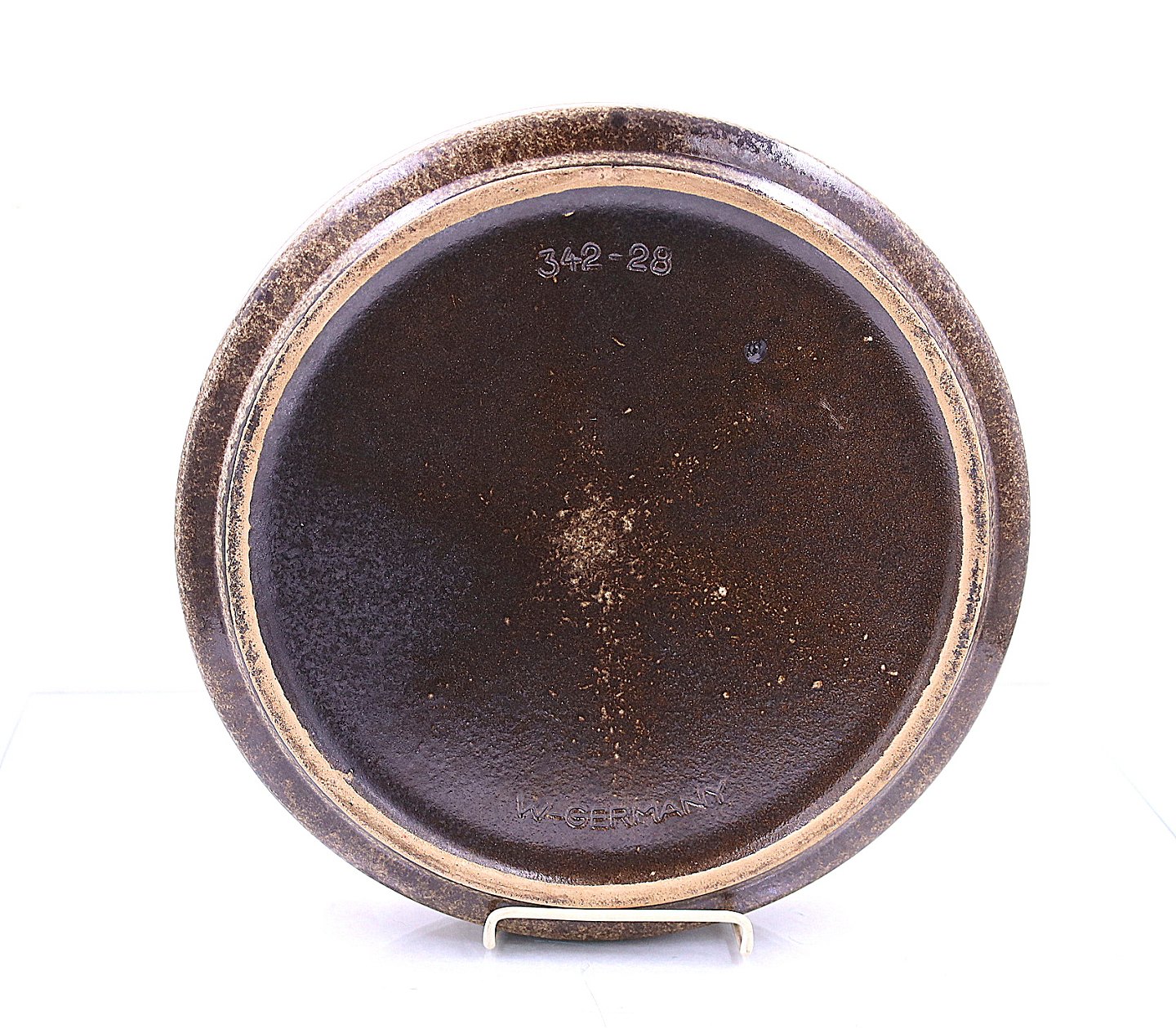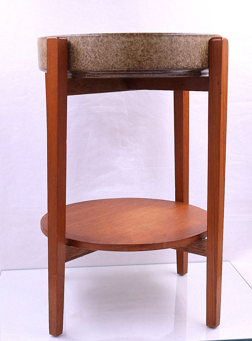 Teaktræsopsats med keramikskål. Teaktræsopsatsen har 4 ben og en hylde. Keramikskål, nr. 342/28, med lava glasur. Skålen er lavet hos Scheurich Keramik, 1959, Kleinheubach West Germany