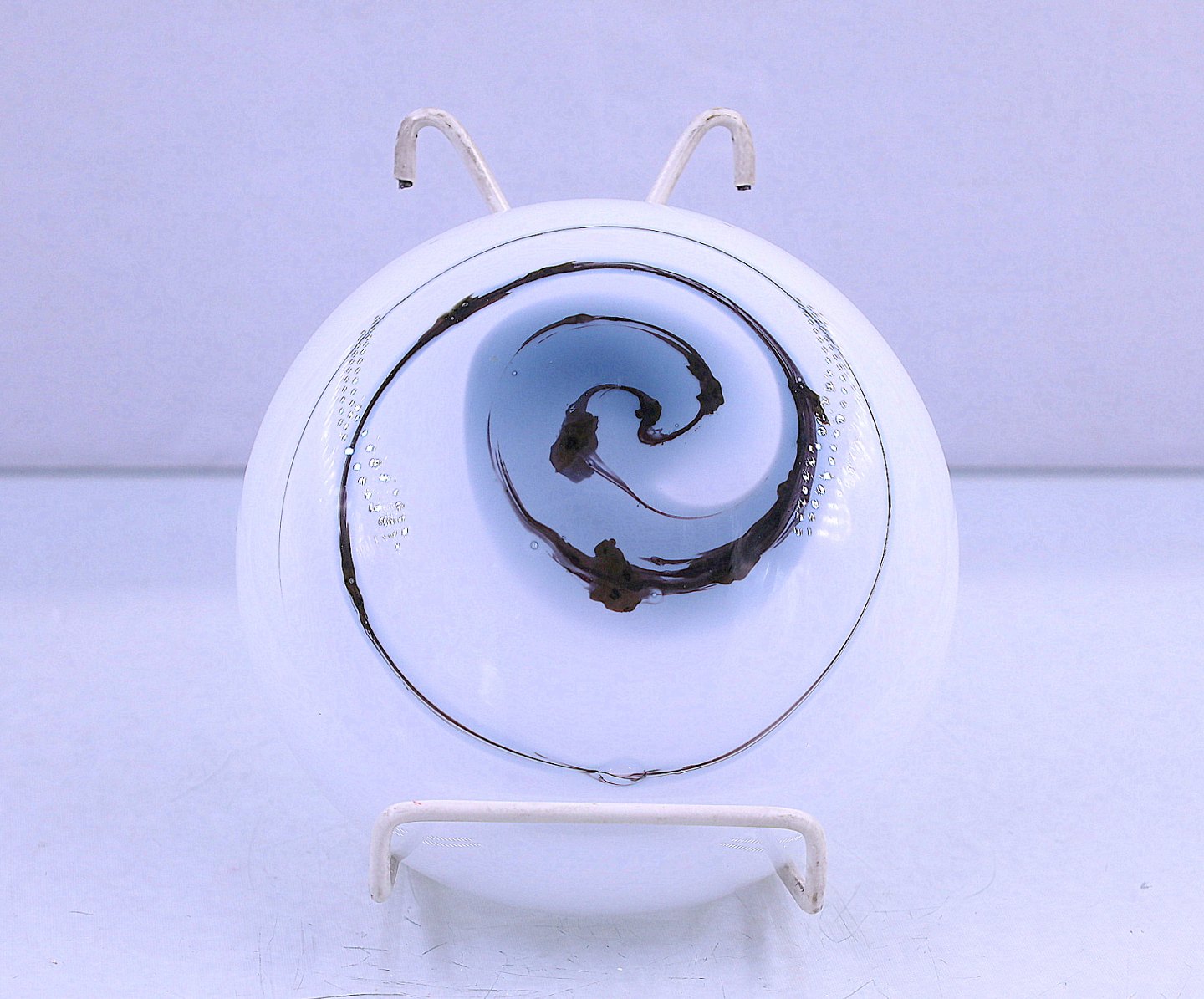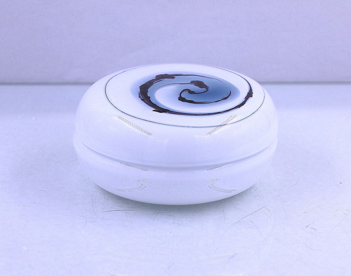 Farver i blåt, lagt på det varme opalglas klart glas som overfang. Bonbonnieren er blæst i 3 lag.
