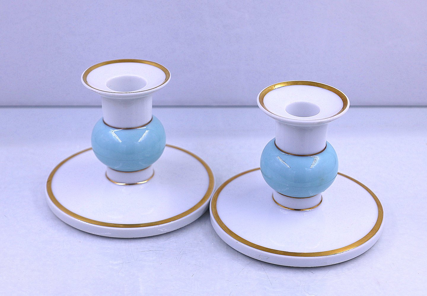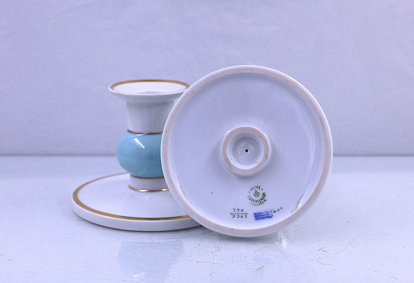 Royal Copenhagen. Lysestager nr. 790/3363. Lave lysestager, der er med lyseblå kugle og guldkant.