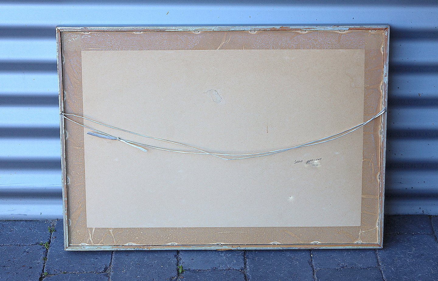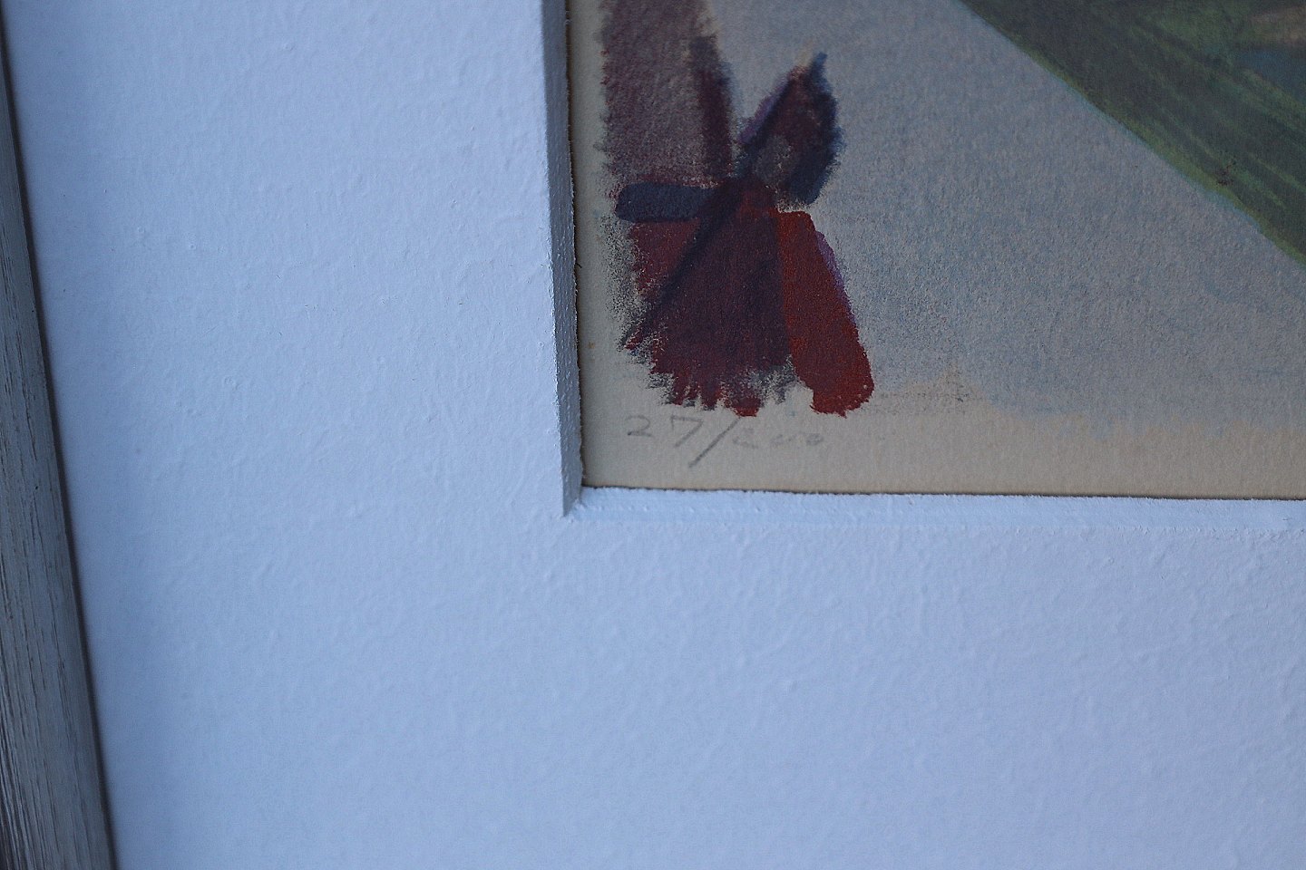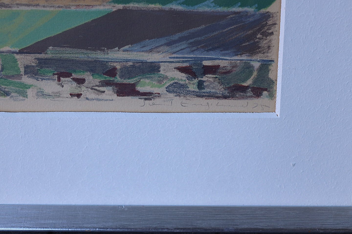 Svend Engelund, litografi nr. 27/200. Skue over marker og gårde med himmel. Litografiet er passepartout i sølvramme, der er ingen brugsspor.
