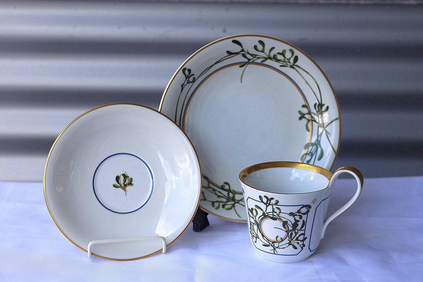 Royal Copenhagen. Julestel med dekoration af mistelten. Sættet består af kop med høj hank, nr. 2505093, underkop, nr. 2505094, sidetallerken, nr. 2505617.