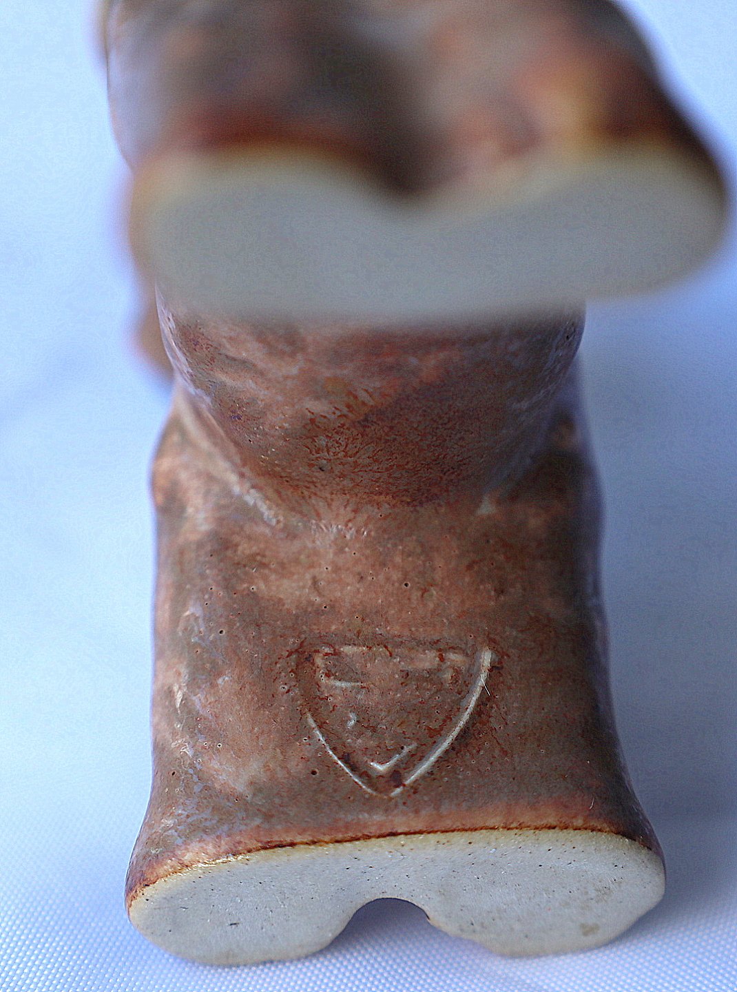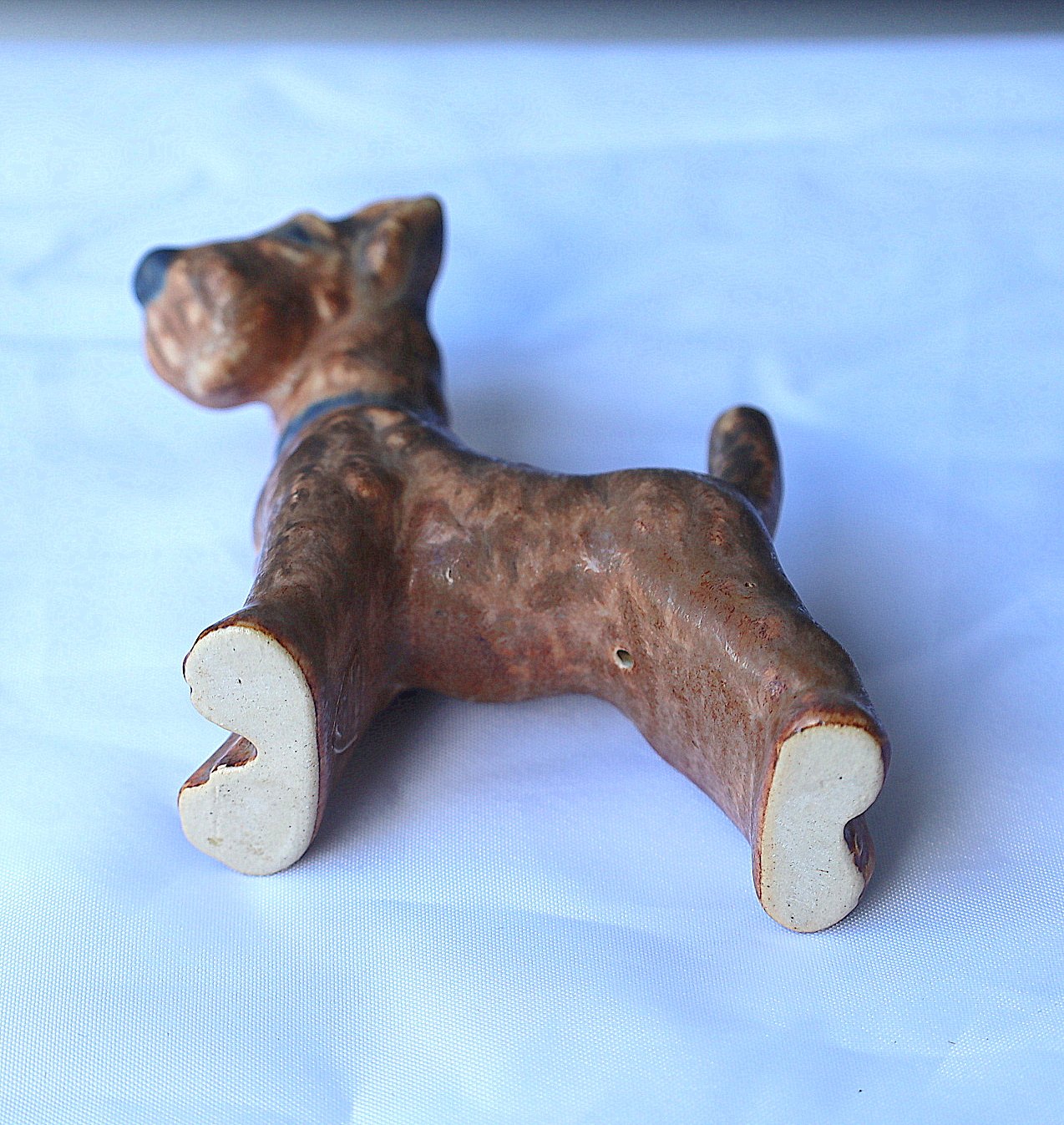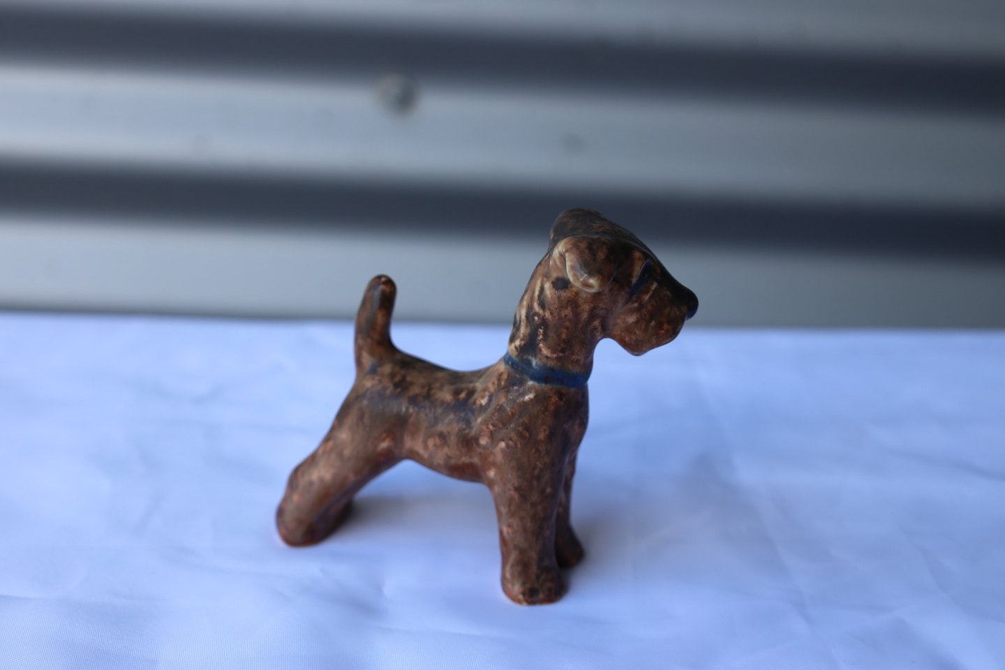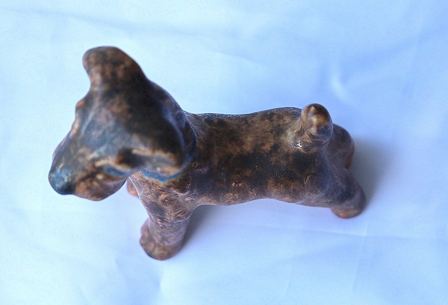 Michael Andersen, Bornholm . Figur, keramik hund i brune farver, hunden har et blåt halsbånd.