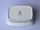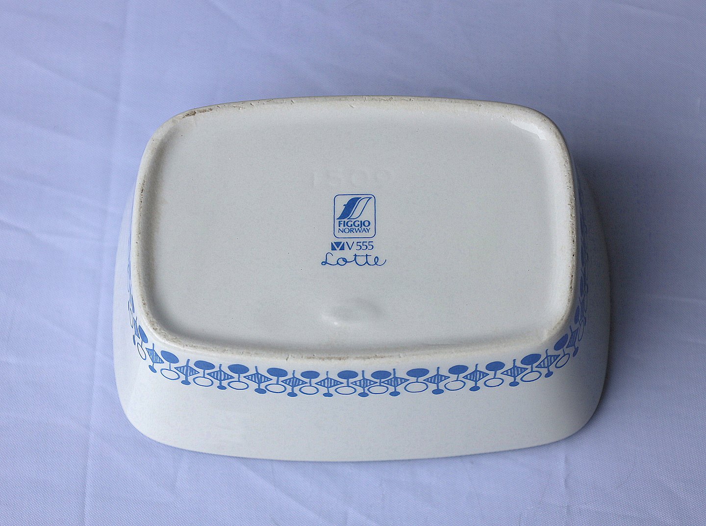 Figgjo, Norway. Smørboks, VV 555, Lotte. Smørboks, i hvid keramik, med tegning af "Lotte" på låget. Smørboksen har blå bort, nederst.