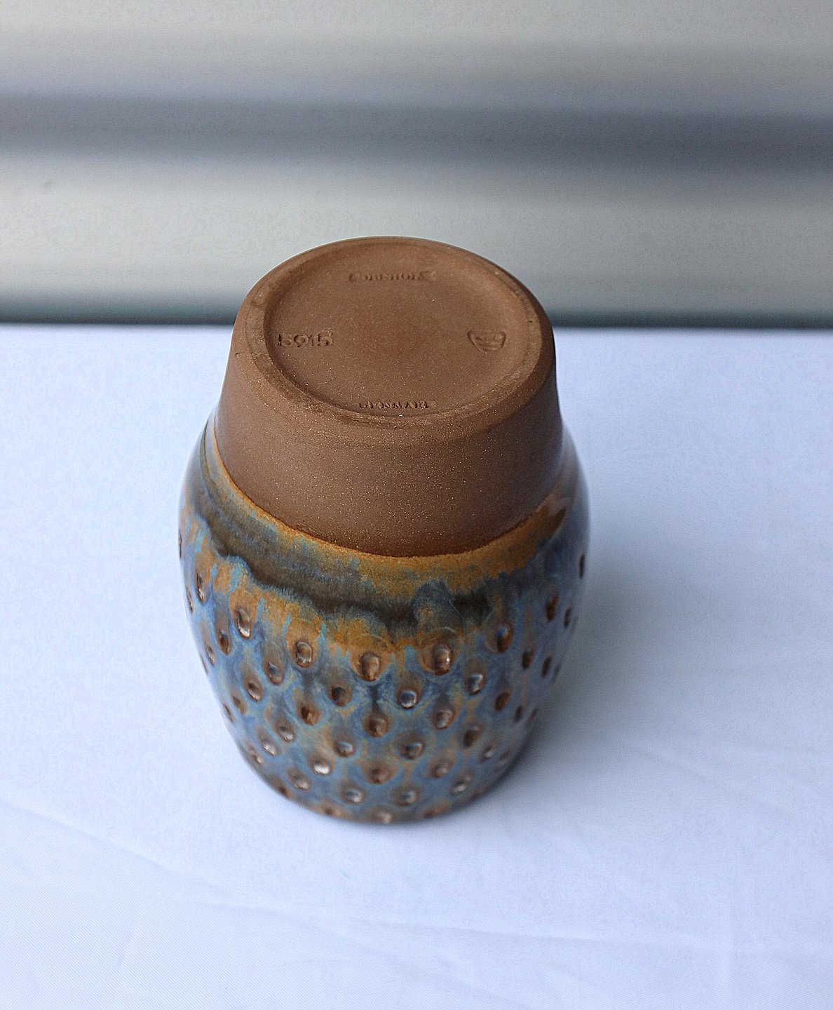 Michael Andersen, Bornholm Keramik. Vase nr. 5915. Dekorationen, på vasen, er presset i keramikken og derefter er vasen glaseret.