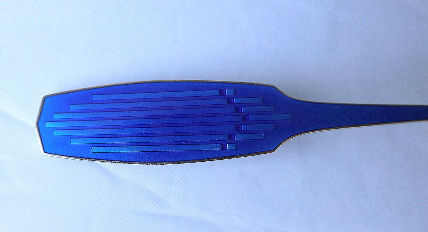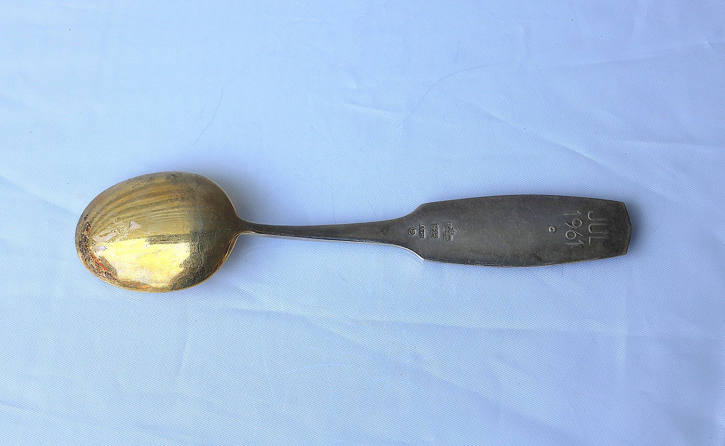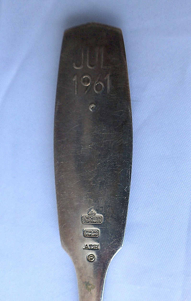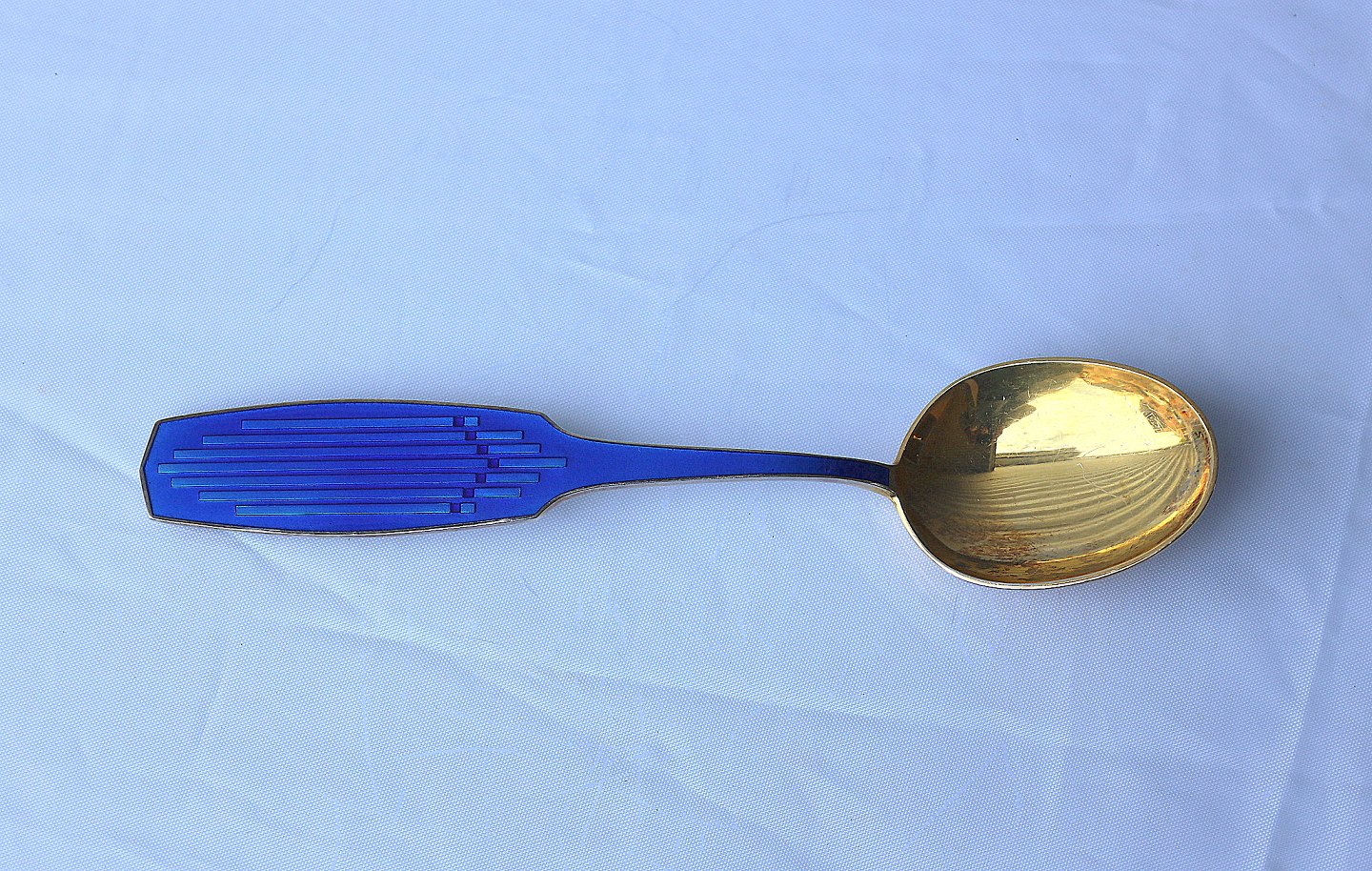 Anton Michelsen juleske 1961. Skeen er forgyldt sølv, dekorationen er orgelpiber i blå emalje.