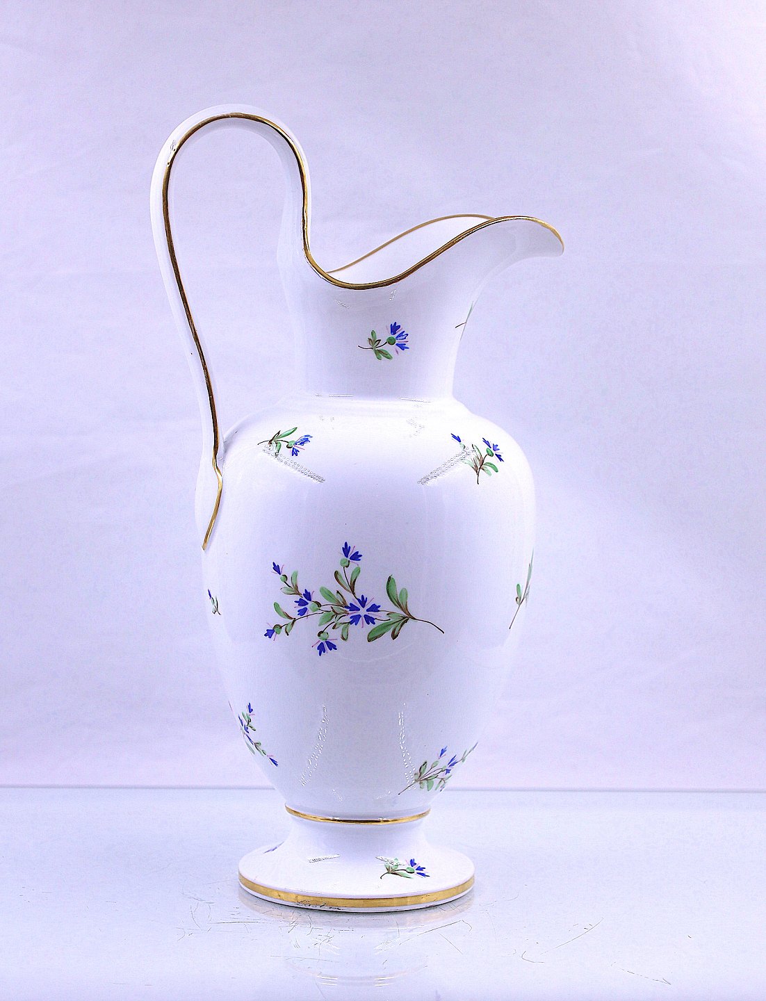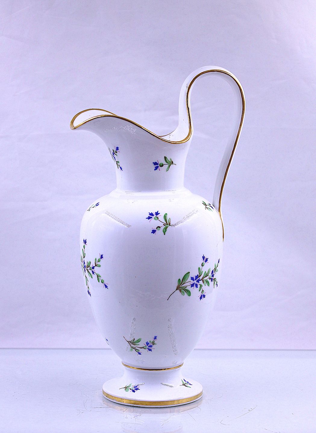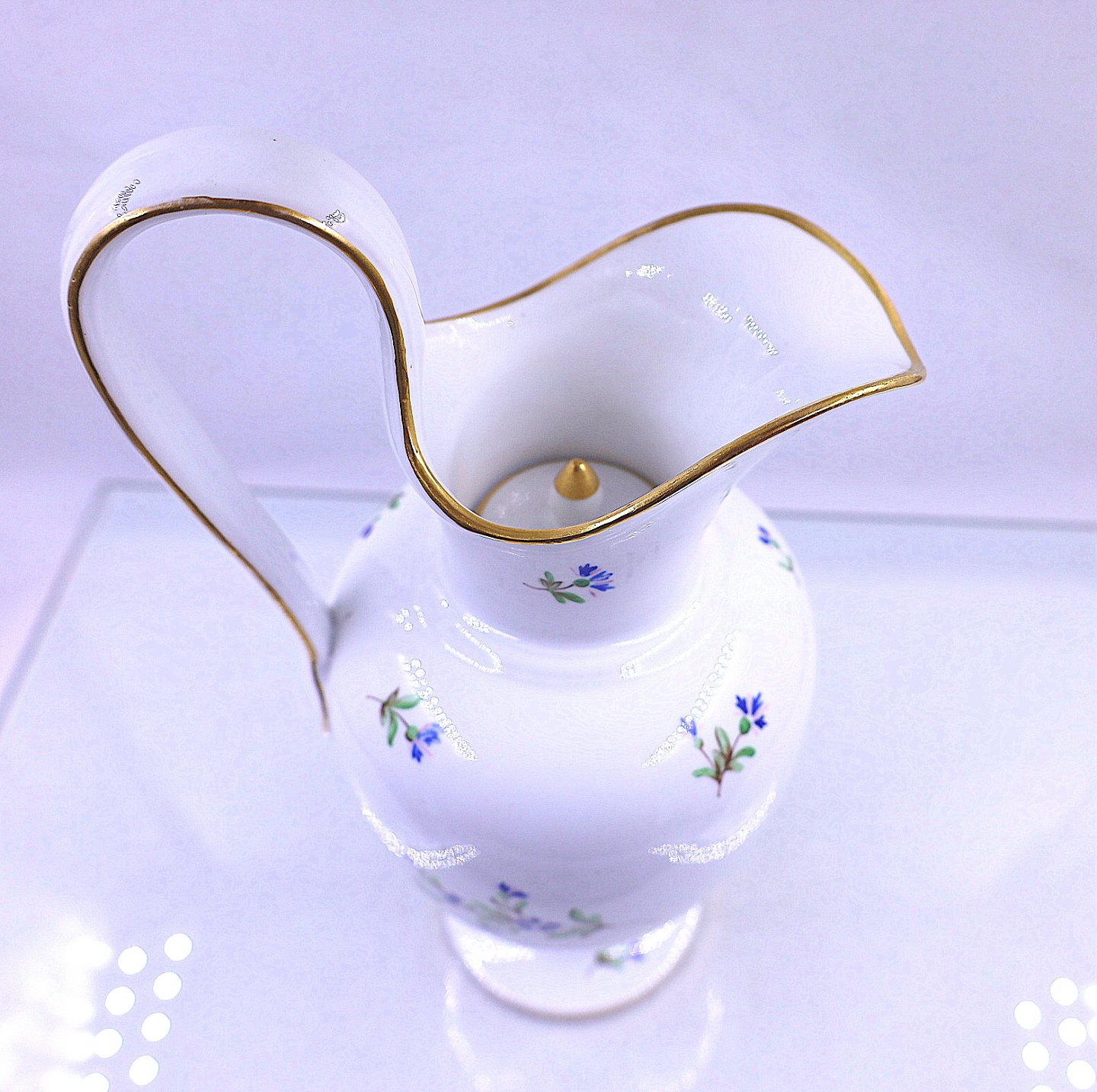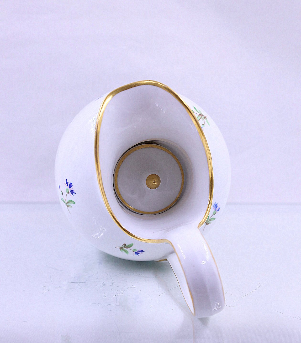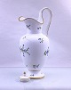 Royal Copenhagen. Chokoladekande, der er 3 bølger, men ingen nr. som stempel i bunden, ud frafabriksmærket , ses det, at denne kande er produceret mellem år 1840-1893. Chokoladekanden har høj hank og er dekoreret med buketter af små blå blomster og grønne blade.