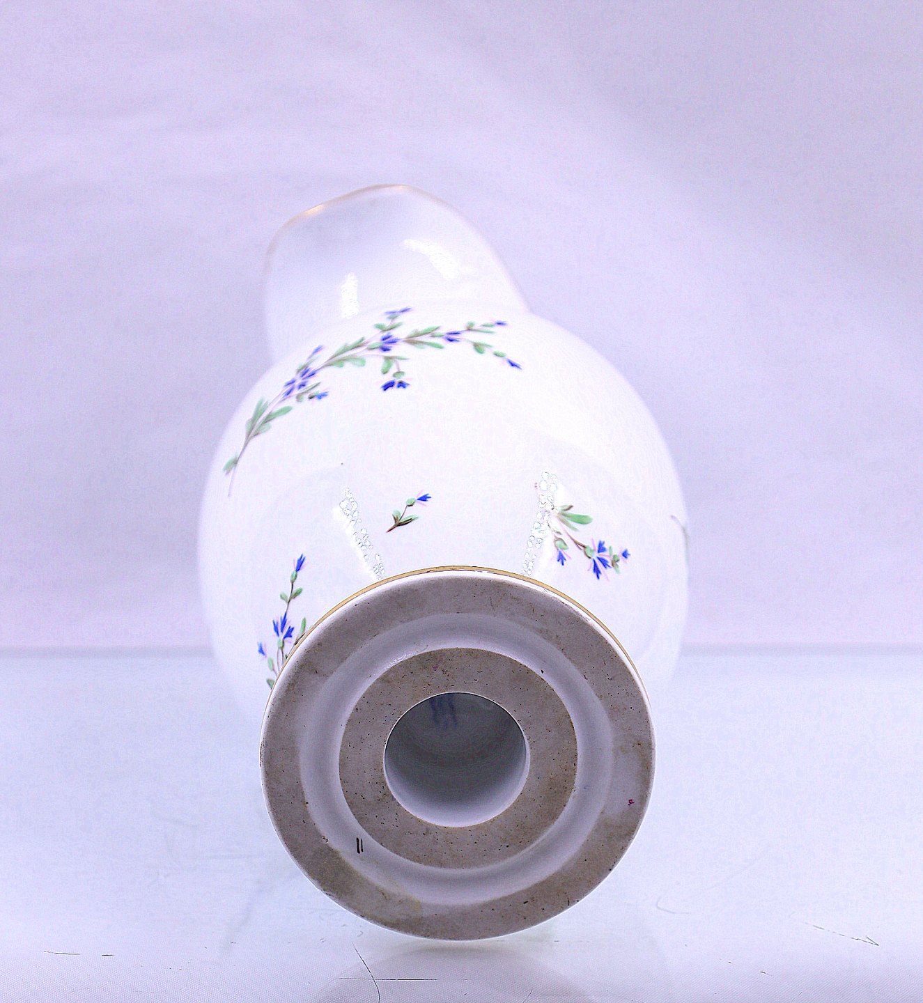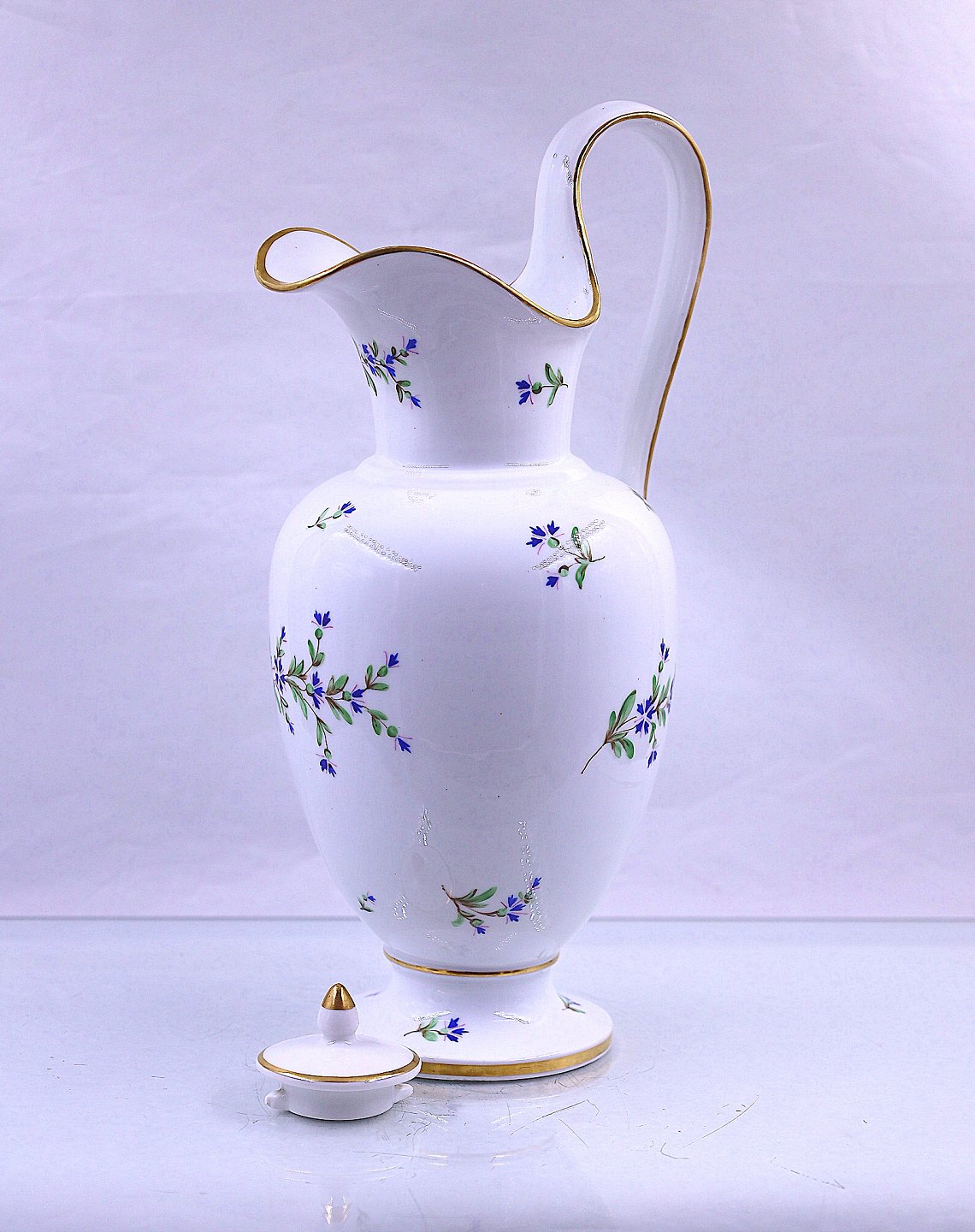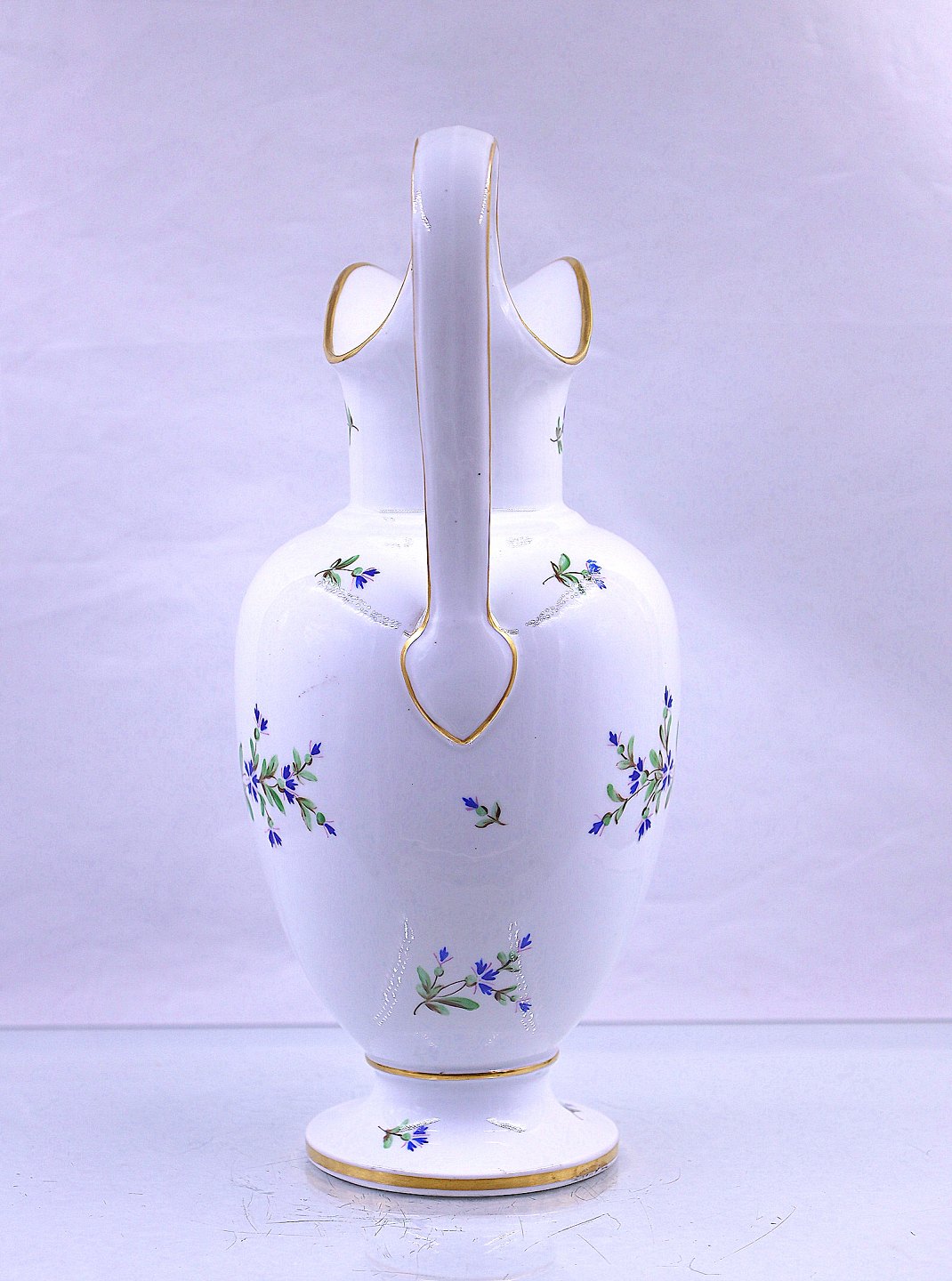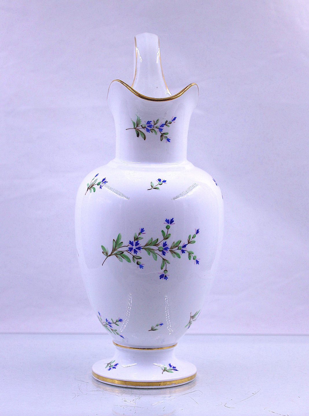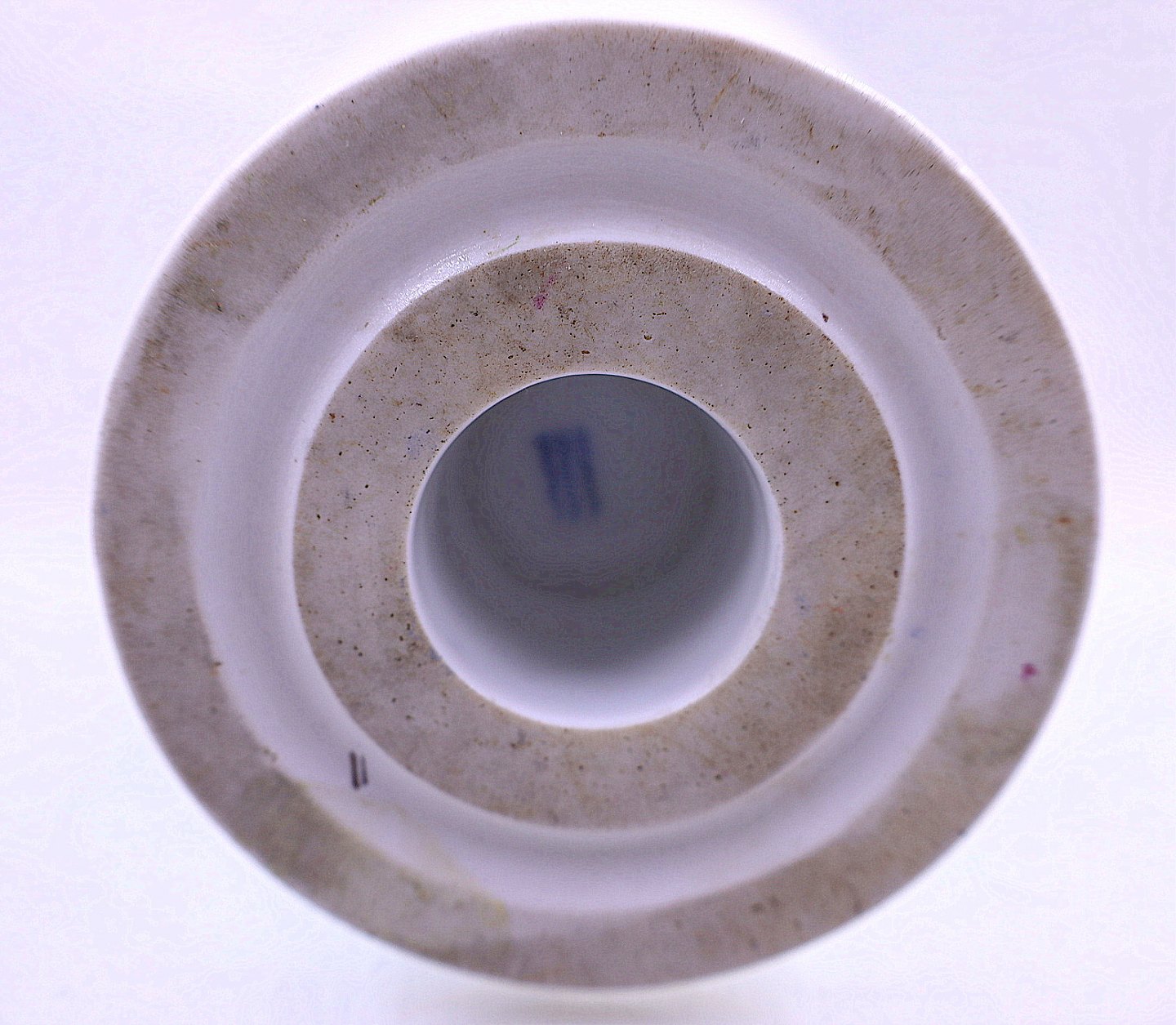 Royal Copenhagen. Chokoladekande, der er 3 bølger, men ingen nr. som stempel i bunden, ud frafabriksmærket , ses det, at denne kande er produceret mellem år 1840-1893. Chokoladekanden har høj hank og er dekoreret med buketter af små blå blomster og grønne blade.