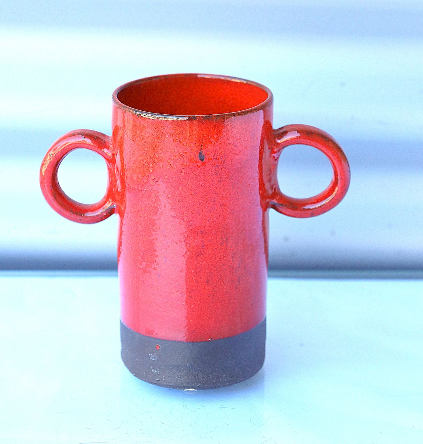 Abbednæs Potteri, krus med 2 runde hanke. Keramik, rød glaseret, krus med 2 røde hanke.