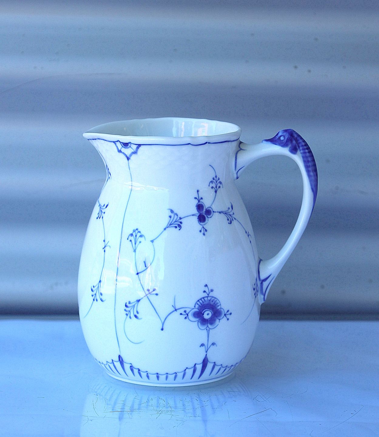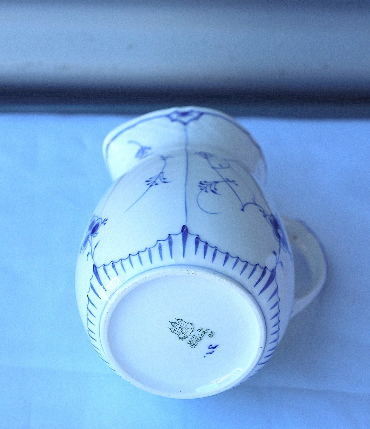 Bing & Grøndahl, musselmalet kande nr. 85. Kanden er hvidt porcelæn, med blåmalet mønster.