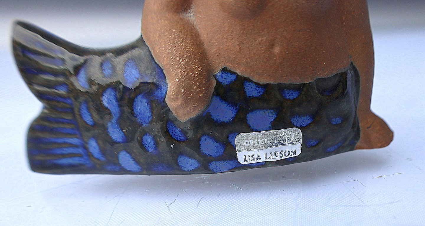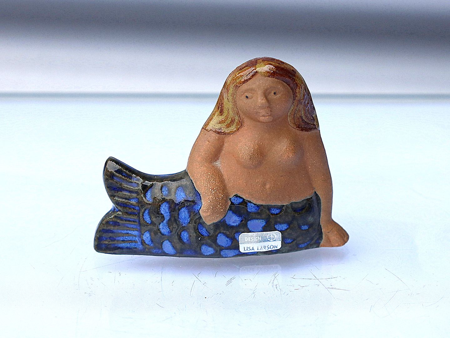 Lisa Larson, Gustavsberg. Keramik Havfrue. Havfruen har blå hale med lyseblå prikker, Havfruen har langt hår. Havfruen er fremstillet Gustavsberg, Sverige fra 1963.