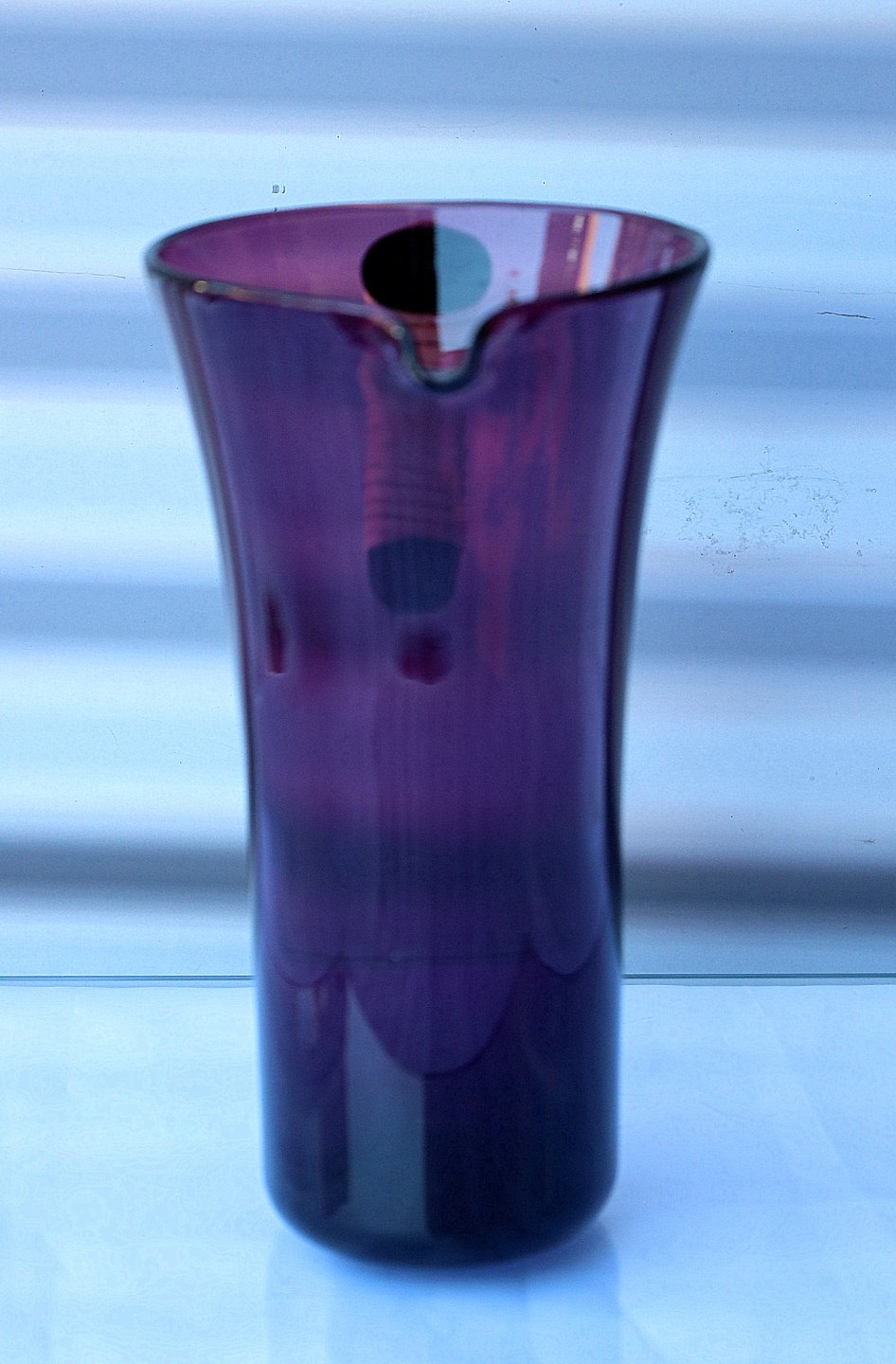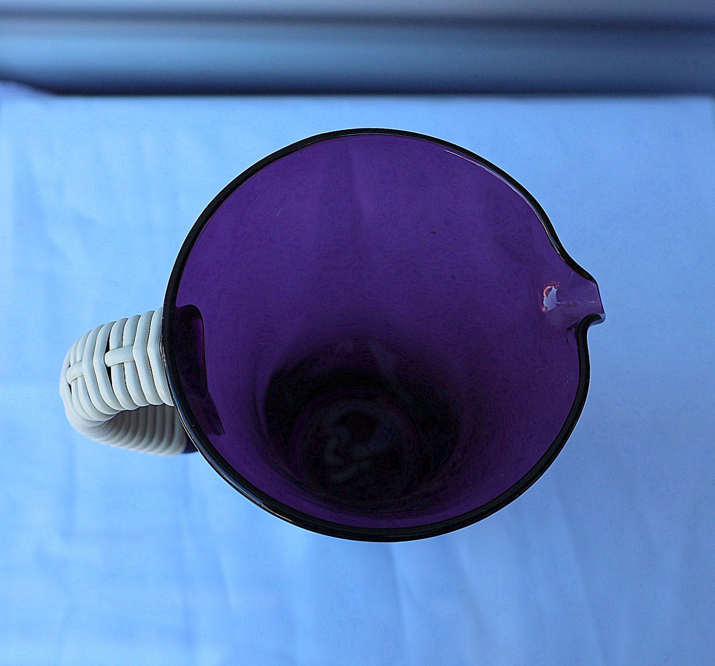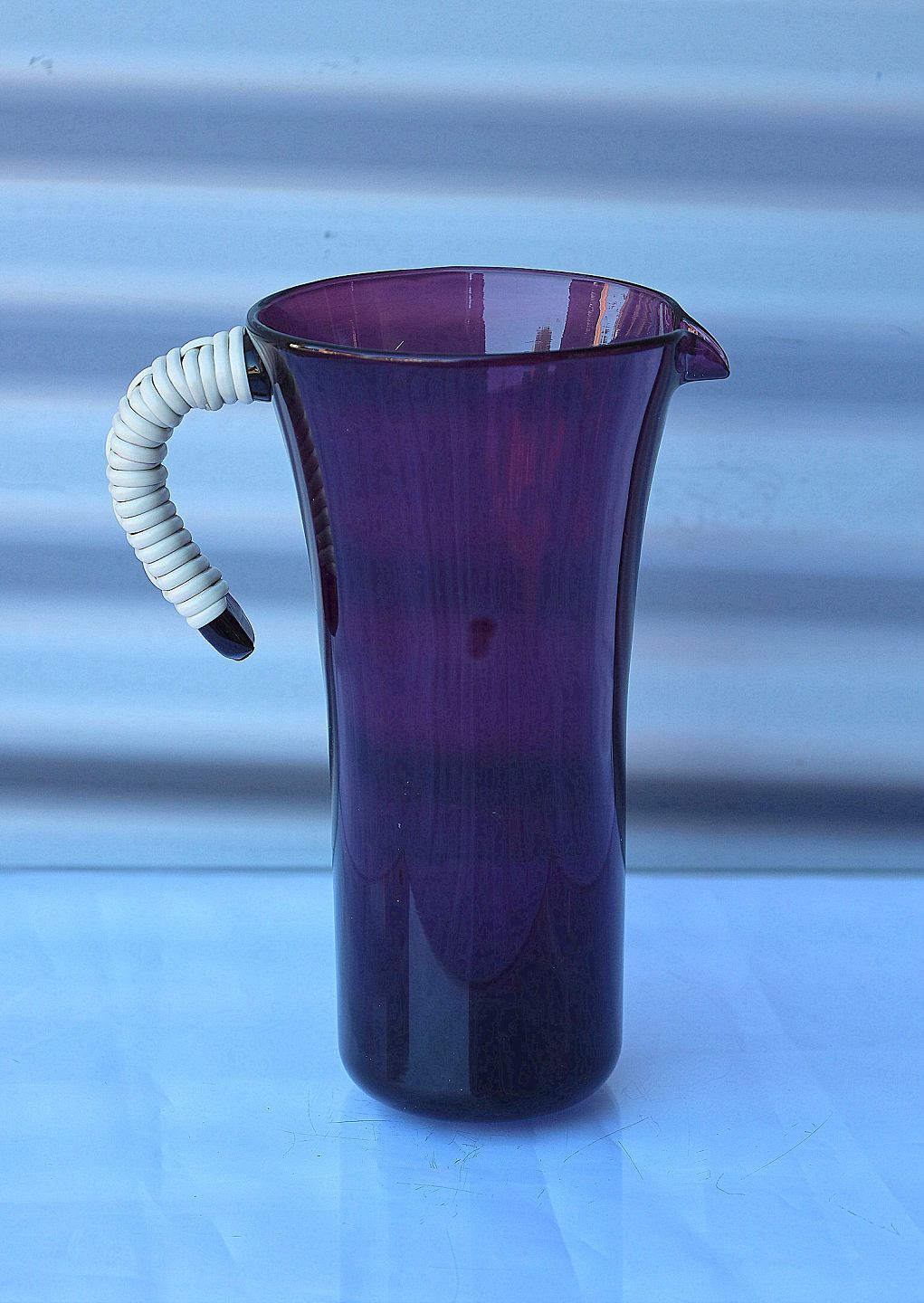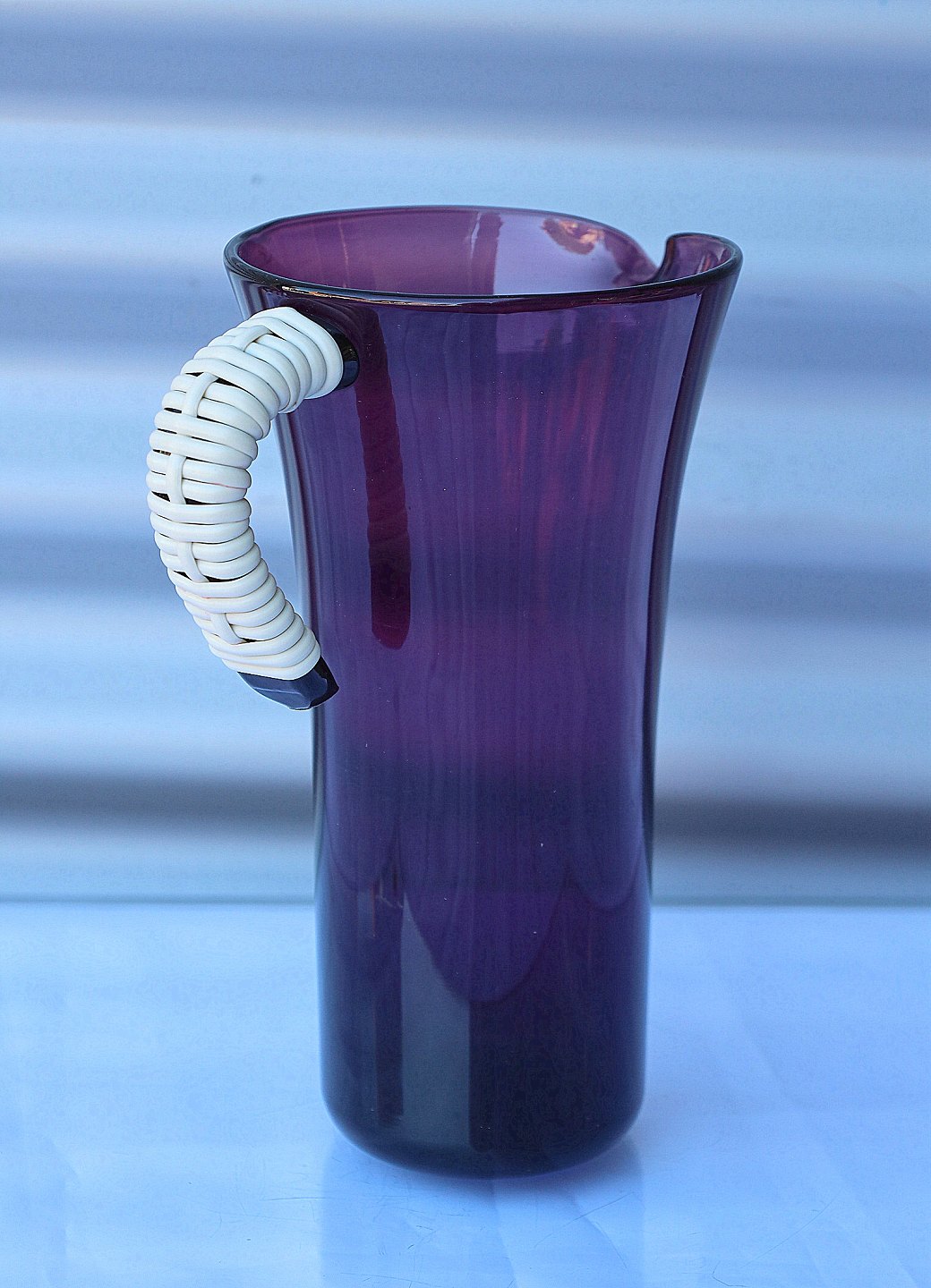 Holmegaard Glasværk. Lilla glaskande med påsat hank. Hanken er beviklet med plast.