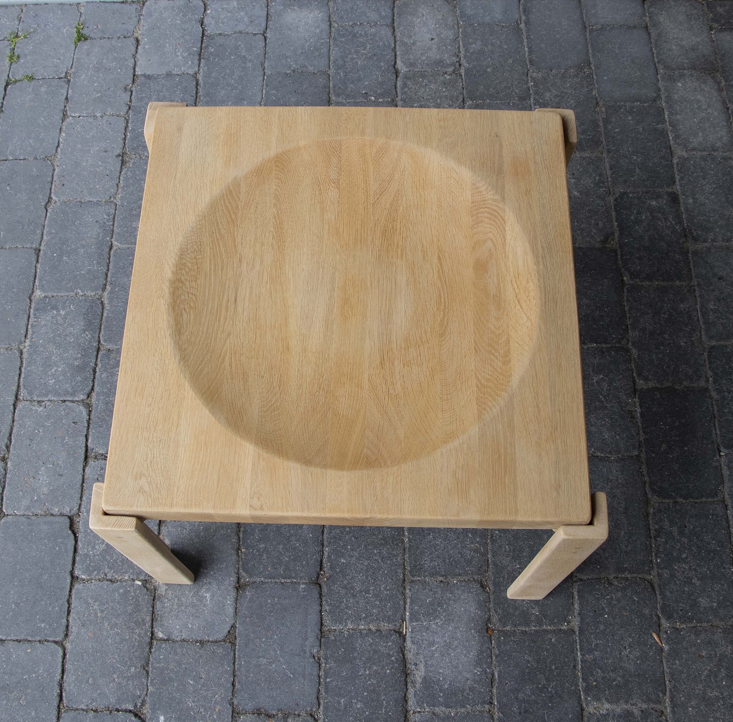 Bordpladen har en flad side og en side med en cirkelformet fordybning.