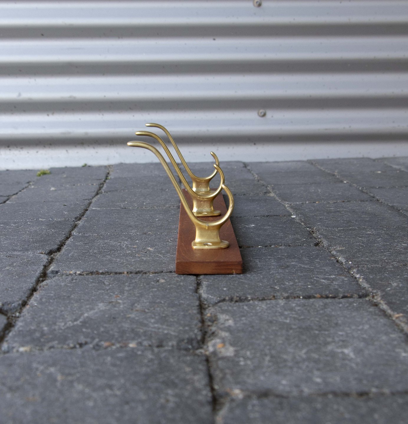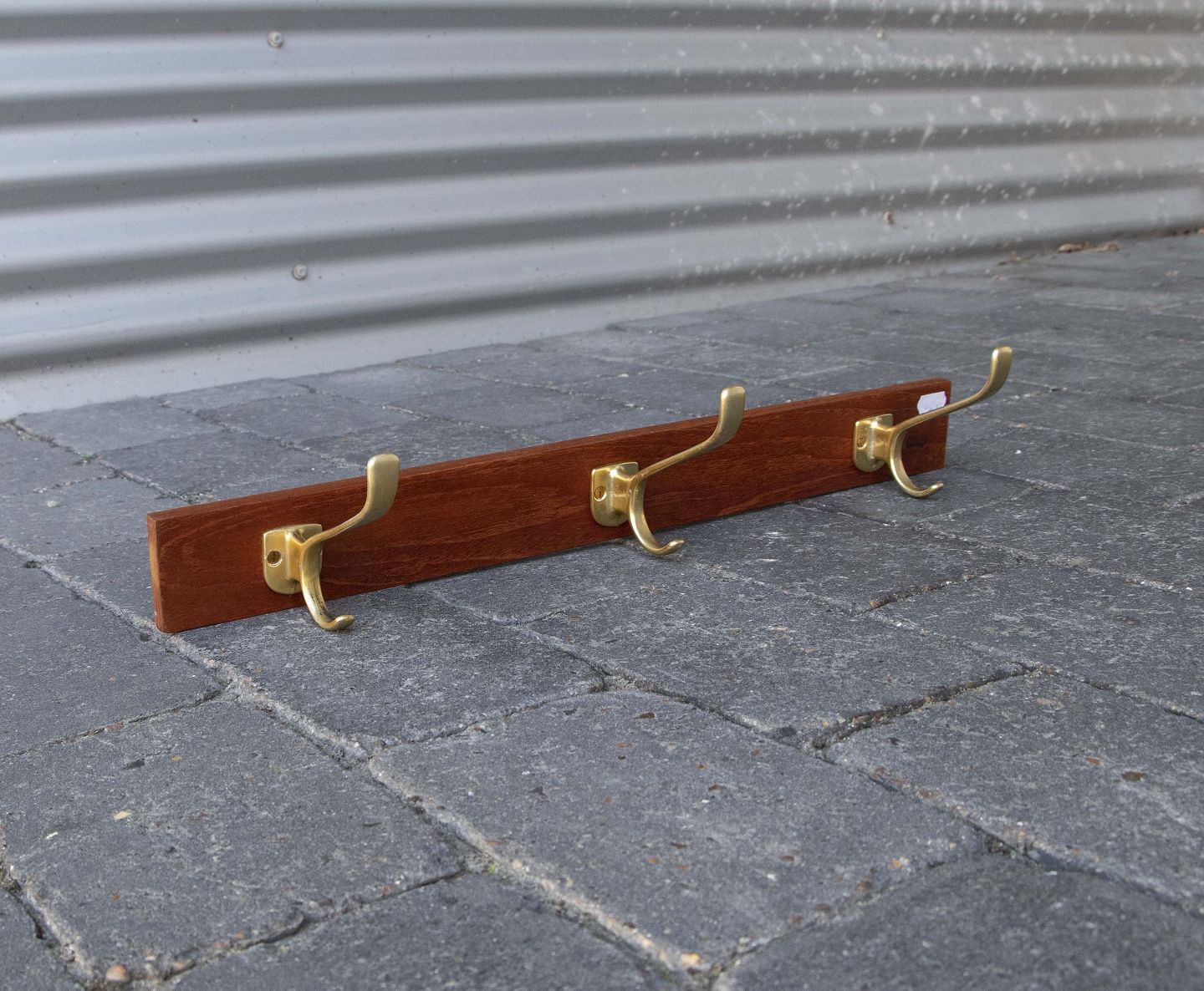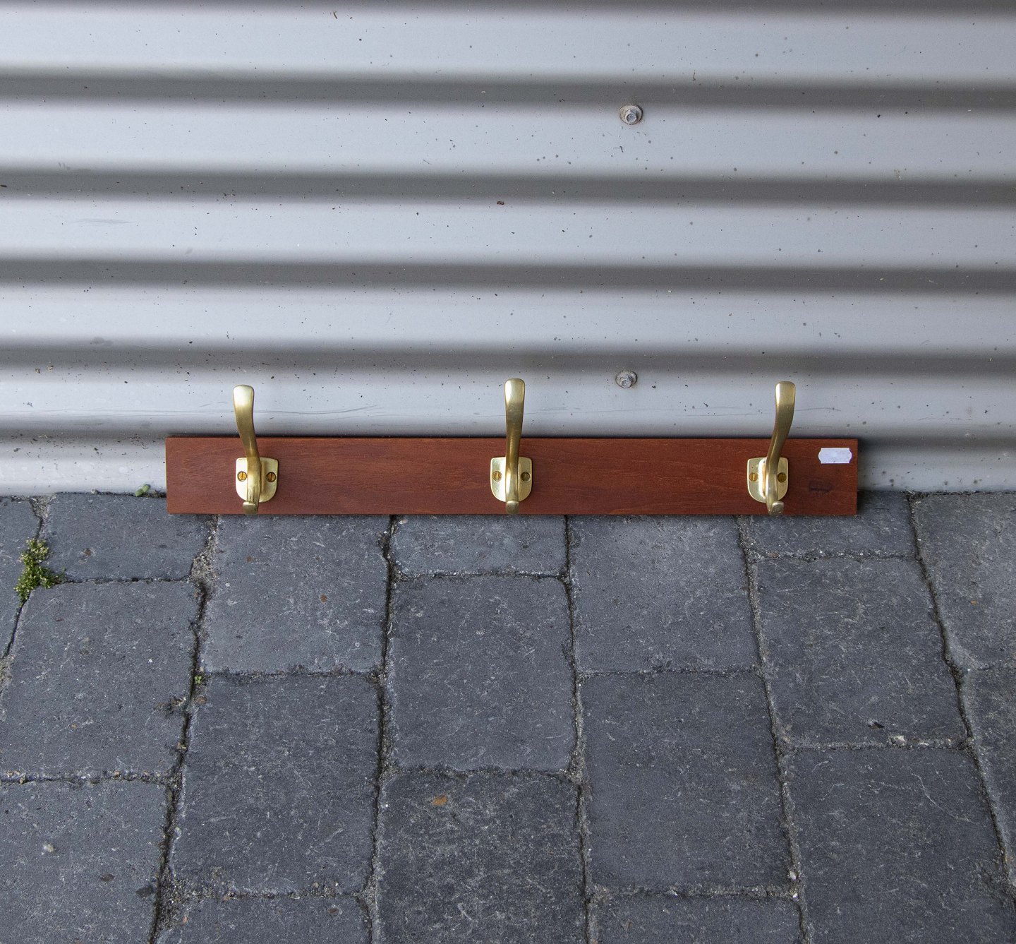 Knagerække med tre knager i gyldenbelagt metal på teaktræ