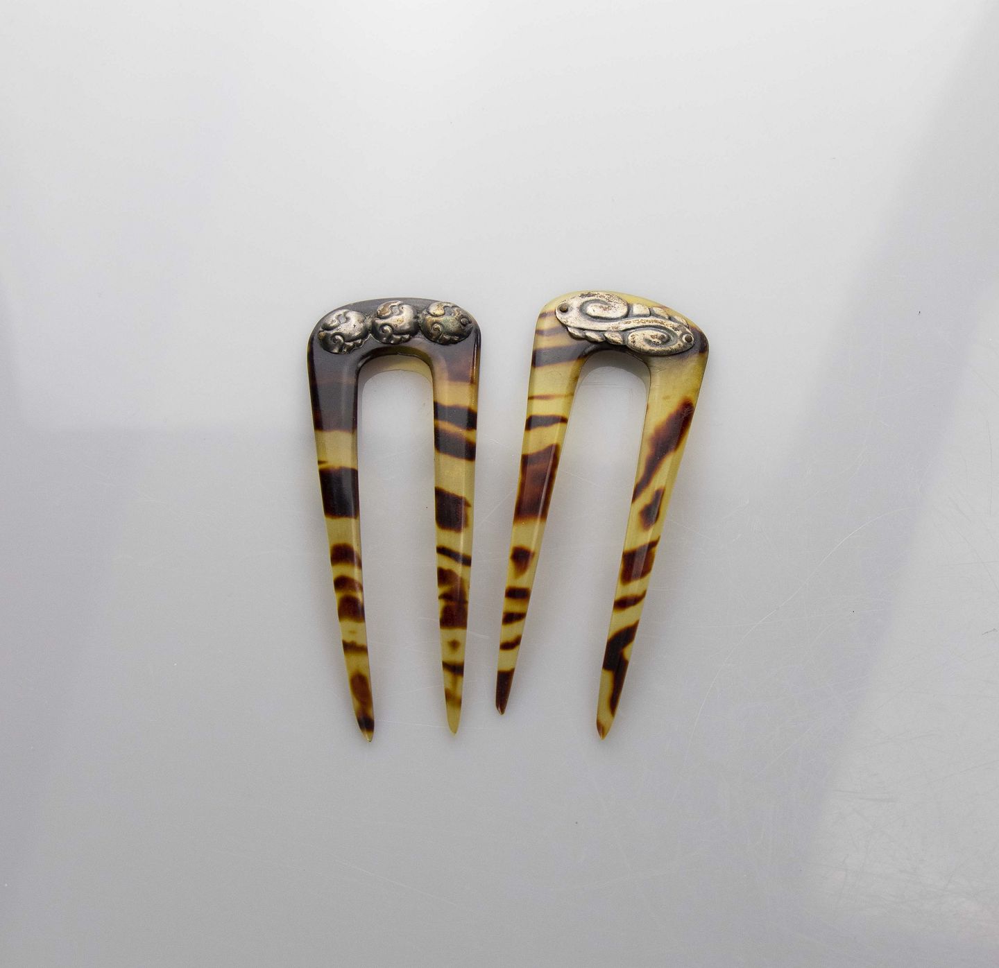 Et sæt hårnåle fremstillet af skildpaddeskjold med ornament i sølv.