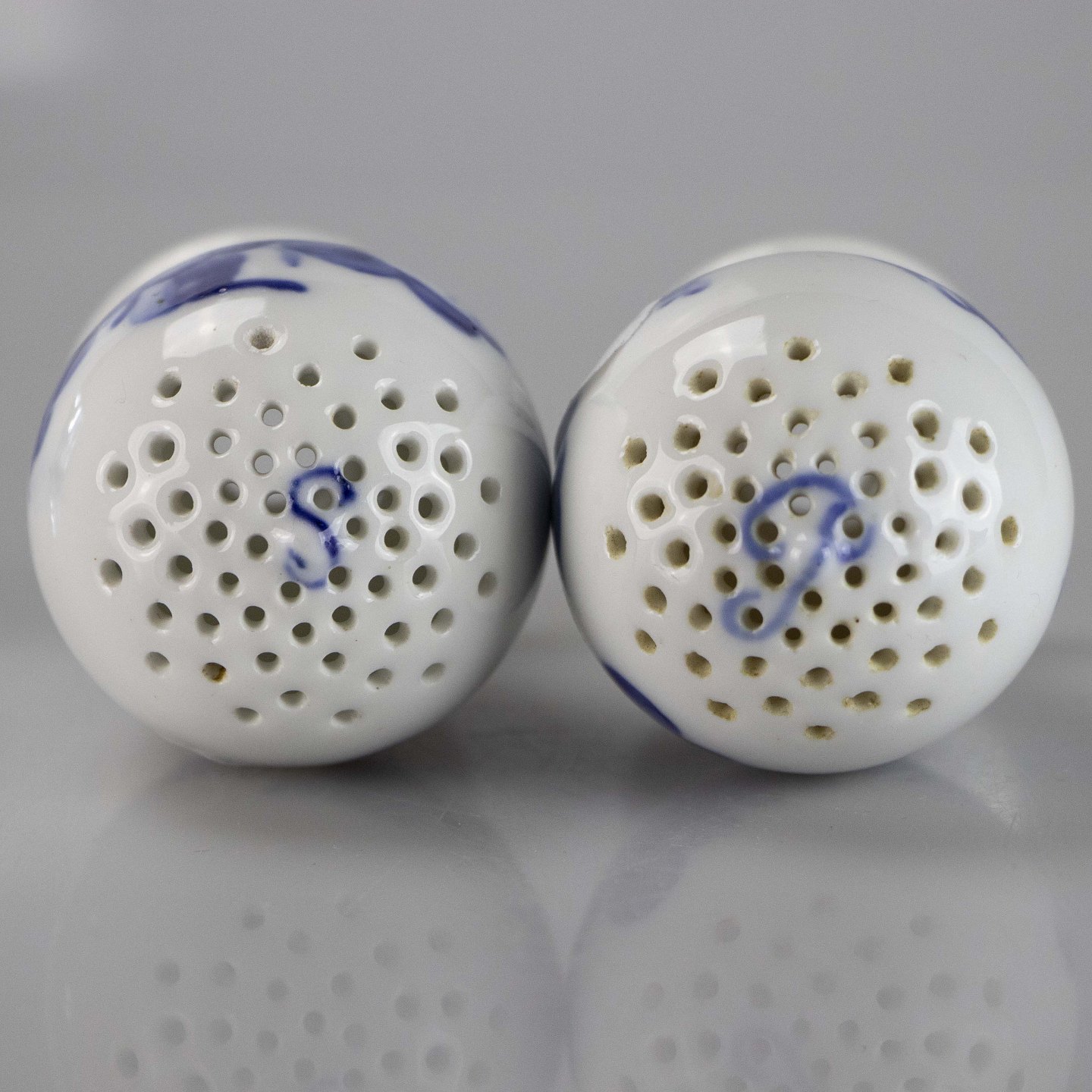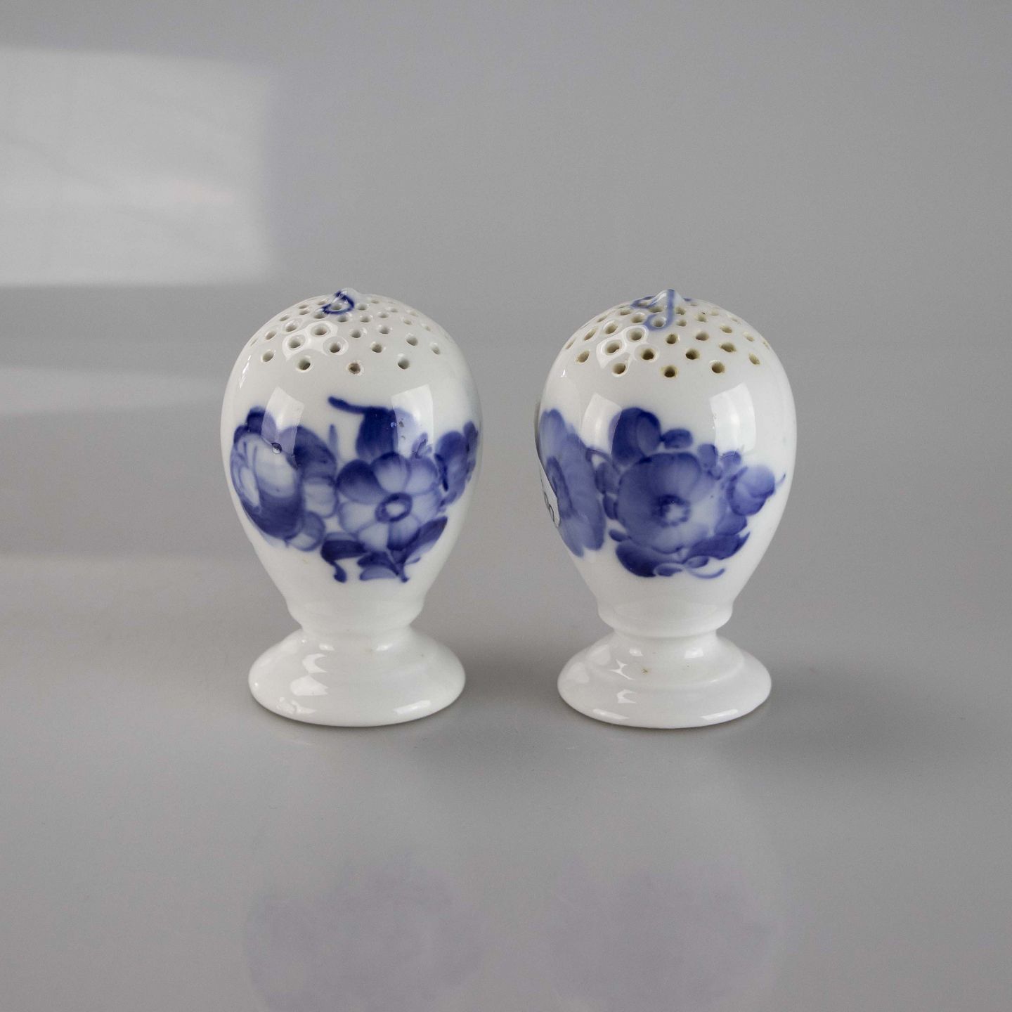 Salt- og peberbøsse fra stellet Blå blomst flettet nr. 10/8763 og 10/8768