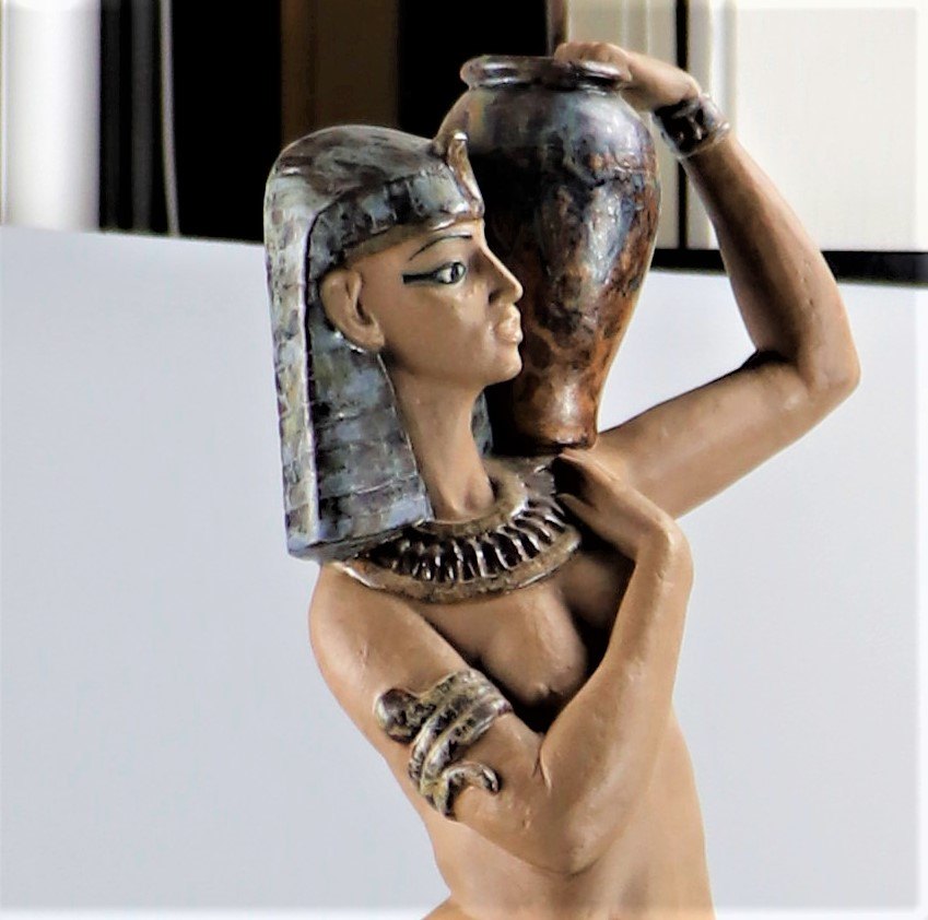 Lerfigur af egyptisk kvinde med krukke på venstre skulder.