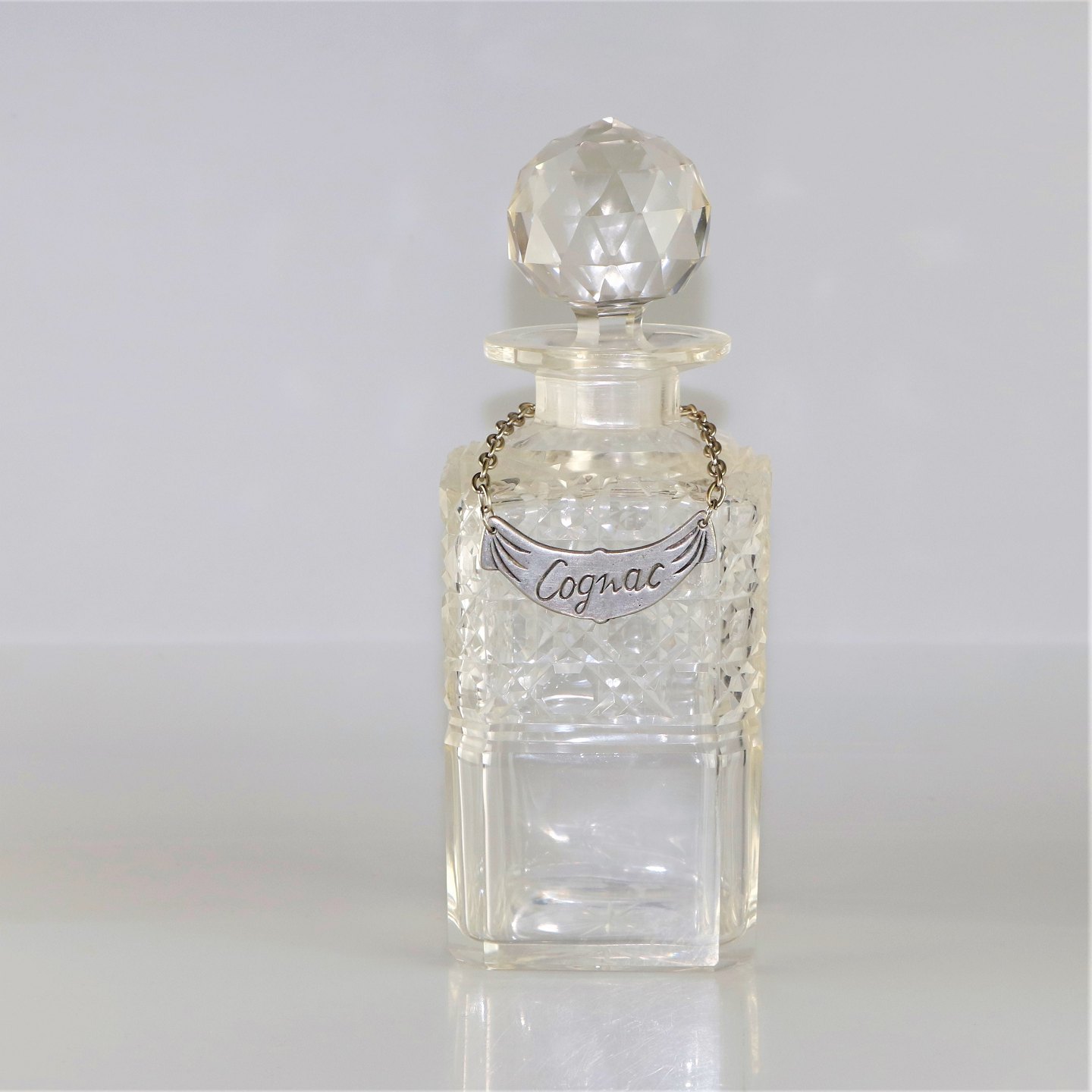 Flot håndlavet trækasse af teaktræ med 3 kvadratiske krystal flasker, som hver bærer et tinskilt. Skiltene er mærket med Cognac, Port og Whisky, fremstillet i Holland.