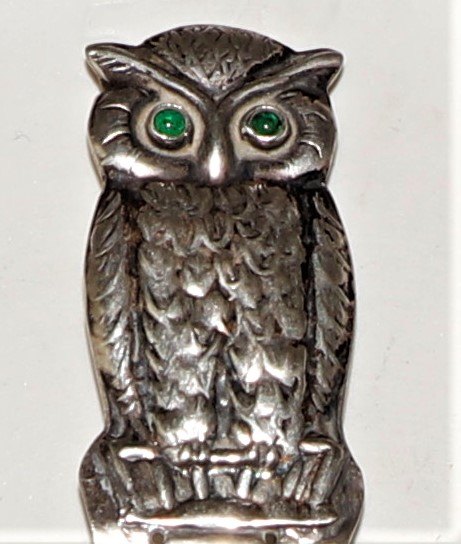 Motiv af ugle med øjne af grønne perler (muligvis agat)