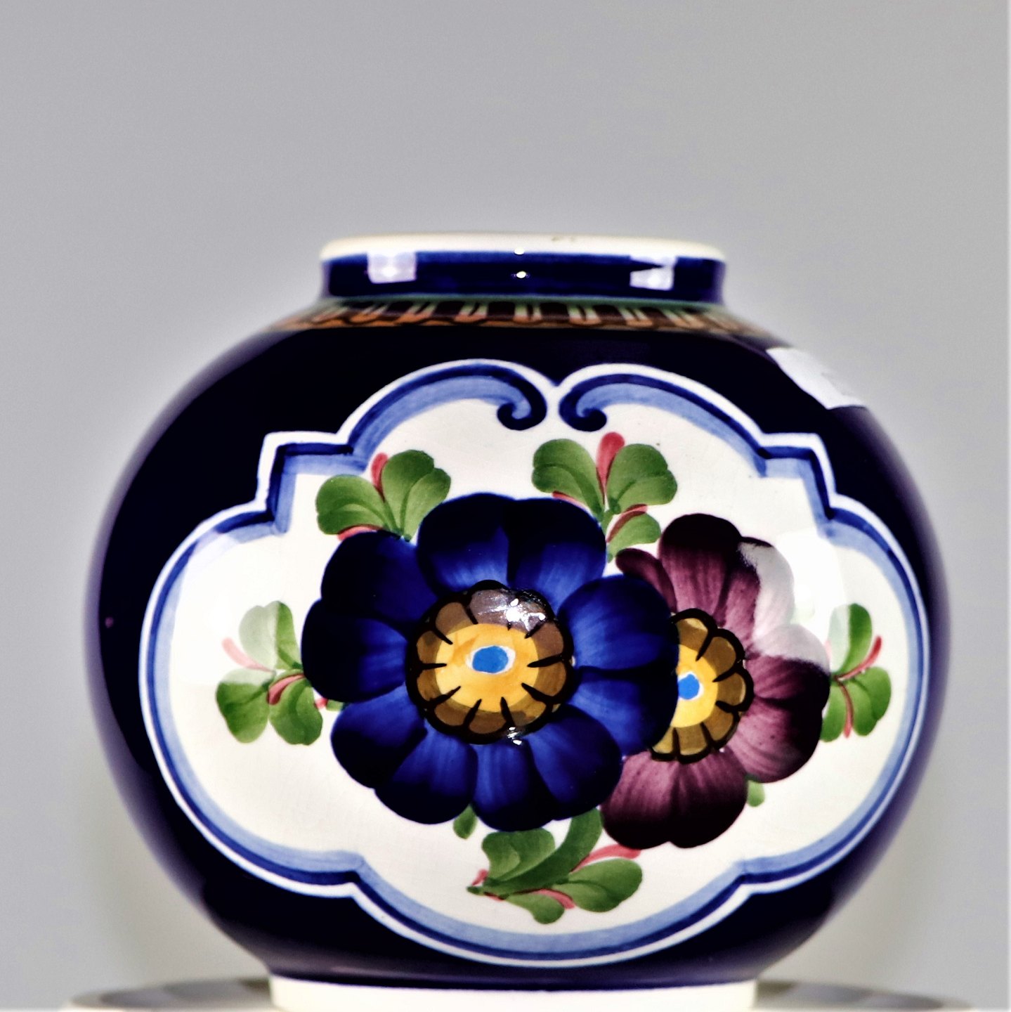 Mørk blå med blomst, vase, vase med blomster, blå vase, kugleform