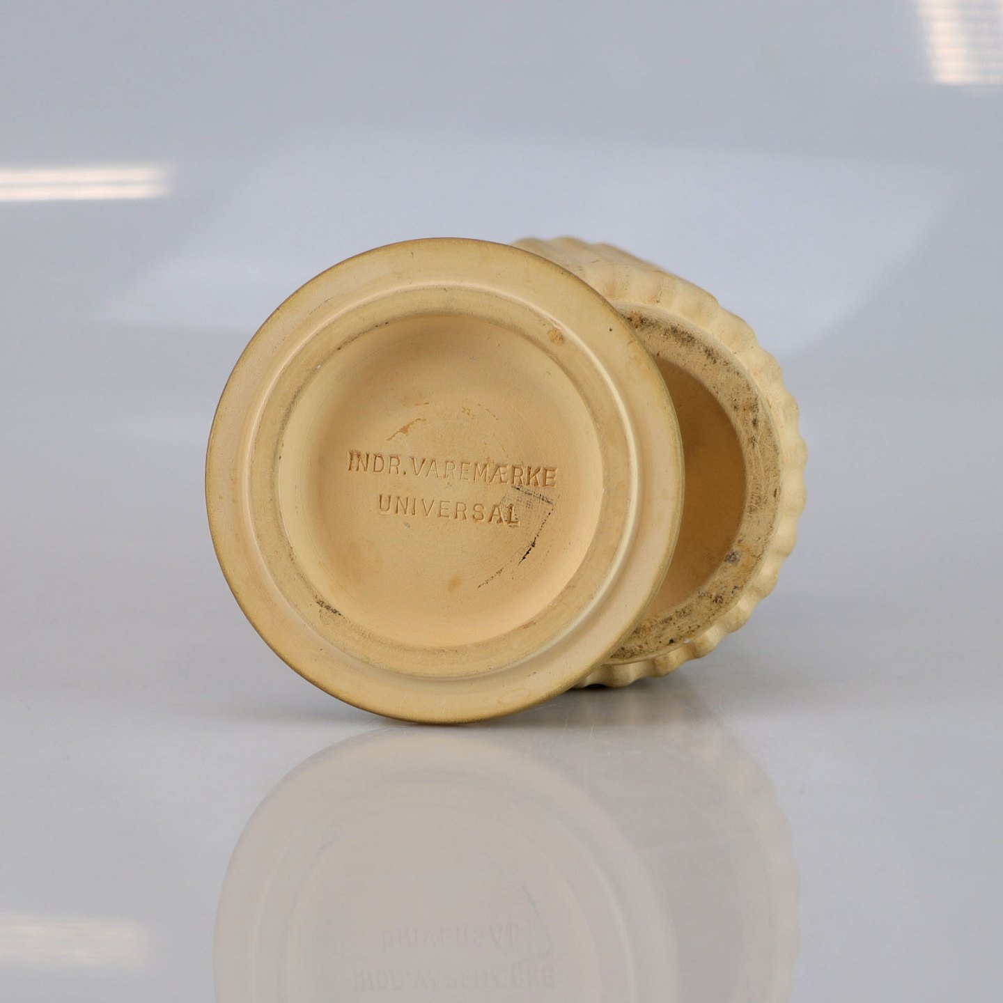 Krukke med låg i uglaseret keramik. På låget ses et hestemotiv