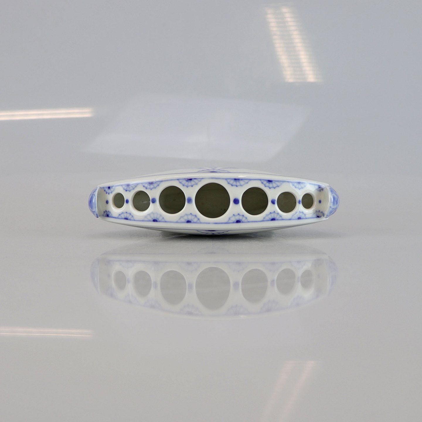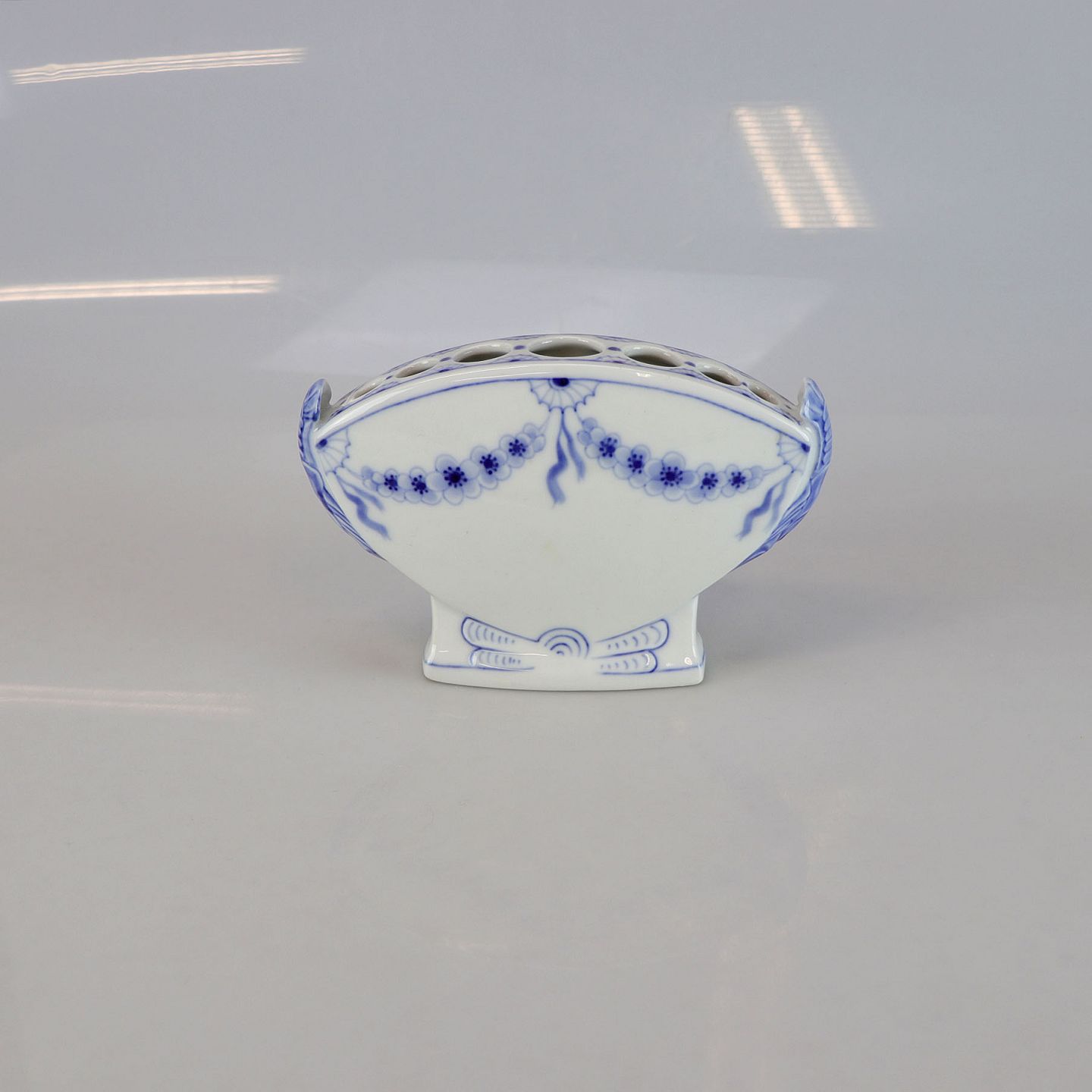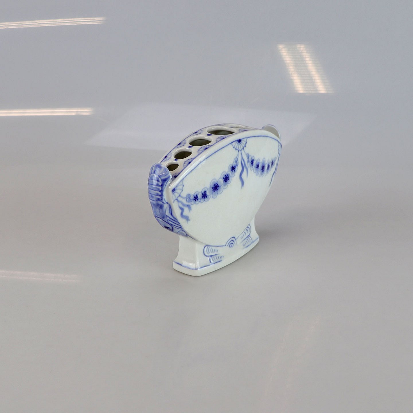 Vase i hvidt porcelæn med skelform og motiv af guirlander med blå blomster