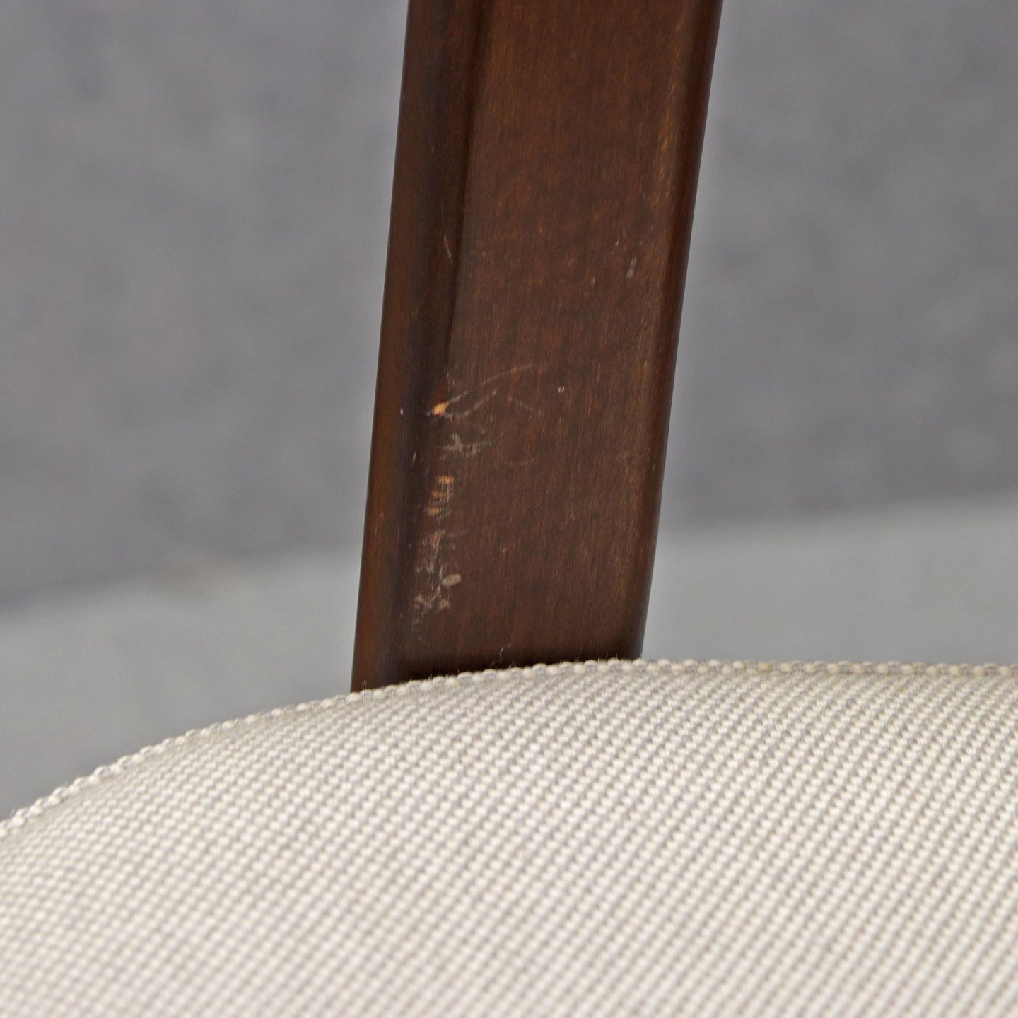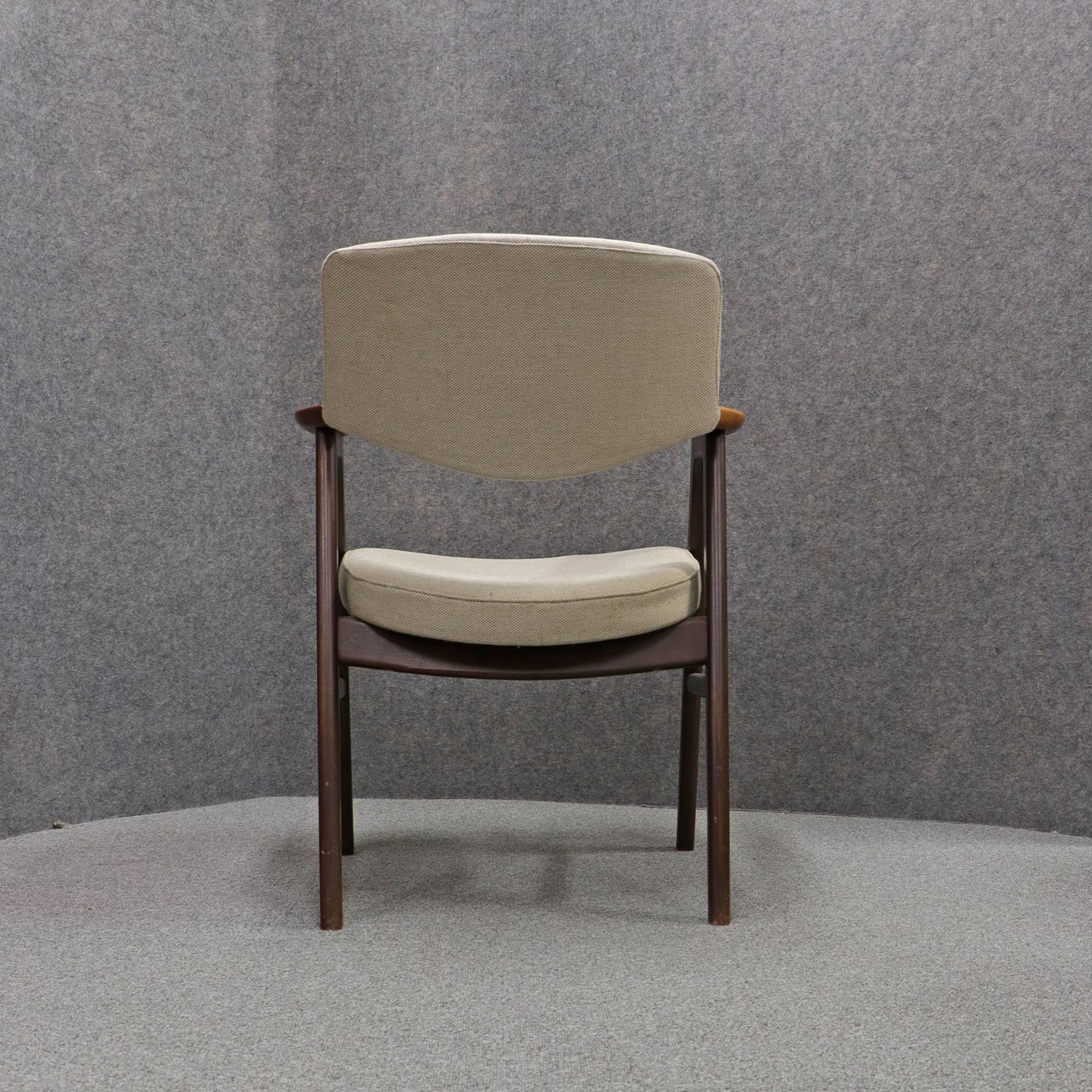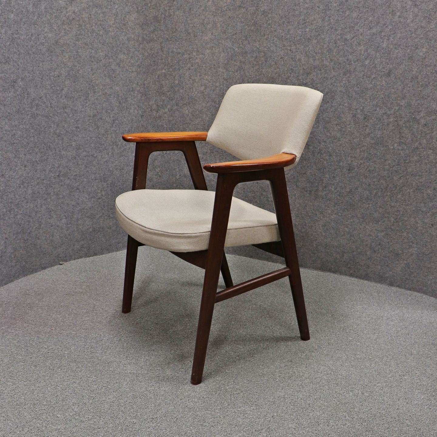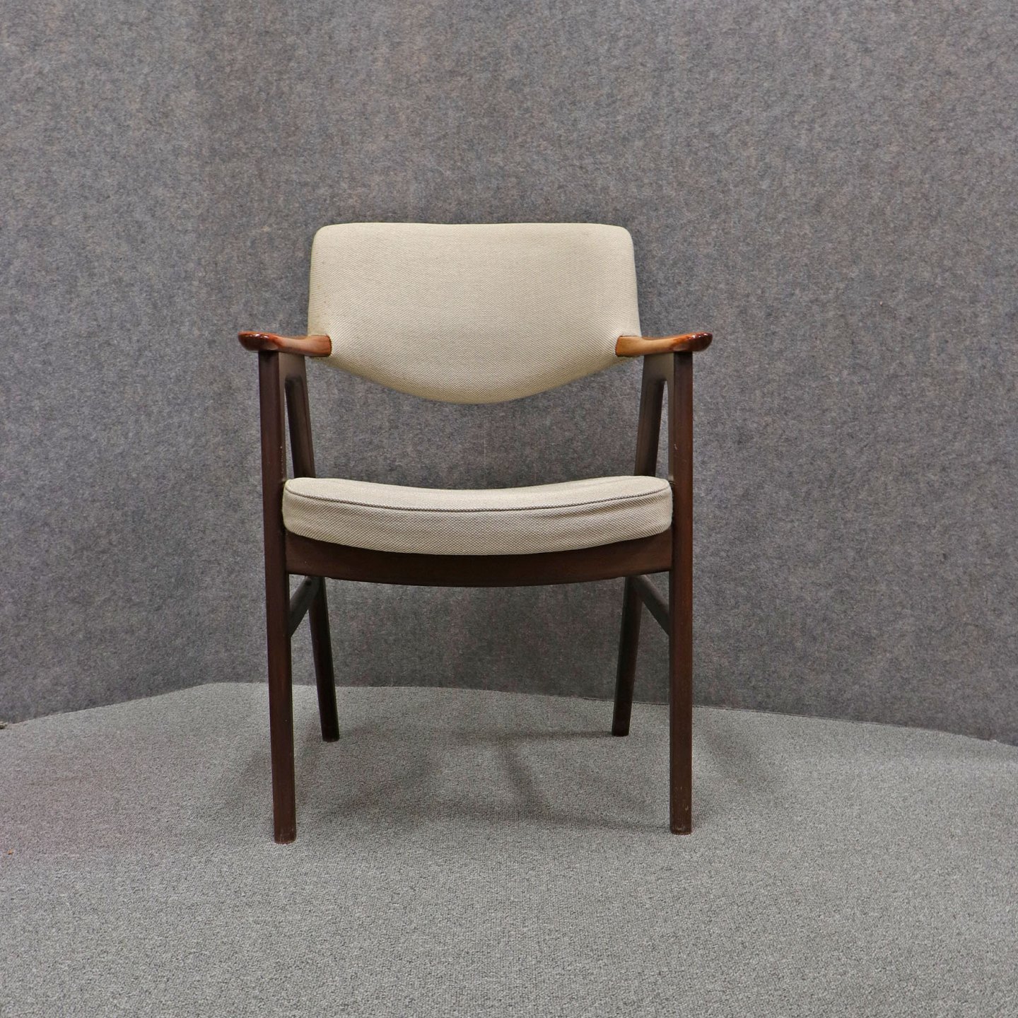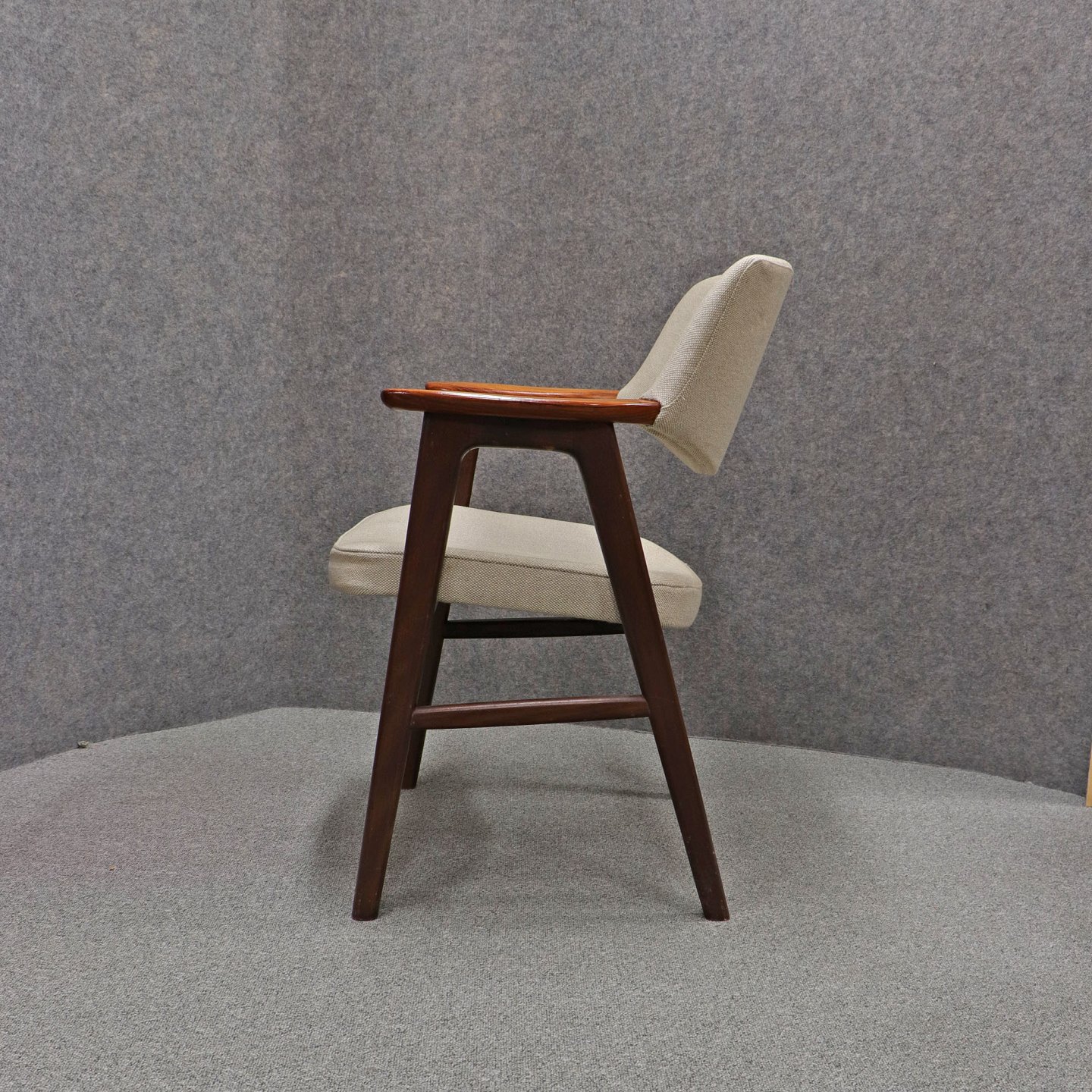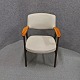 Stol med armlæn i lakeret Palisander. Sæde og ryglæn betrukket med lyst uldstof.