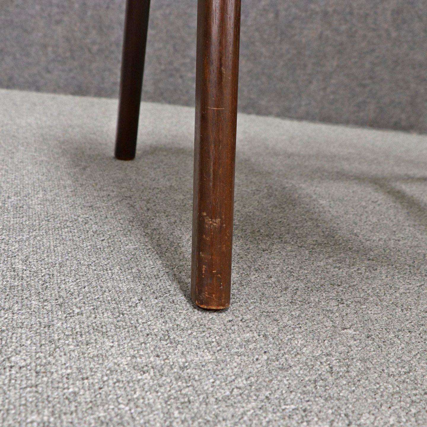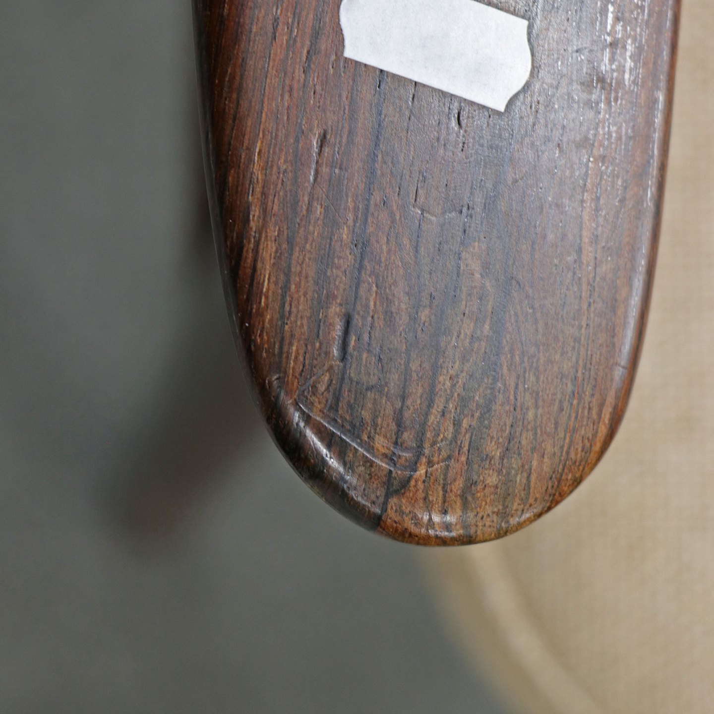 Stol med armlæn i lakeret palisander. Sæde og ryglæn betrukket med beige uldstof.