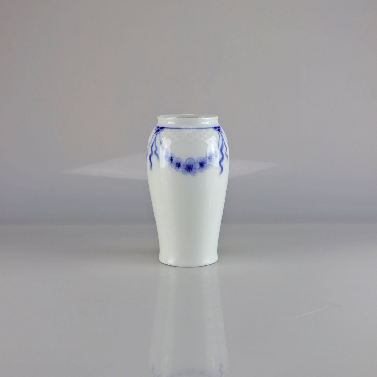 Blomstervase i hvidt porcelæn med skelform og motiv af guirlander med blå blomster