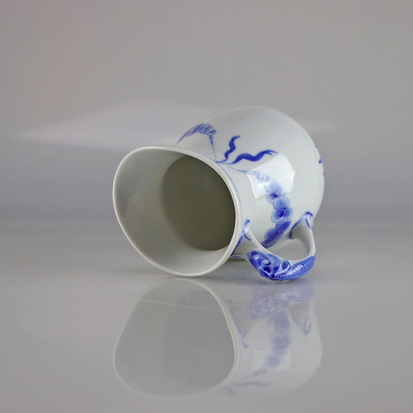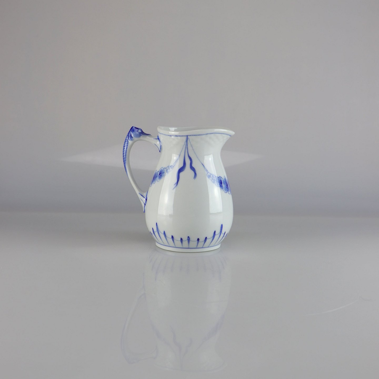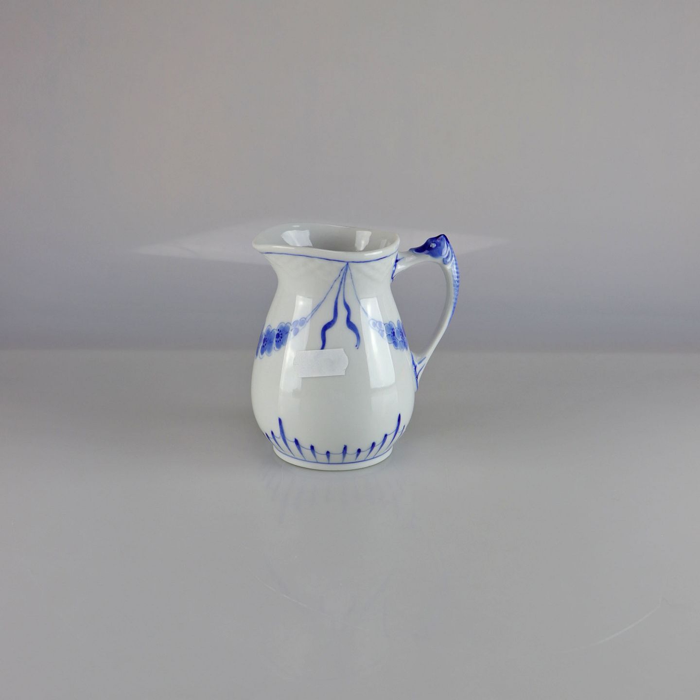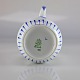 Kande i hvidt porcelæn med skelform og motiv af guirlander med blå blomster