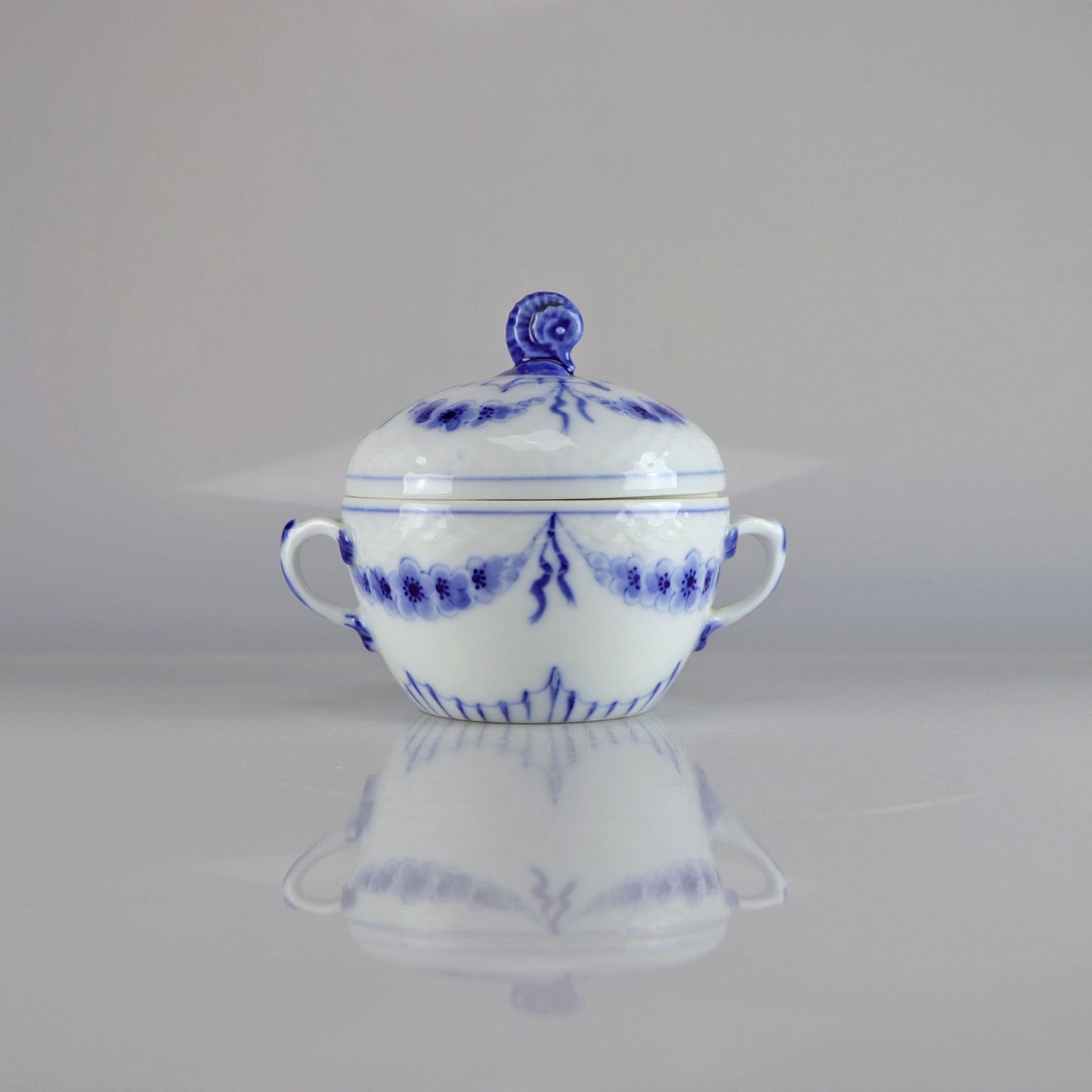 Skål med låg og hanke i hvidt porcelæn med skelform og motiv af guirlander med blå blomster samt blå søhest