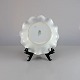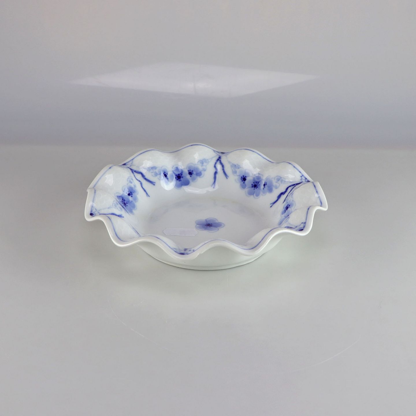 Skål i hvidt porcelæn med skelform og motiv af guirlander med blå blomster