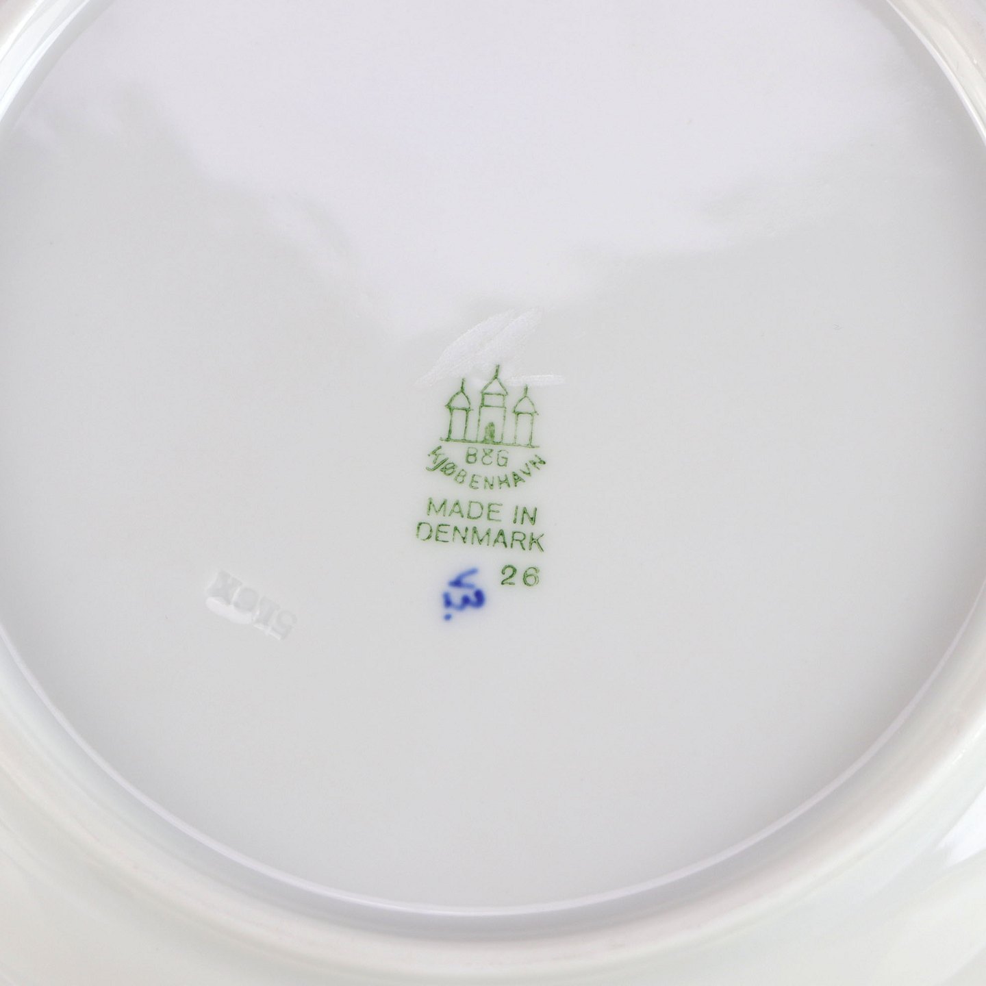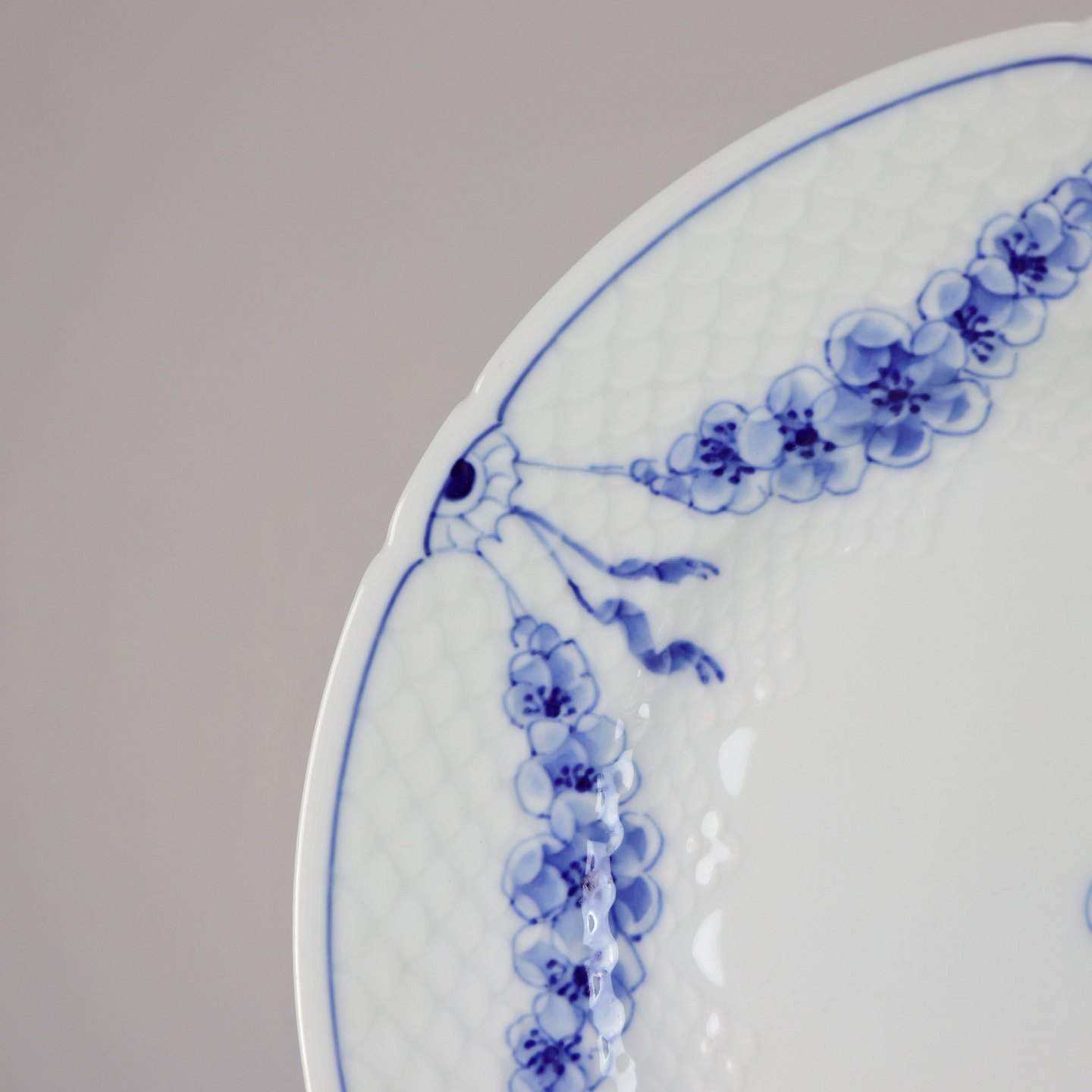 Spisetallerken i hvidt porcelæn med skelform og motiv af guirlander med blå blomster