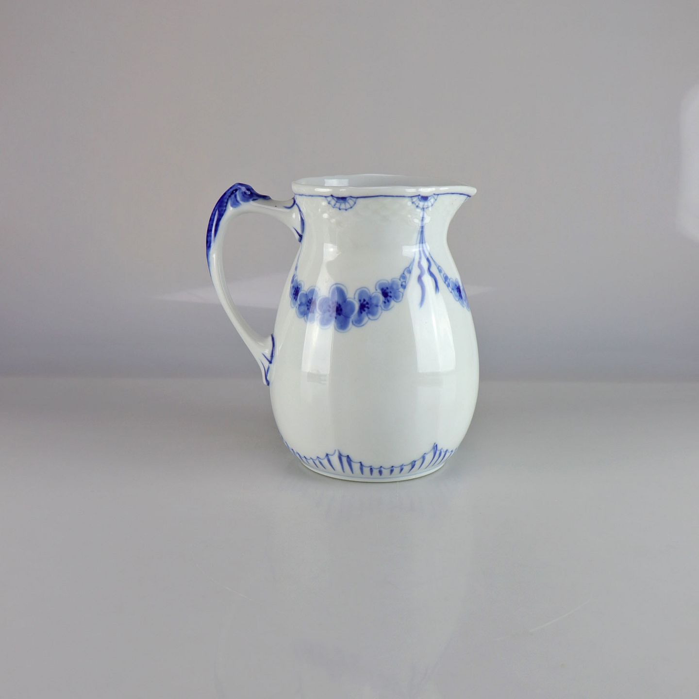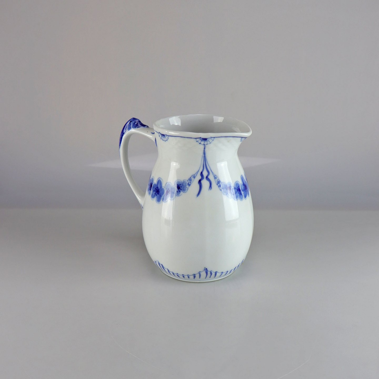 Kande i hvidt porcelæn med skelform og motiv af guirlander med blå blomster