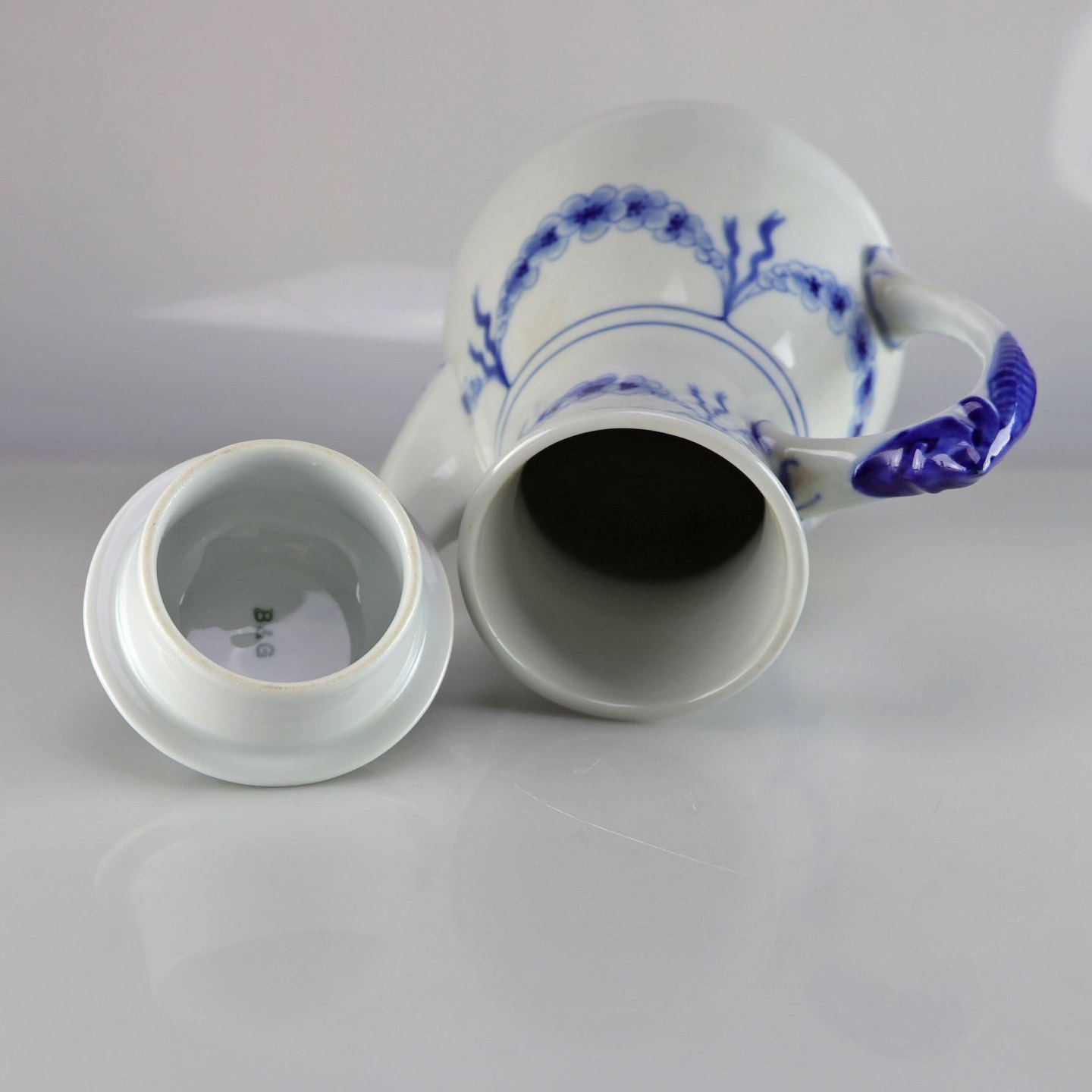 Kande i hvidt porcelæn med skelform og motiv af guirlander med blå blomster