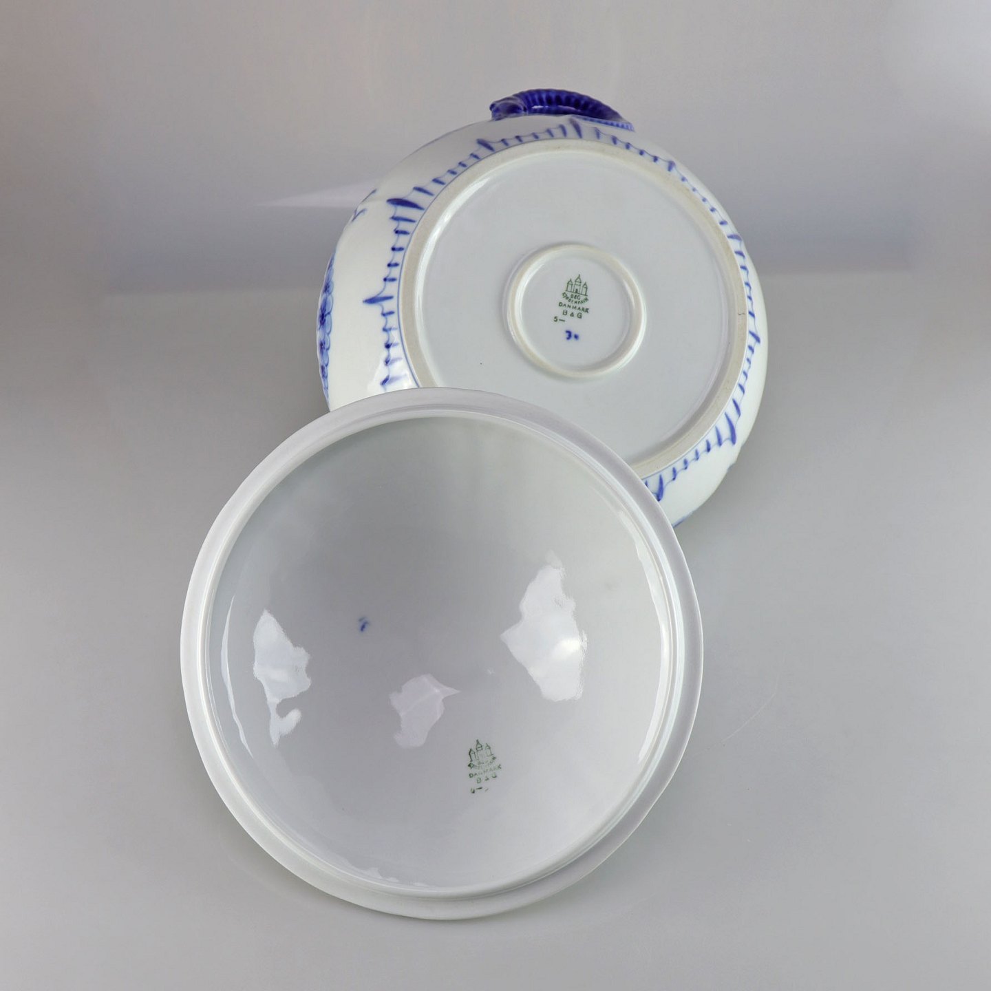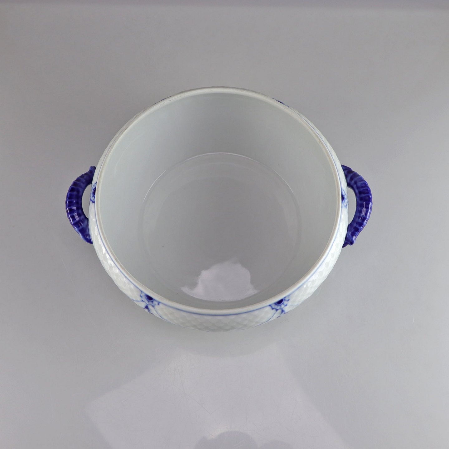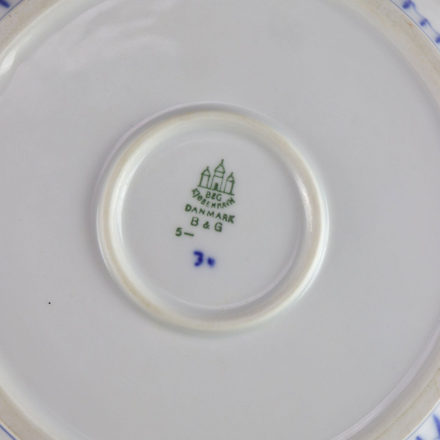 Lågfad i hvidt porcelæn med skelform og motiv af guirlander med blå blomster