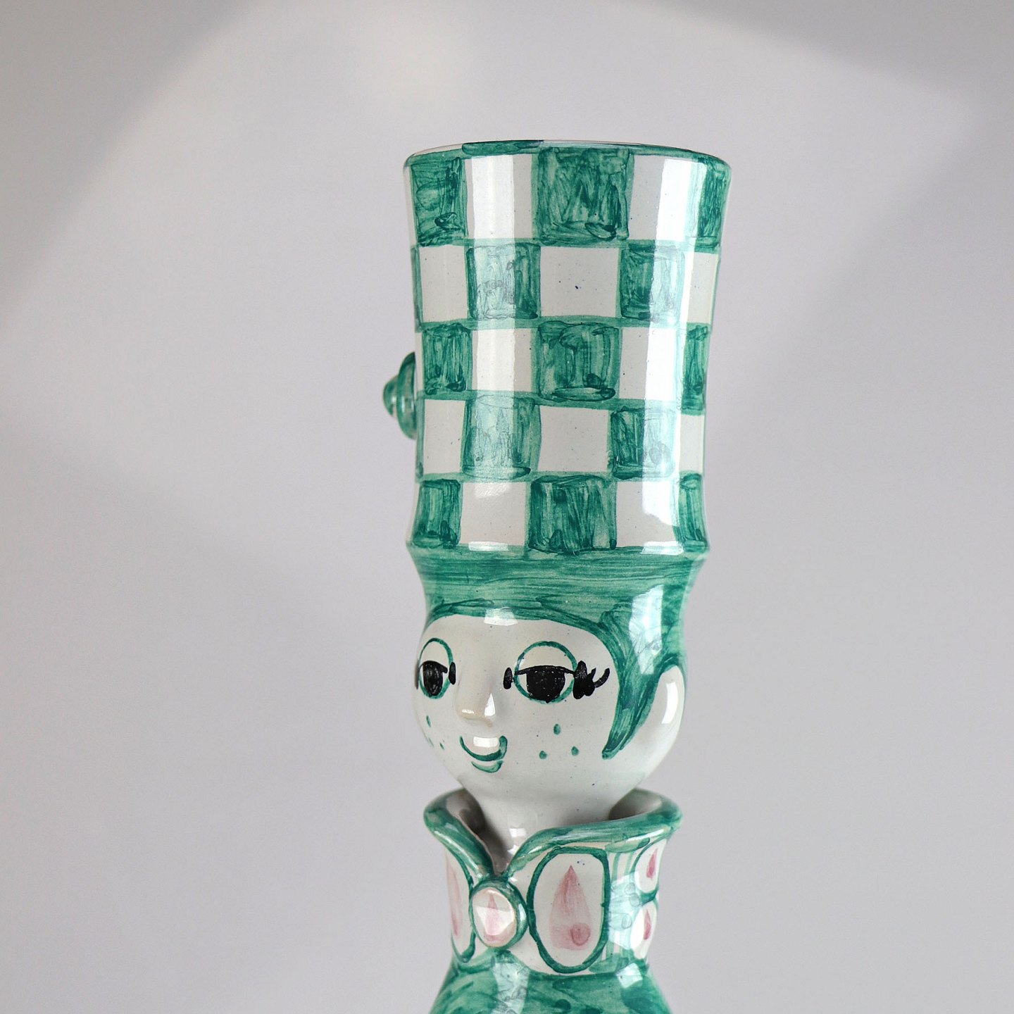 Glaseret keramik med motiv af kvinde med hund og skøjter i grøn dekoration