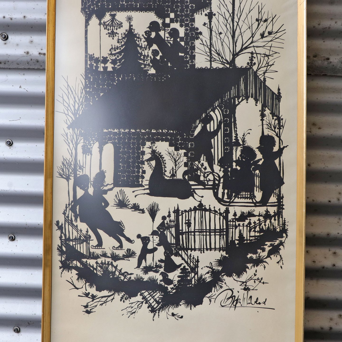 Indrammet litografi i sort med hvid baggrund.