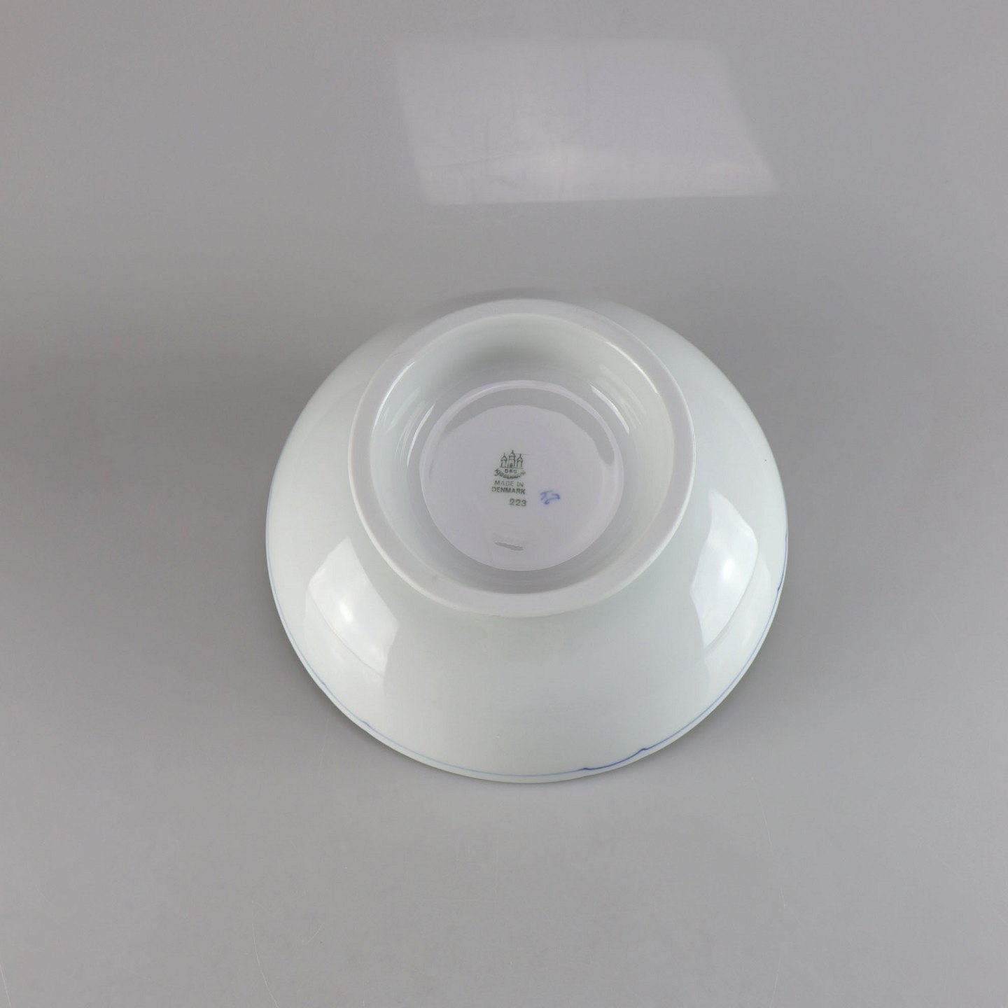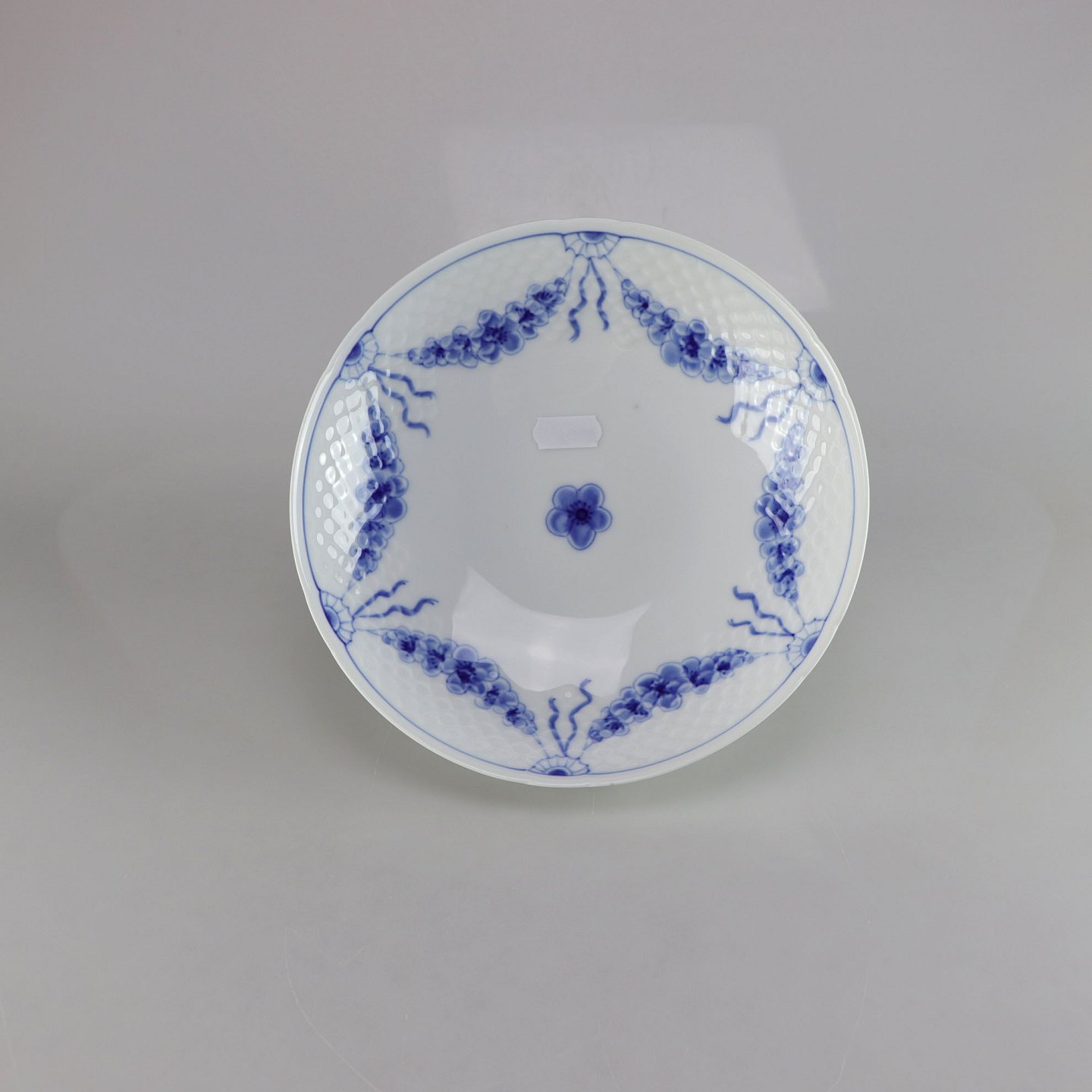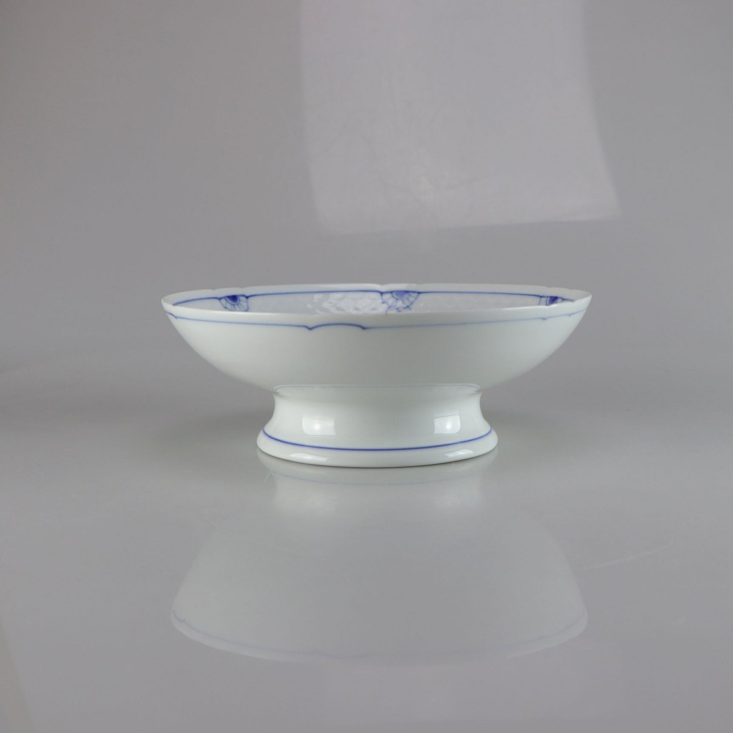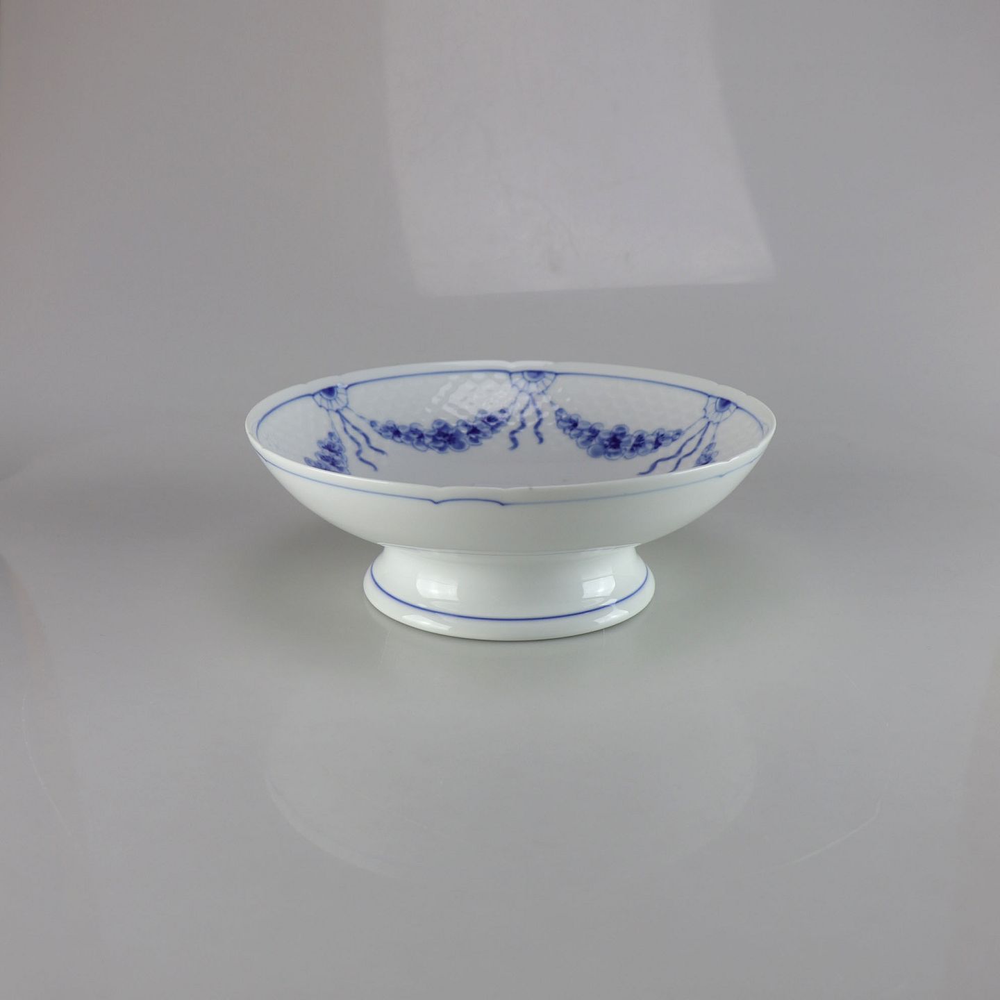 Fad i hvidt porcelæn med skelform og motiv af guirlander med blå blomster