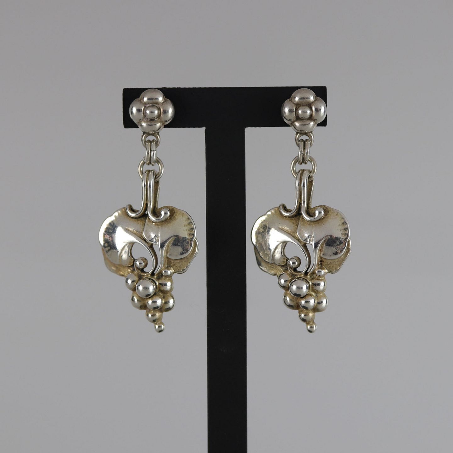 Øreringe i sølv med motiv af drueklase og blade