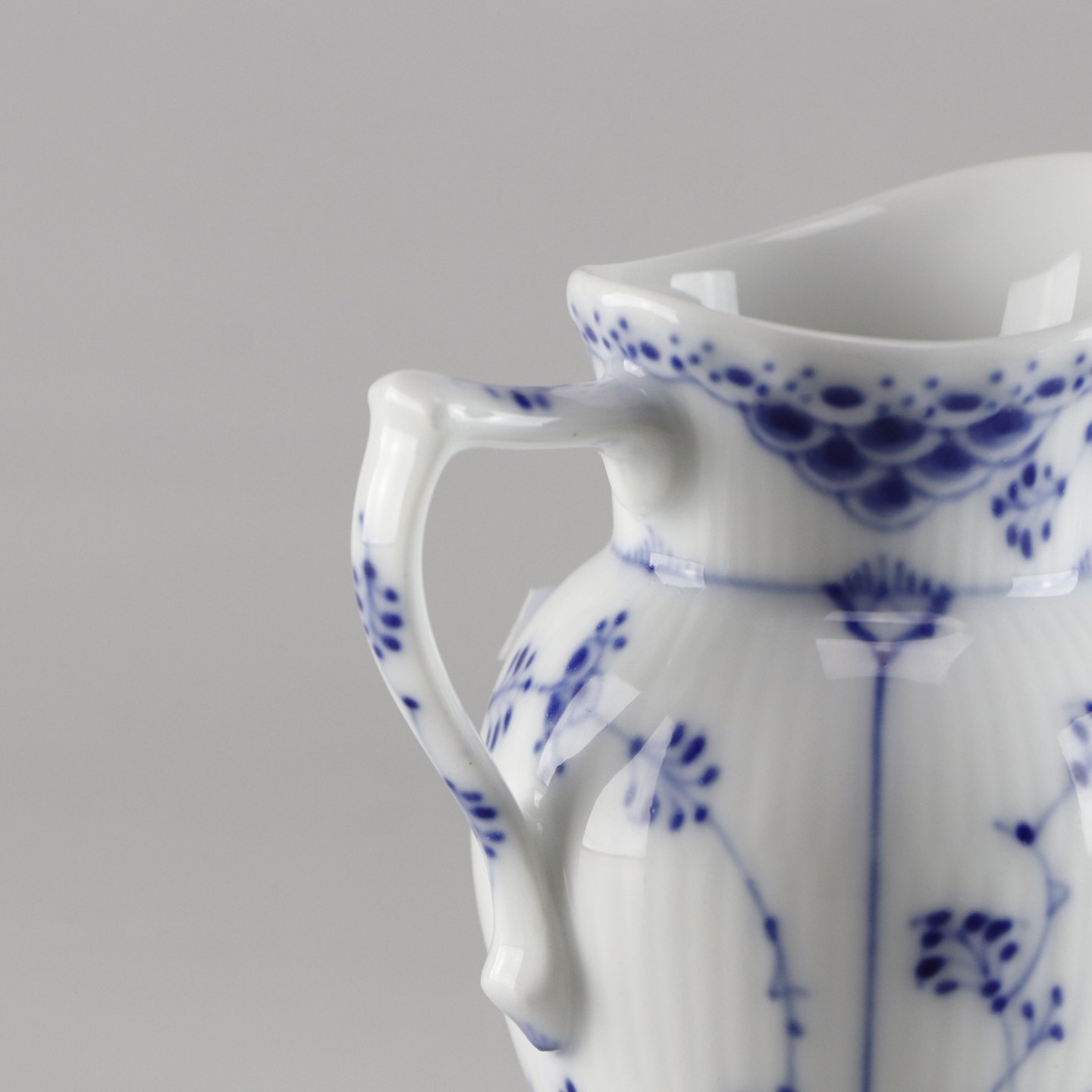 Riflet hvidt porcelæn med dekoration af blå ranker