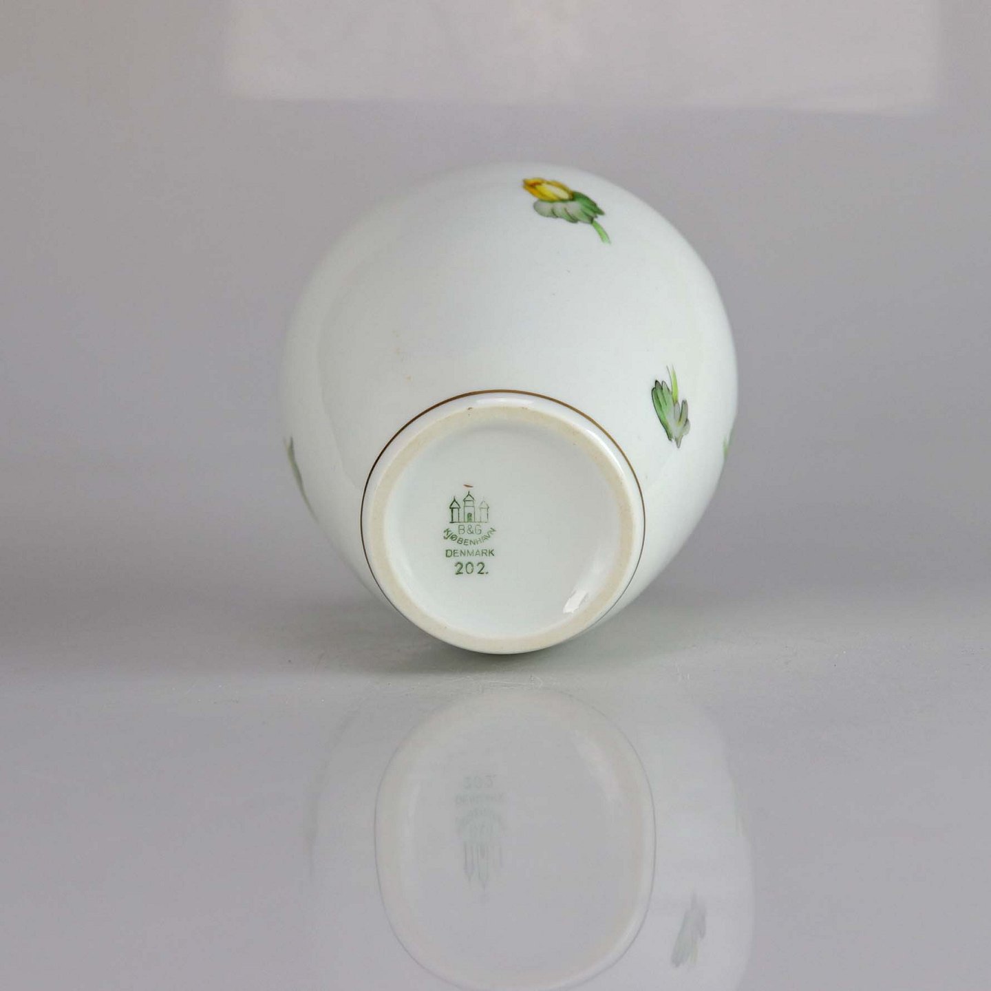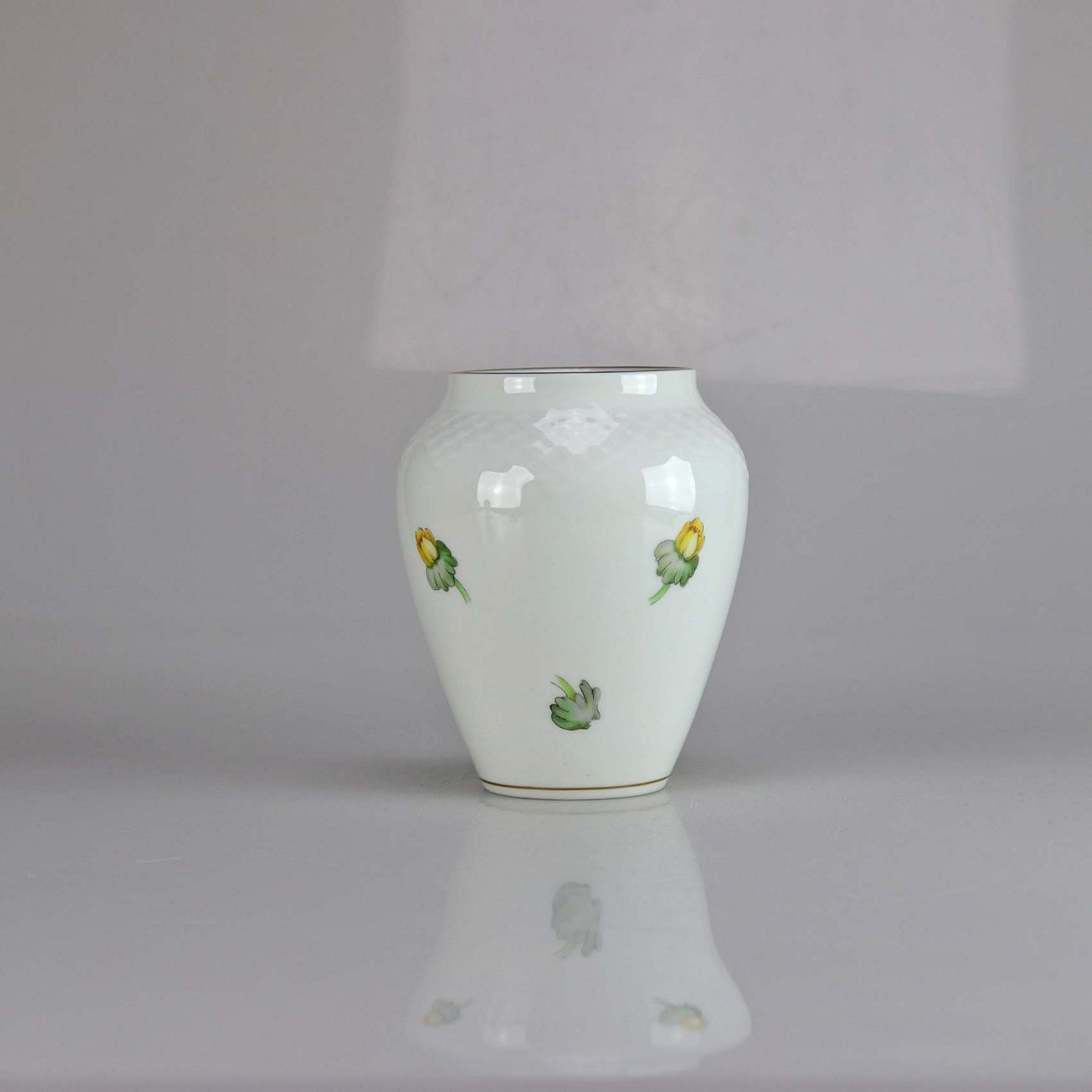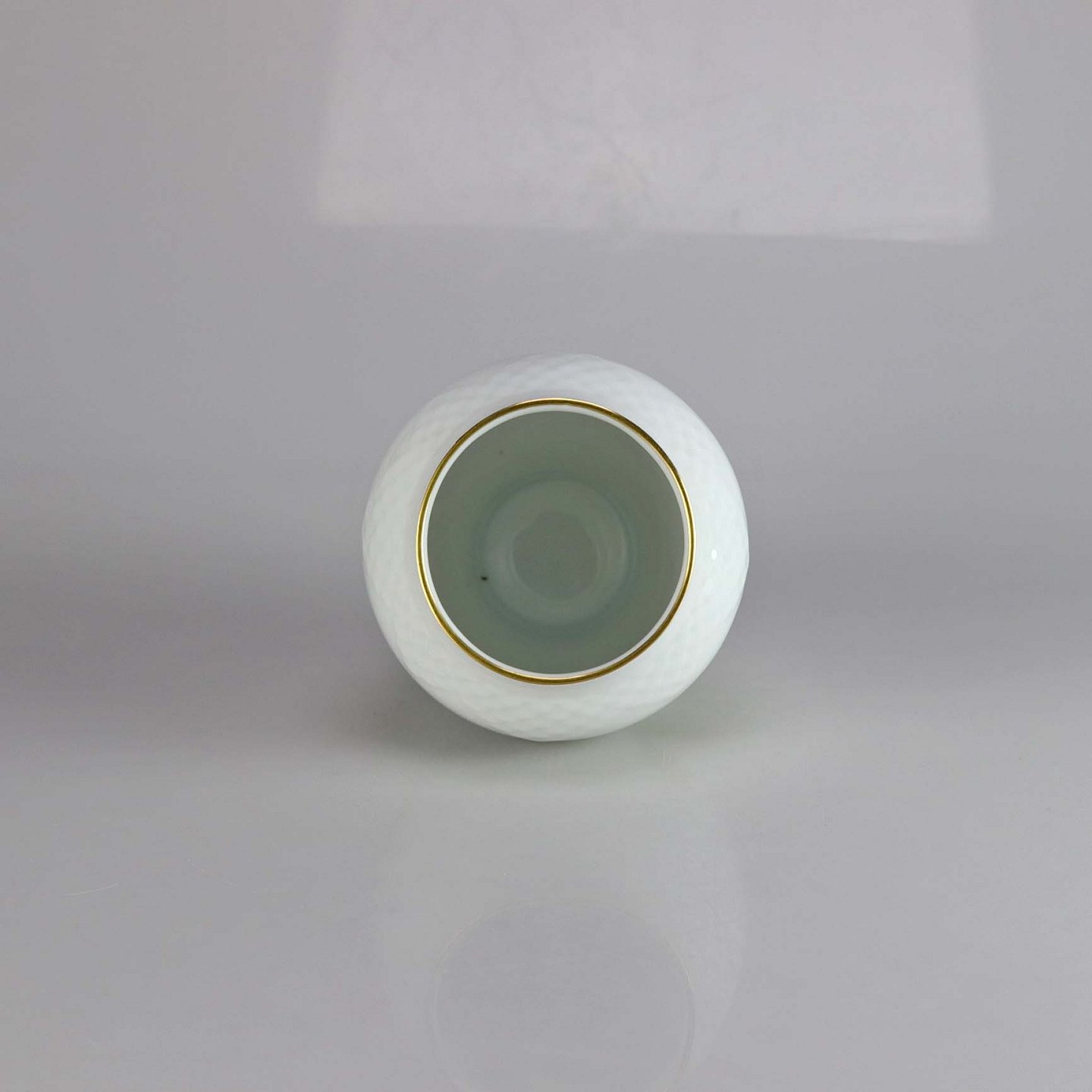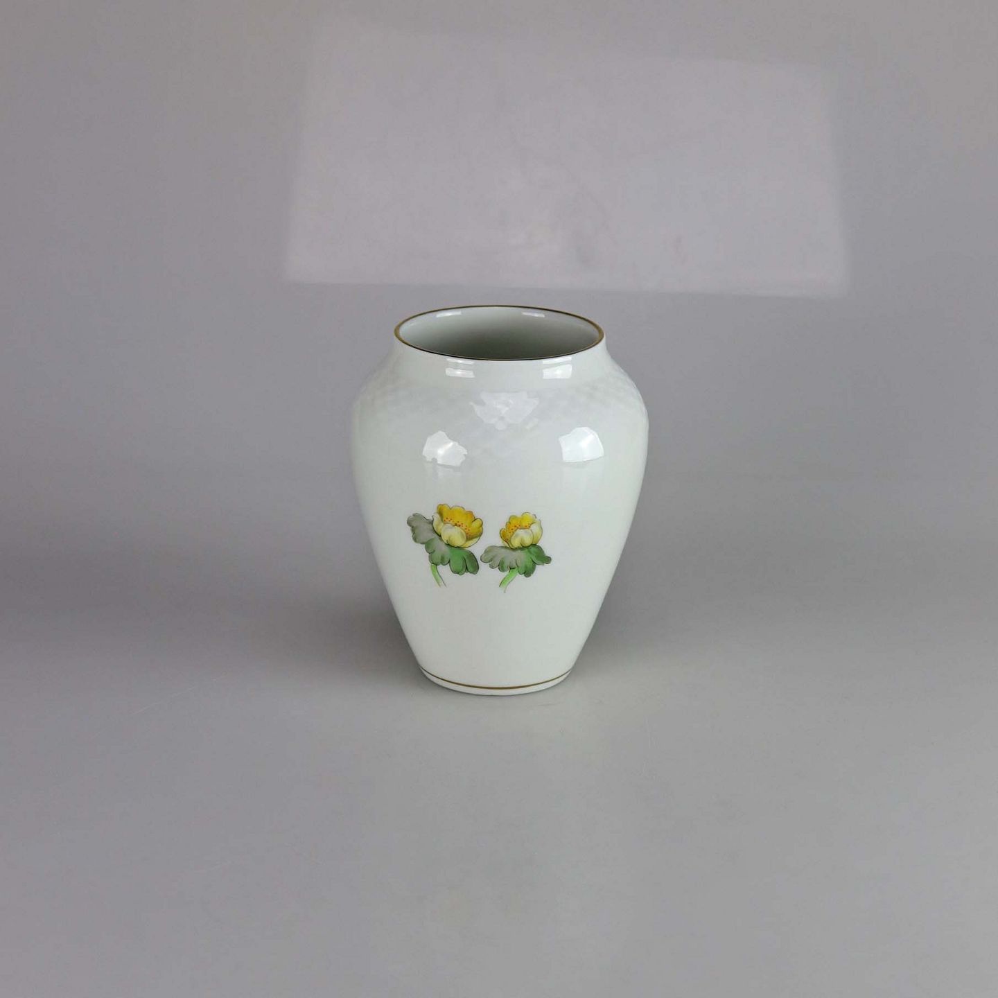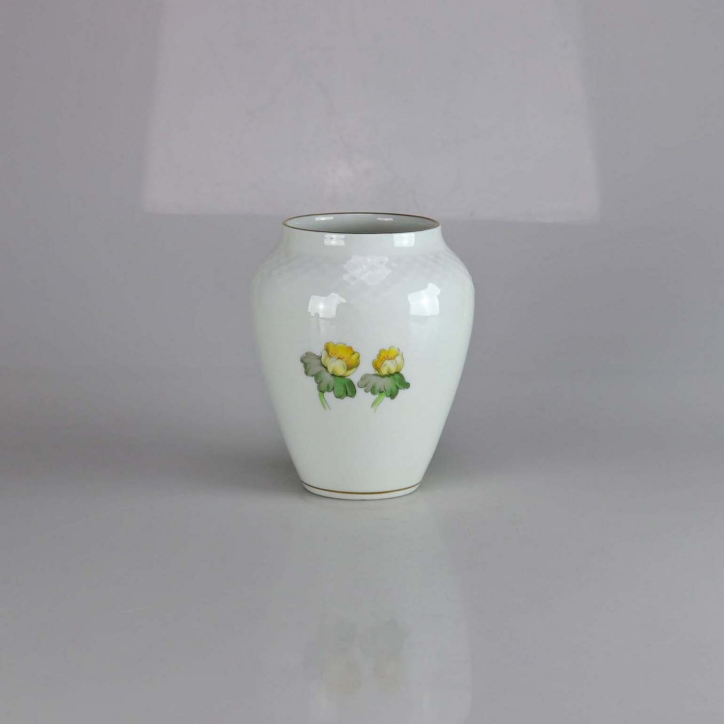 Hvidt porcelæn i skelform med dekoration af gule blomster og guldkant