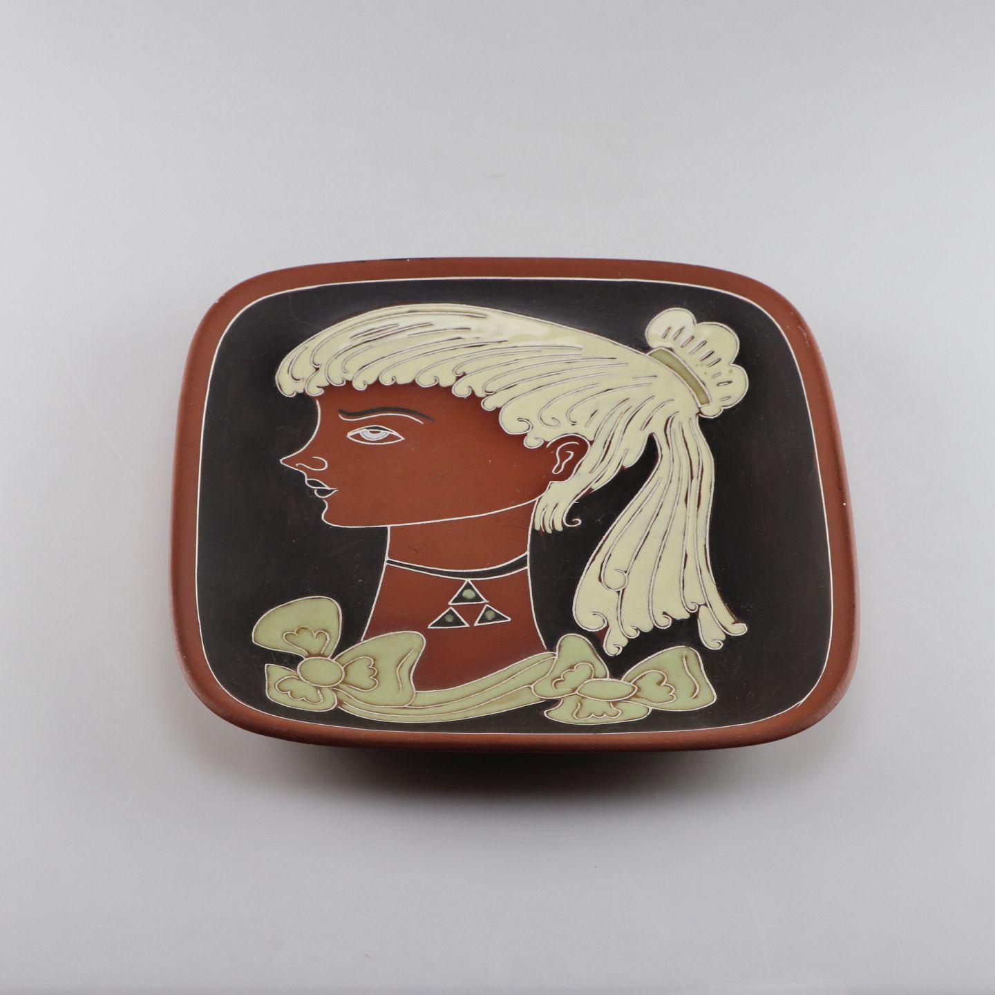 Keramiktallerken med farvet motiv af pige med langt hår, sløjfer og halskæde